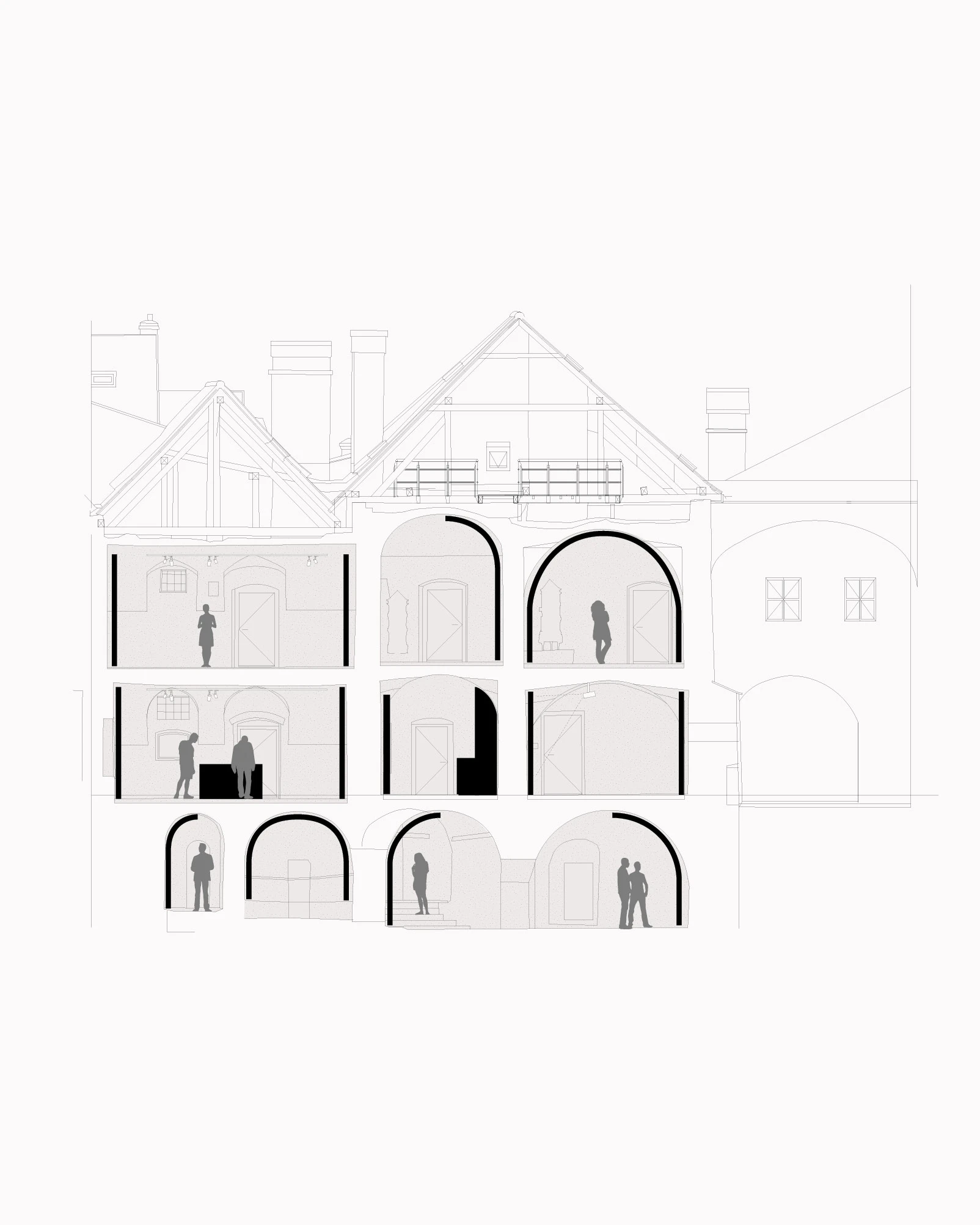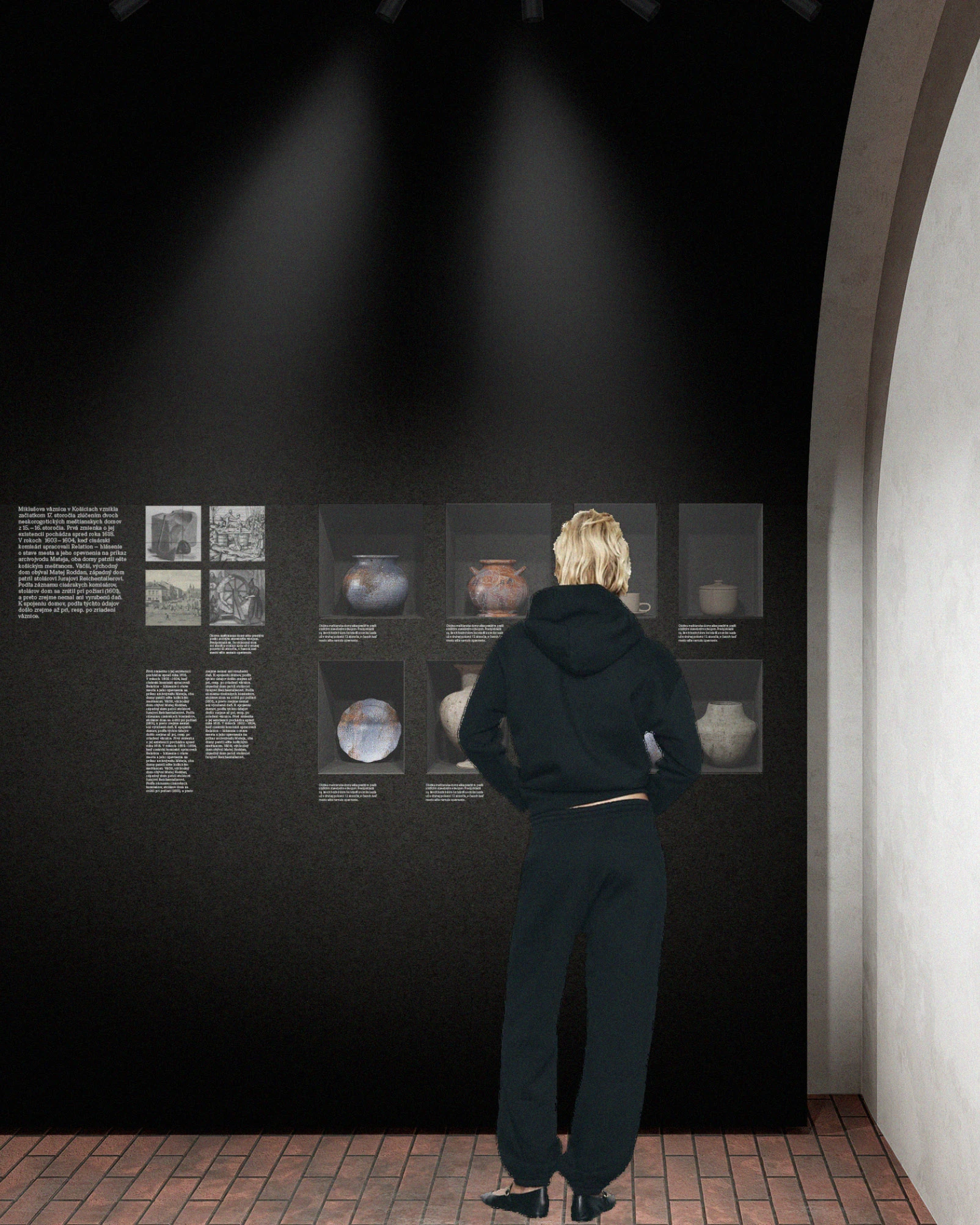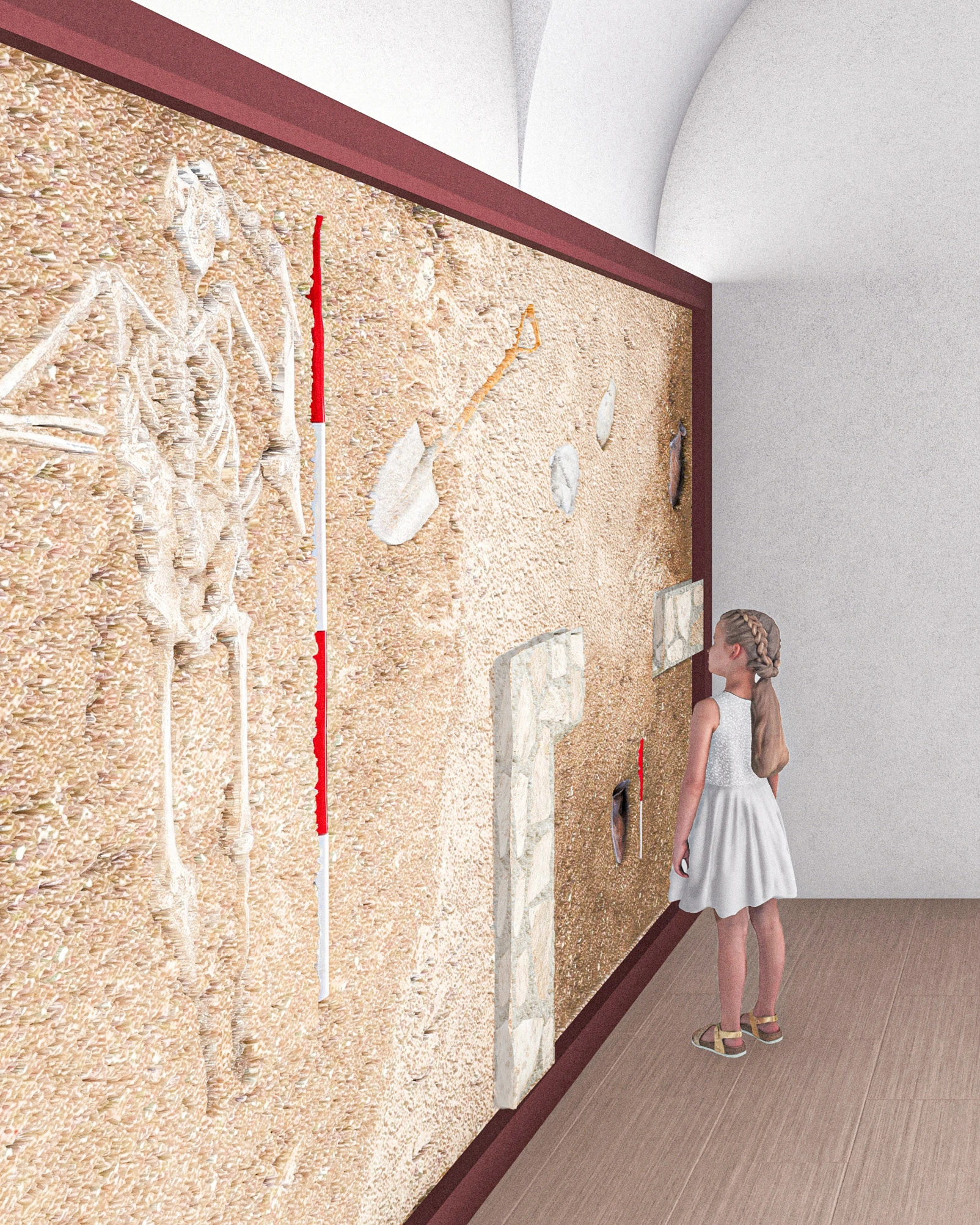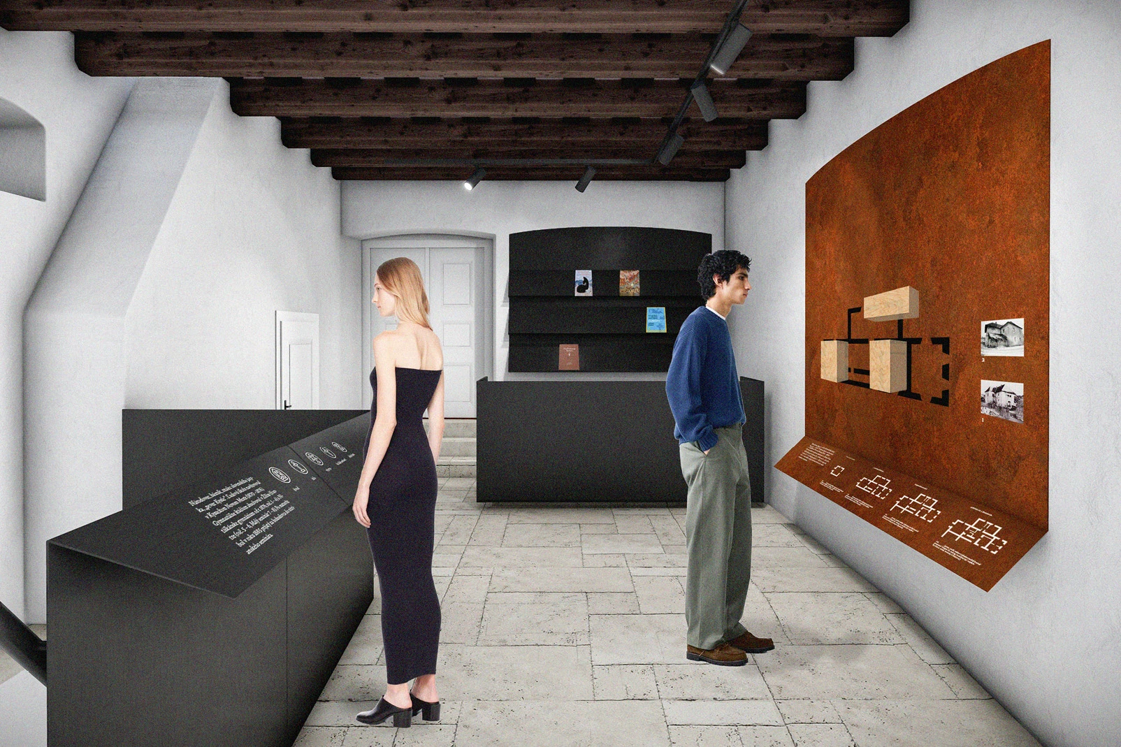 Architektonický návrh výstavy prináša priestor ako archeologickú vrstvu – vyrývané niky, výklenky a portály evokujúce archeologické jamy, postupne odhaľujúce exponáty. Monochromatická červenohnedá farba pripomína pôdu a tvorí tlmené pozadie pre kontemplatívny zážitok. Modulárny systém vitrín a výstavných panelov kopíruje oblúkové tvaroslovie miestností, pričom integrované otvárateľné vitríny s prachotesným tesnením umožňujú ochranu objektov a ich jednoduchú výmenu. Otvorené priehľady v priestore navodzujú kontinuálne odhaľovanie a zvedavosť, zatiaľ čo štruktúrované grafické panely regulujú svetlo a zachovávajú pôvodné vykurovanie. Organicky tak vzniká harmonický súlad historickej štruktúry a modernej expozičnej techniky.