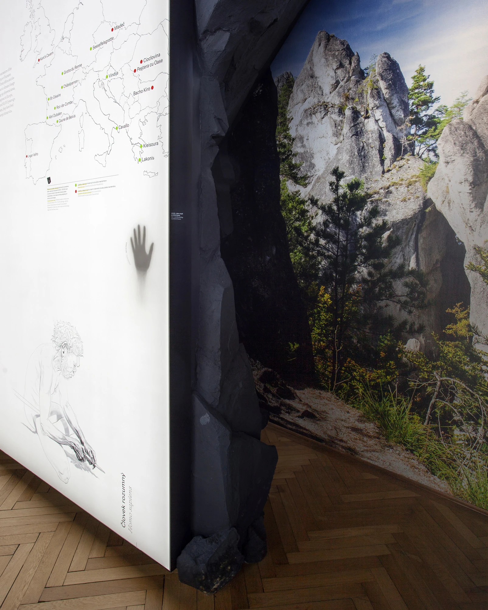 Výtvarno-priestorové riešenie expozície vychádza z interpretácie jaskyne. V zmysle antropologickom je jaskyňa náleziskom artefaktov. V zmysle filozofickom je miestom, kde zaniká priestor a čas. Autori sa v expozícii pohrávajú s metaforami objavovania, tieňa a kontrastov. Dramaturgia expozície je definovaná centrálnymi objektami. Po obvode miestnosti sa nachádzajú veľkoformátové svetelné panely s integrovanými monitormi, ktoré umožňujú prezentáciu rozsiahleho grafického obsahu. Ten zahŕňa autorské vedecké ilustrácie, graficky spracované časové osi a grafy, či neštandardnú prácu s typografiou, ktorá sa smerom dohora proporčne zväčšuje. V “medzipriestoroch” medzi panelmi sú vnorené vitríny. Expozícia obsahuje taktiež interaktívnu líniu, ktorú divák ovláda pomocou dotyku ruky na paneloch.