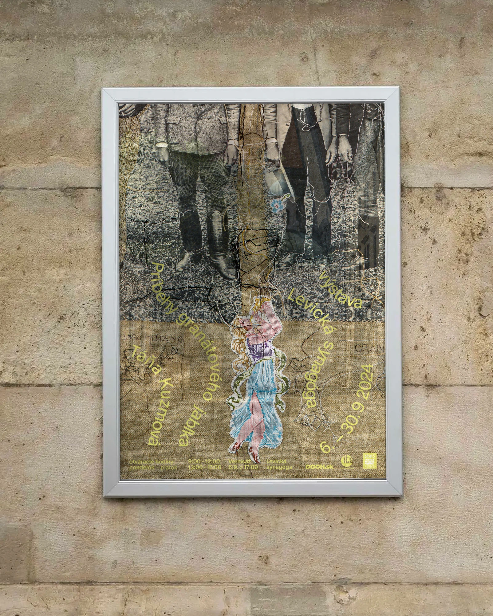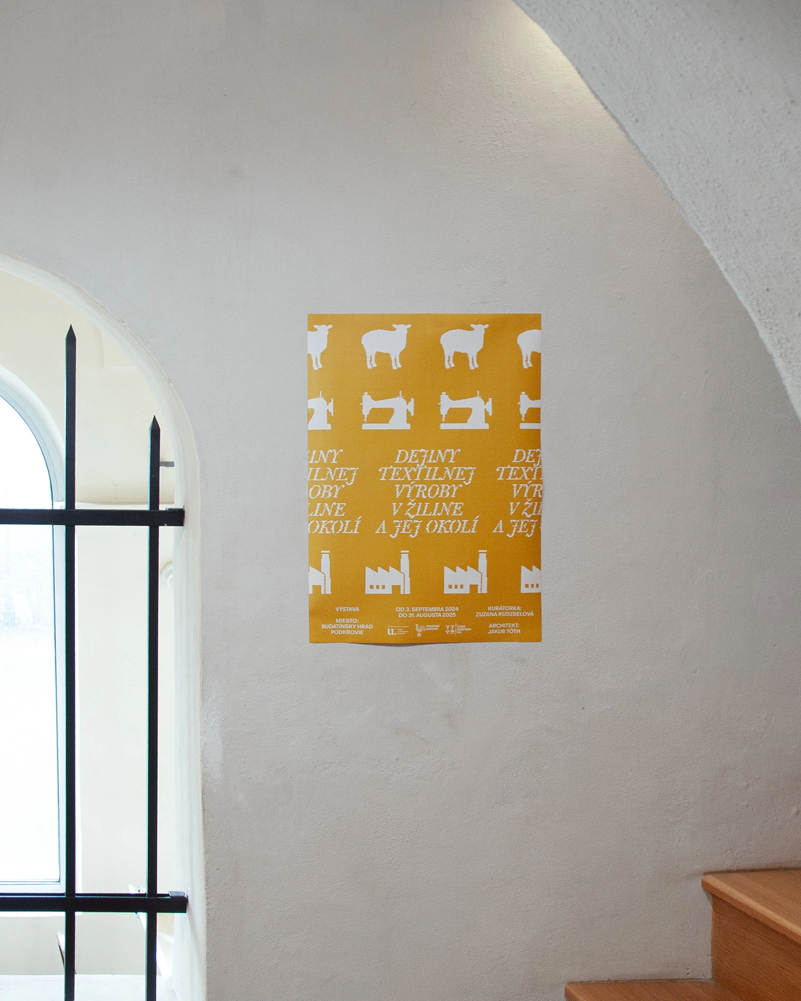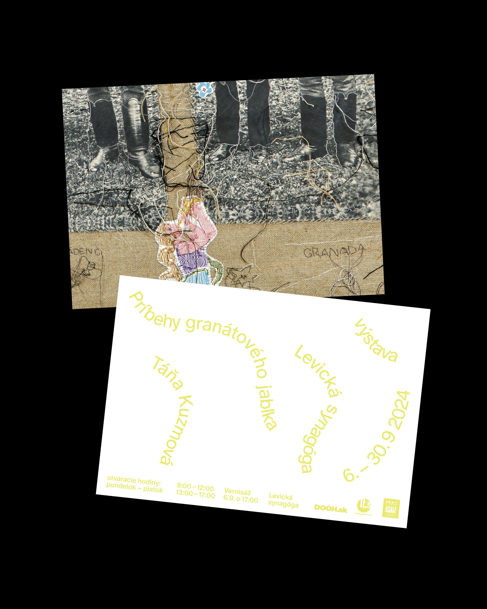 Vizuál výstavy pracuje s typografiou, ktorá imituje pohyb nite – voľne sa vinie priestorom a reaguje na tkanú a prešívanú podstatu vystavených diel. Organická kompozícia písma zároveň nadväzuje na jemnosť textilu a silný osobný príbeh ukrytý vo fotografiách.
