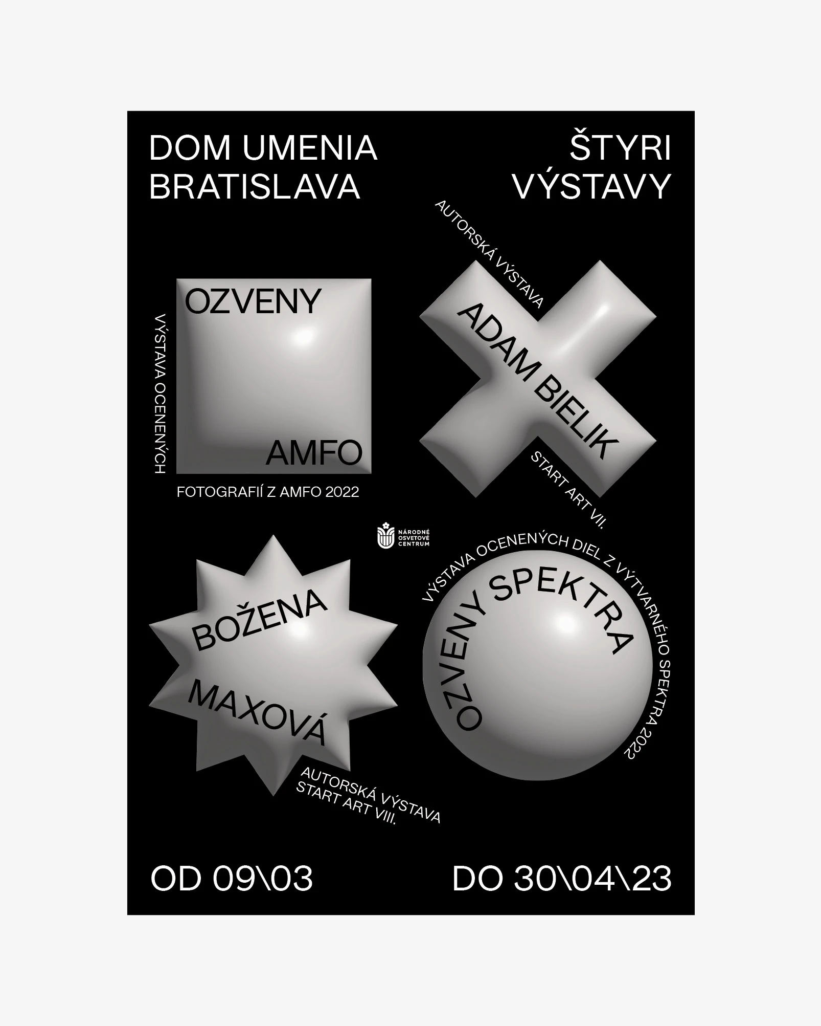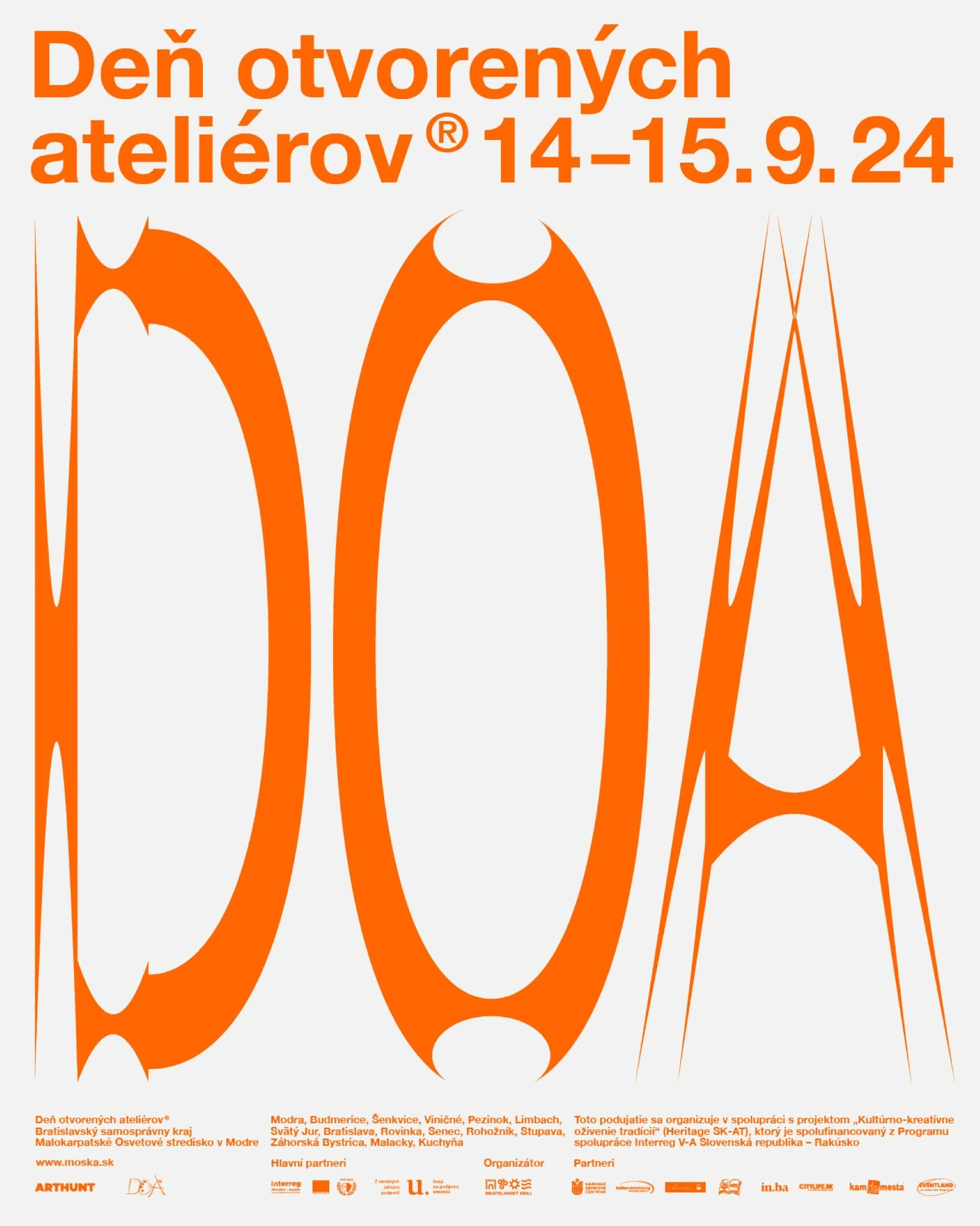 Vizuálna identita Dňa otvorených ateliérov je postavená na variabilnom typografickom systéme založenom na skratke DOA. Modulárne písmo umožňuje široké morfologické transformácie, čím každý plagát nadobúda jedinečný výraz. Typografia sa stáva nositeľom významu aj nálady – komunikuje rôznorodosť, otvorenosť a experimentálny charakter umeleckej scény. Jednofarebné riešenie zjednocuje sériu a vytvára silnú vizuálnu kontinuitu v mestskom prostredí.