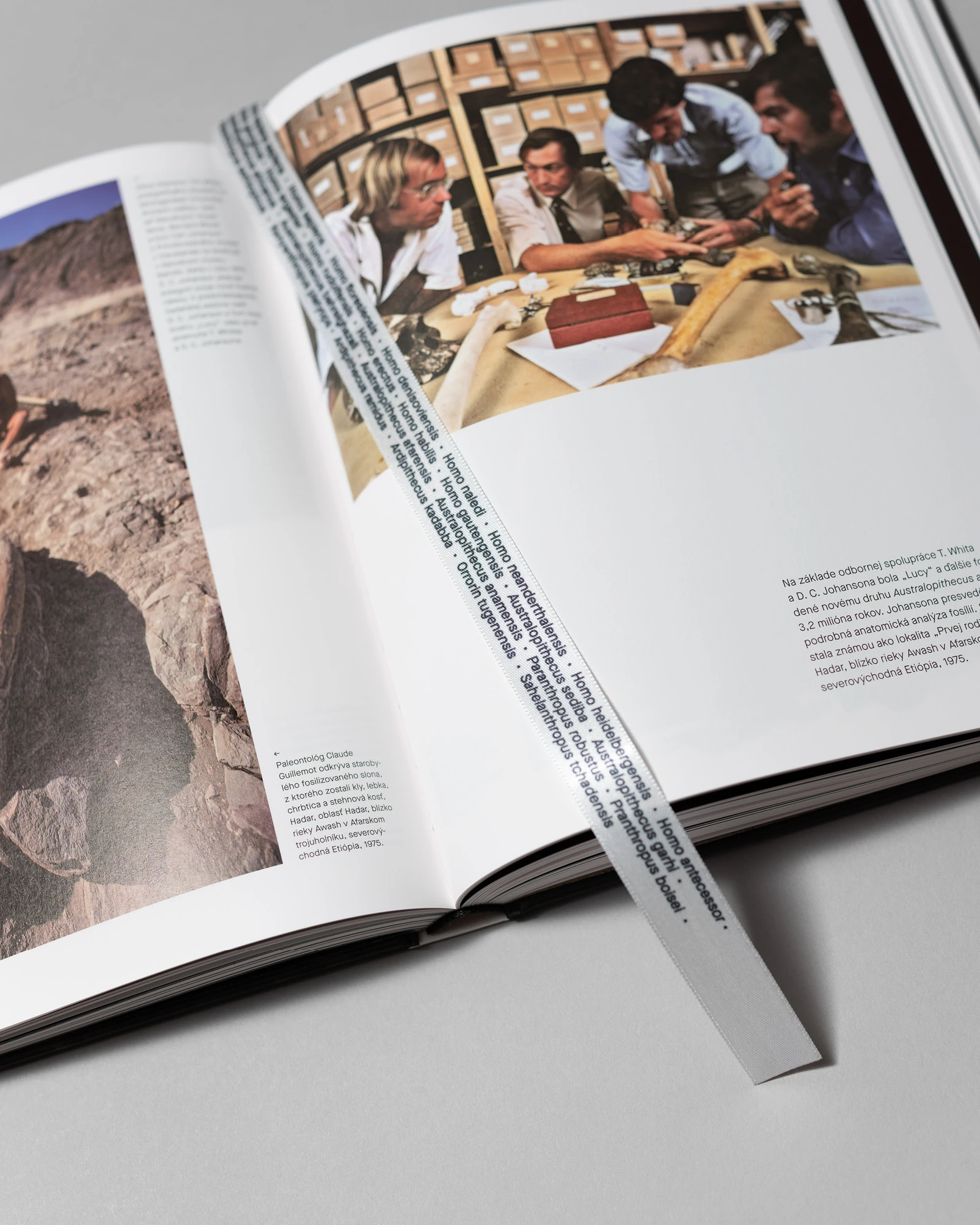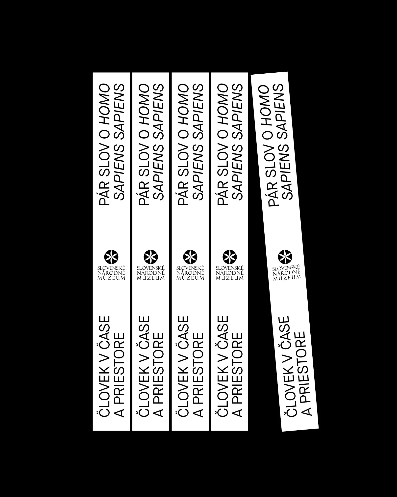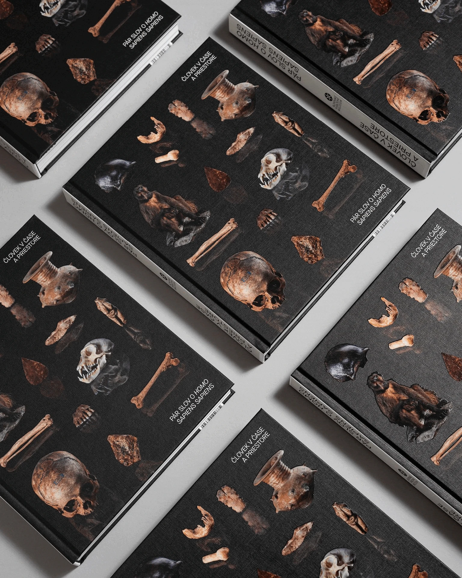 Dizajn publikácie k expozící Človek v čase a priestore. Publikácia vizuálne nadväzuje na expozíciu kontrastom bielych a čiernych plôch, pričom svietiaca obálka a vzdušný layout podporujú jej súčasný charakter.