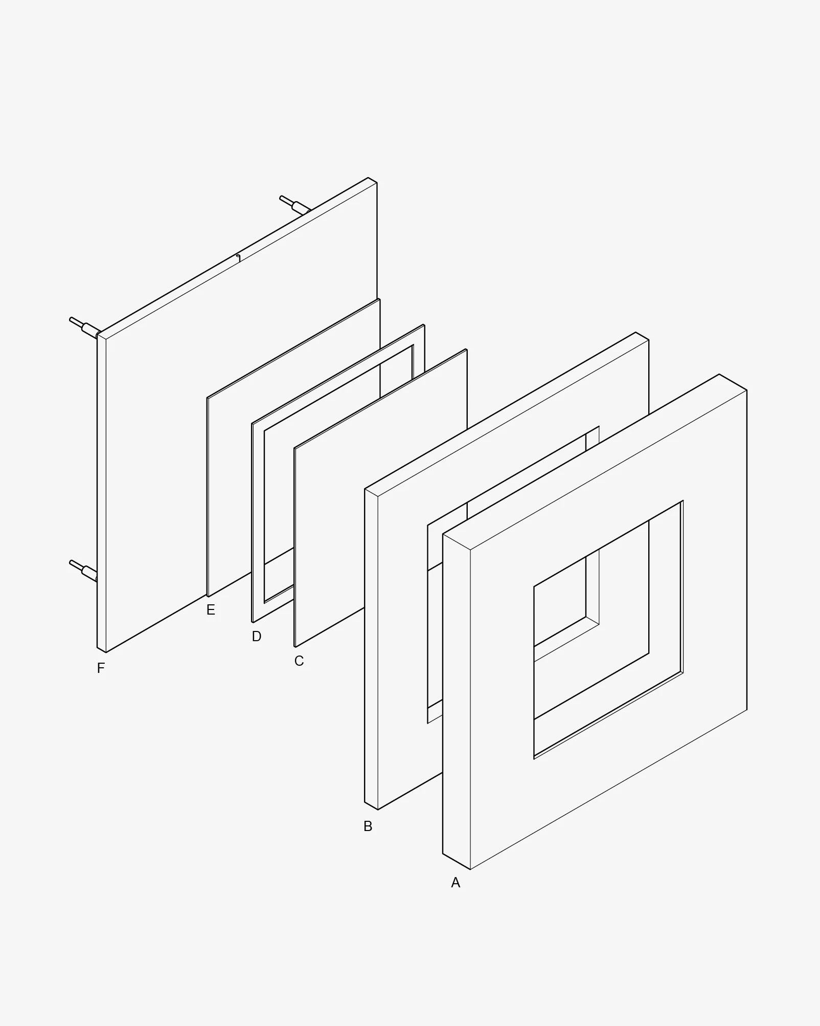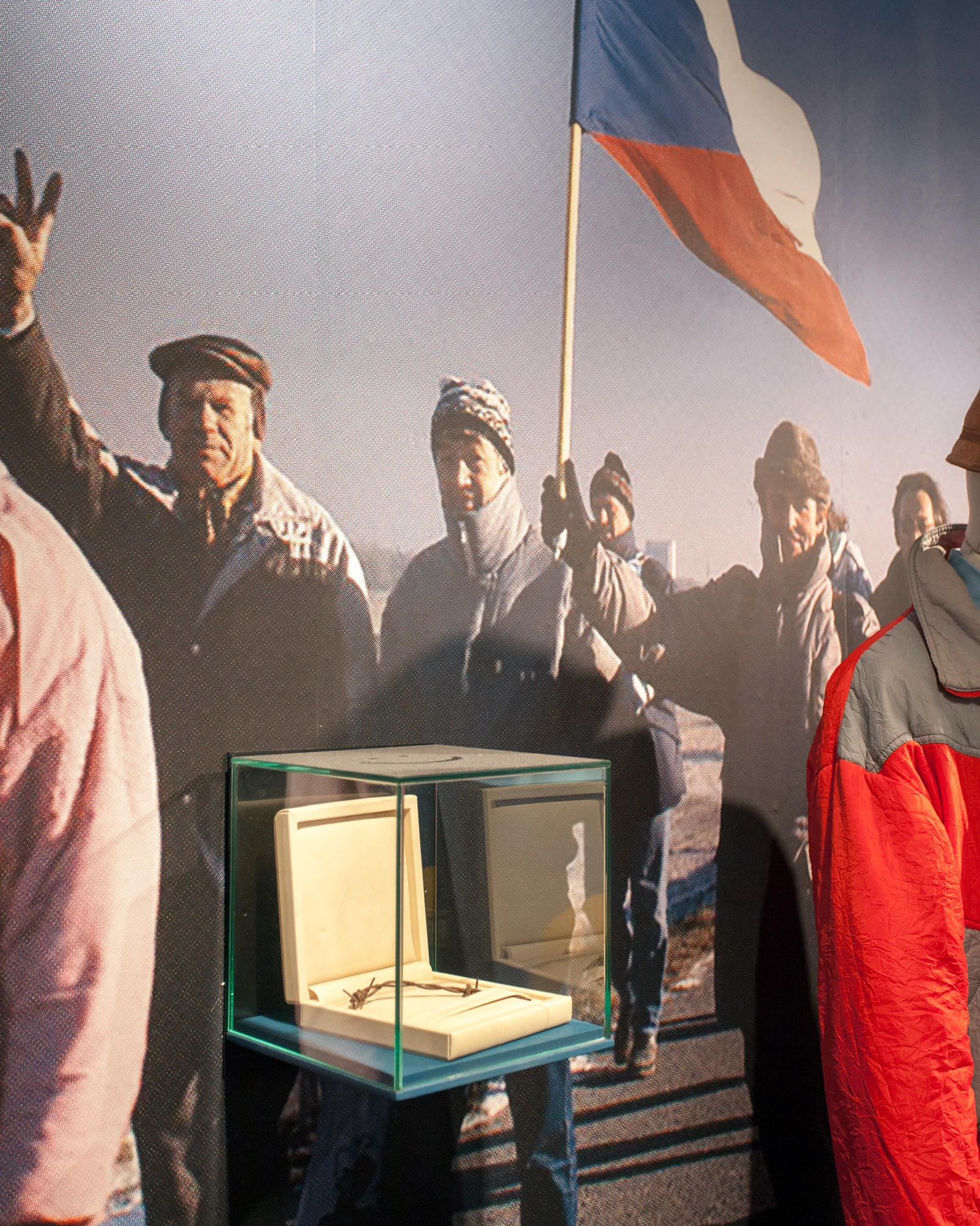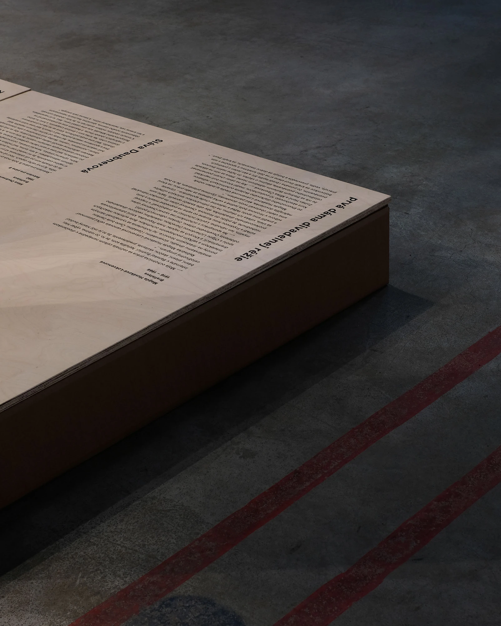 Architektúra výstavy pracuje s motívom transportných debien, ktoré sa po otvorení premieňajú na výstavný mobiliár. Ich robustná konštrukcia, jednotný materiál a sýty odtieň červenej vytvárajú výraznú vizuálnu vrstvu, ktorá kontrastuje s kamennou architektúrou priestoru. Kompozícia pôsobí na prvý pohľad náhodne, no každý objekt má presne určené miesto. Výstavný jazyk tak evokuje dočasnosť, pohyb a neustálu premenu – akoby výstava práve dorazila, otvorila sa a kedykoľvek sa mohla znova zbaliť.