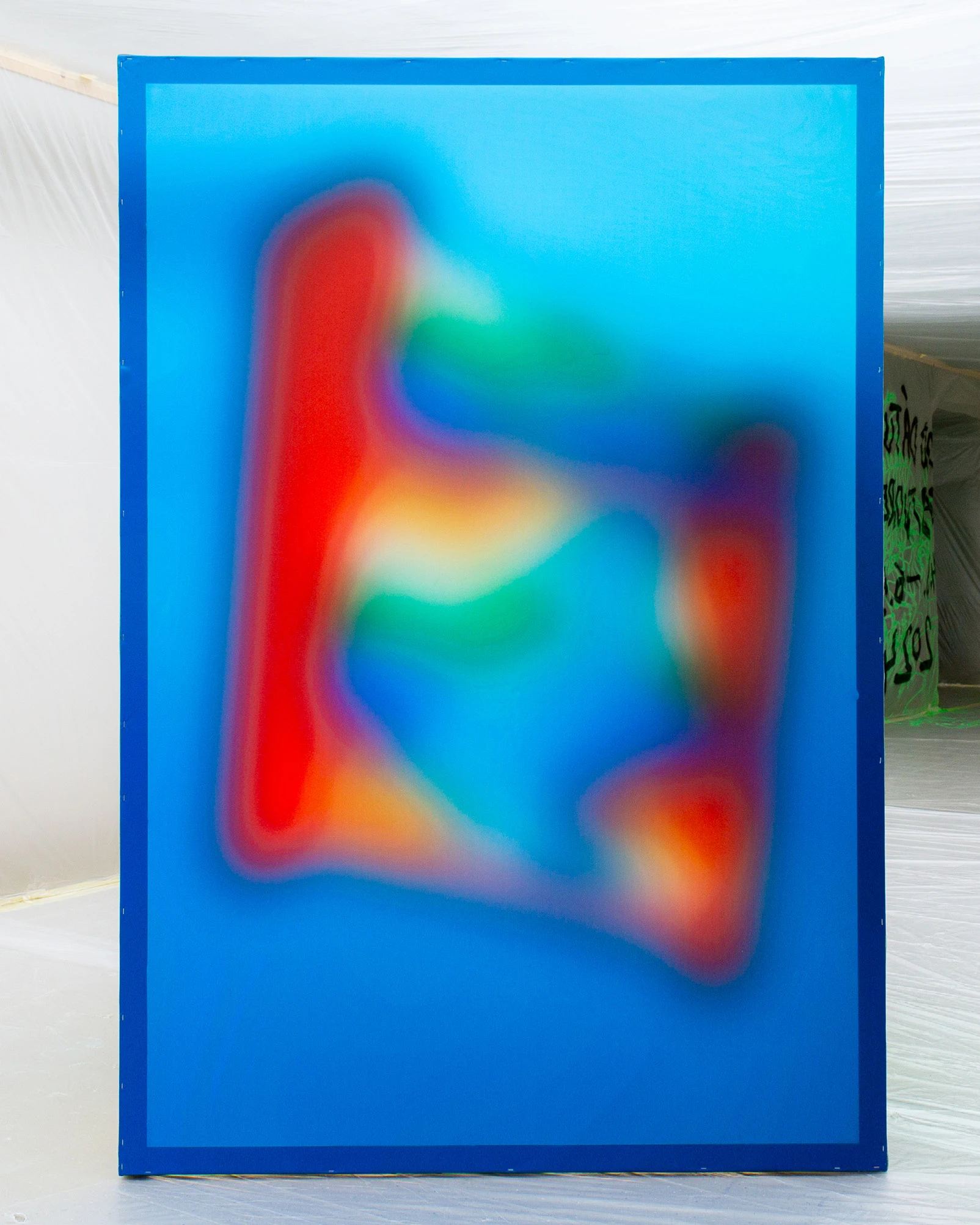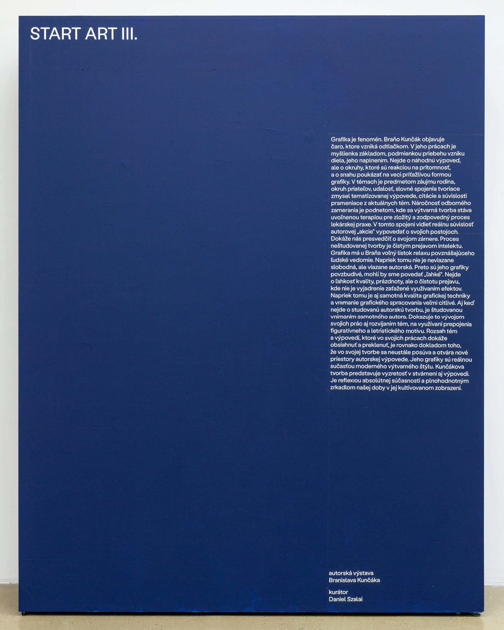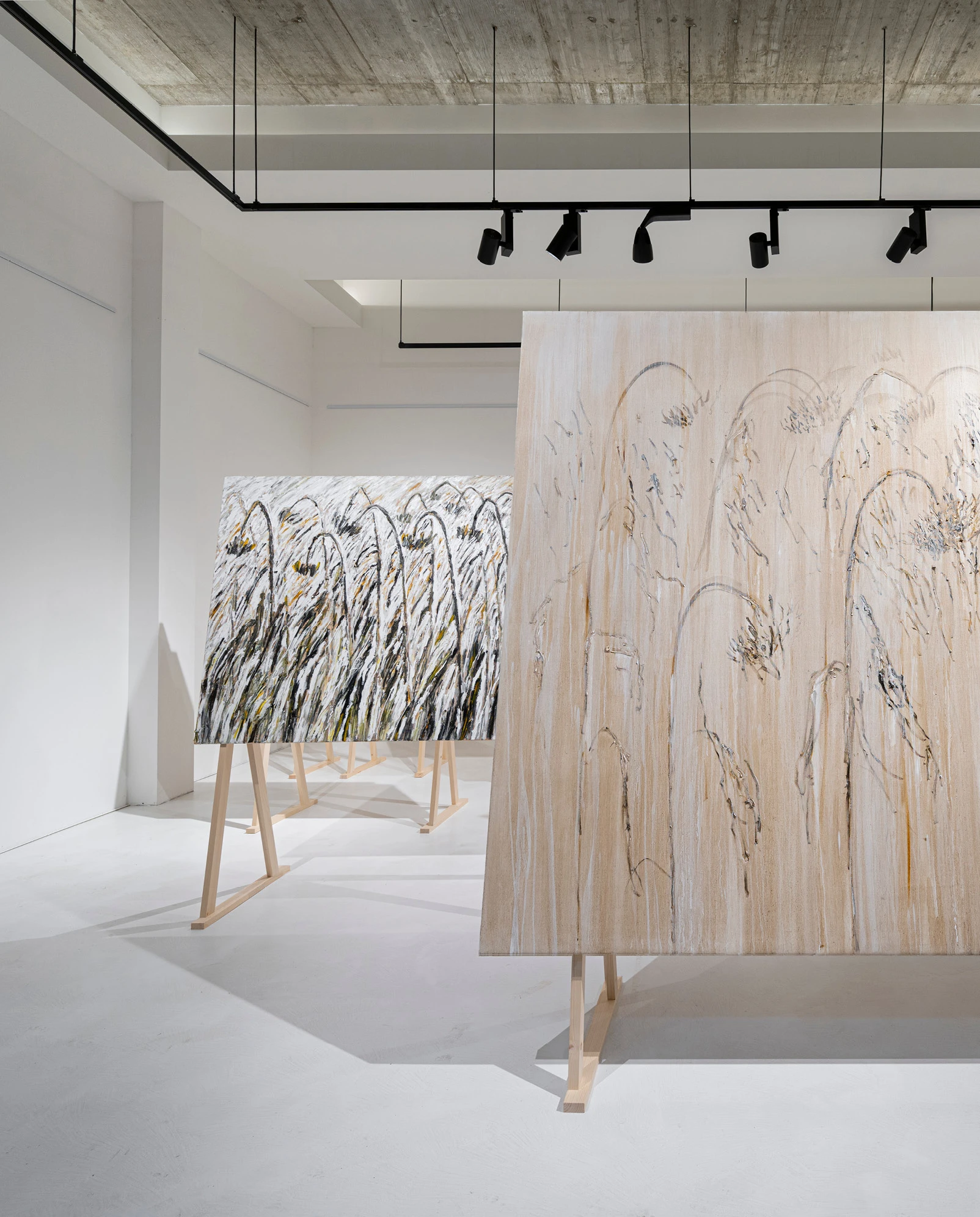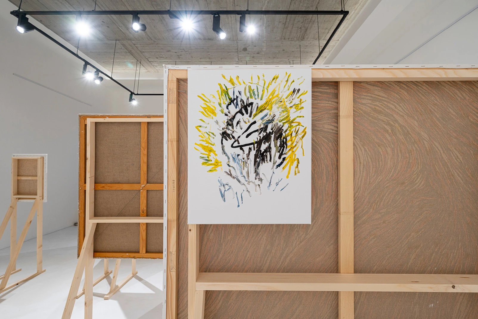 Výstava je komponovaná ako pole obrazov na samostatných drevených konštrukciách z hranolov. Maľby sú radené za sebou v jemne vychýlených líniách, čím vznikajú priehľady a napätie medzi dielami. Ich sklon a rozostavenie evokujú pohyb a ľahkosť, akoby reagovali na prúdenie vzduchu v priestore. Každé dielo má vlastný priestor, no zároveň prirodzene zapadá do celku. Jednoduché materiálové a konštrukčné riešenie necháva vyniknúť samotnej maľbe a vytvára prostredie pre sústredený, individuálny zážitok z inštalácie.