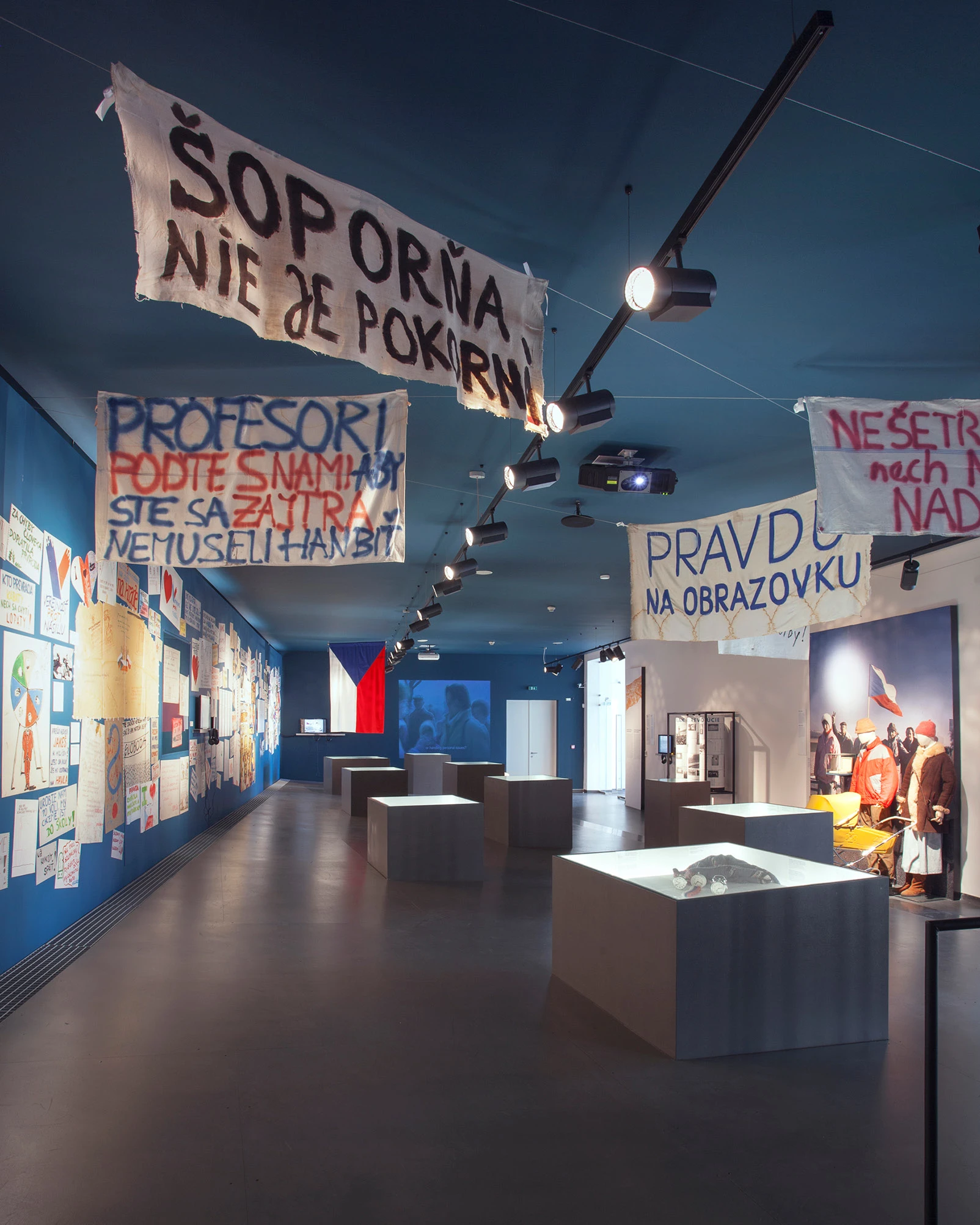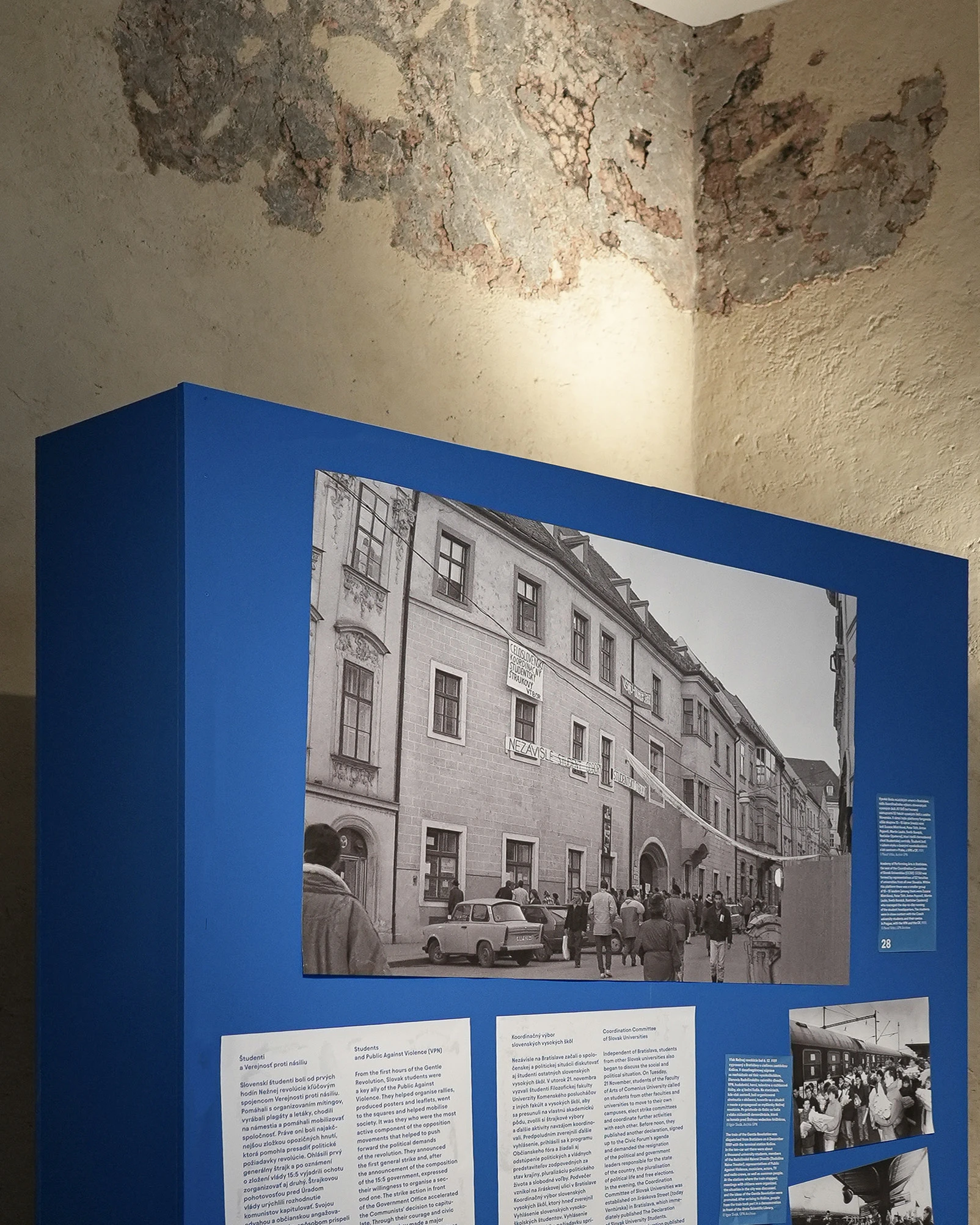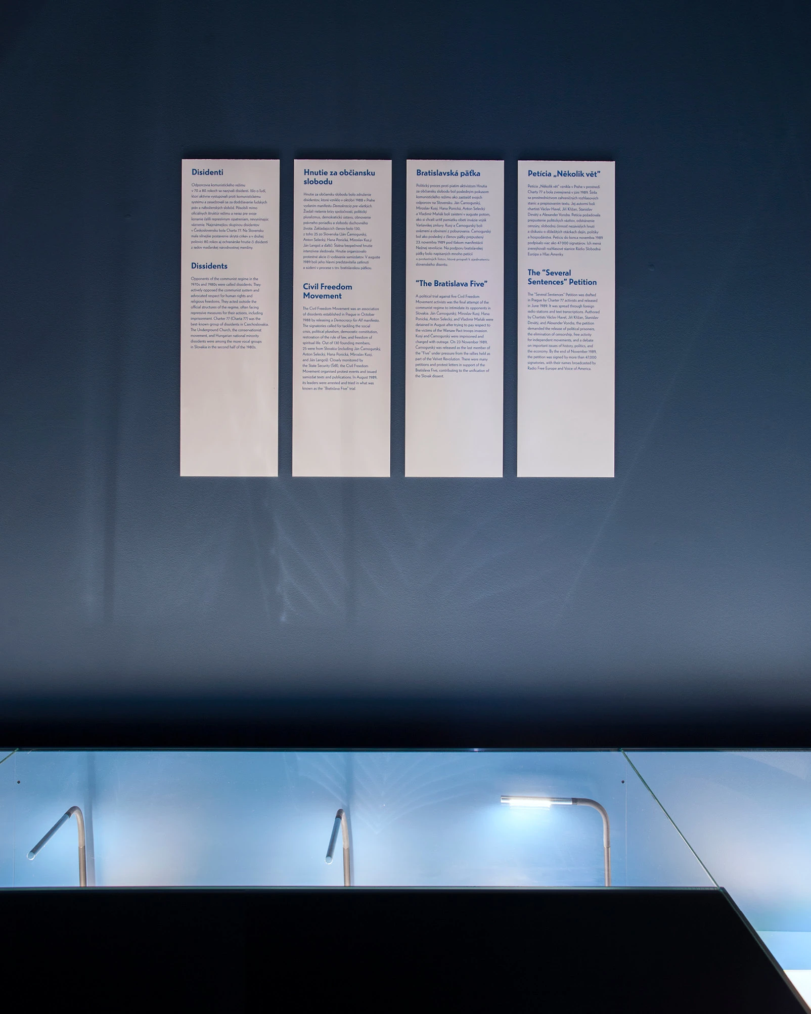 Výstavný dizajn rešpektuje historický interiér a prepája ho so súčasným výrazom. Základ tvorí modulárna konštrukcia z borovicovej preglejky ktorá pôsobí prirodzene a remeselne. Výstava pracuje s nástennými panelmi vitrínami a centrálnymi stolmi so zásuvkami. Farebnosť odlíšená zelenou pre Štúra a červenou pre Dubčeka je doplnená neutrálnou sivou. V každej miestnosti sa nachádza projektor so záznamom premietaným na bielu stenu. Návrh počíta s flexibilným využitím priestorov pre školské skupiny a workshopy. Osvetlenie je riešené pomocou podvesených líšt a zachovaných svietidiel.