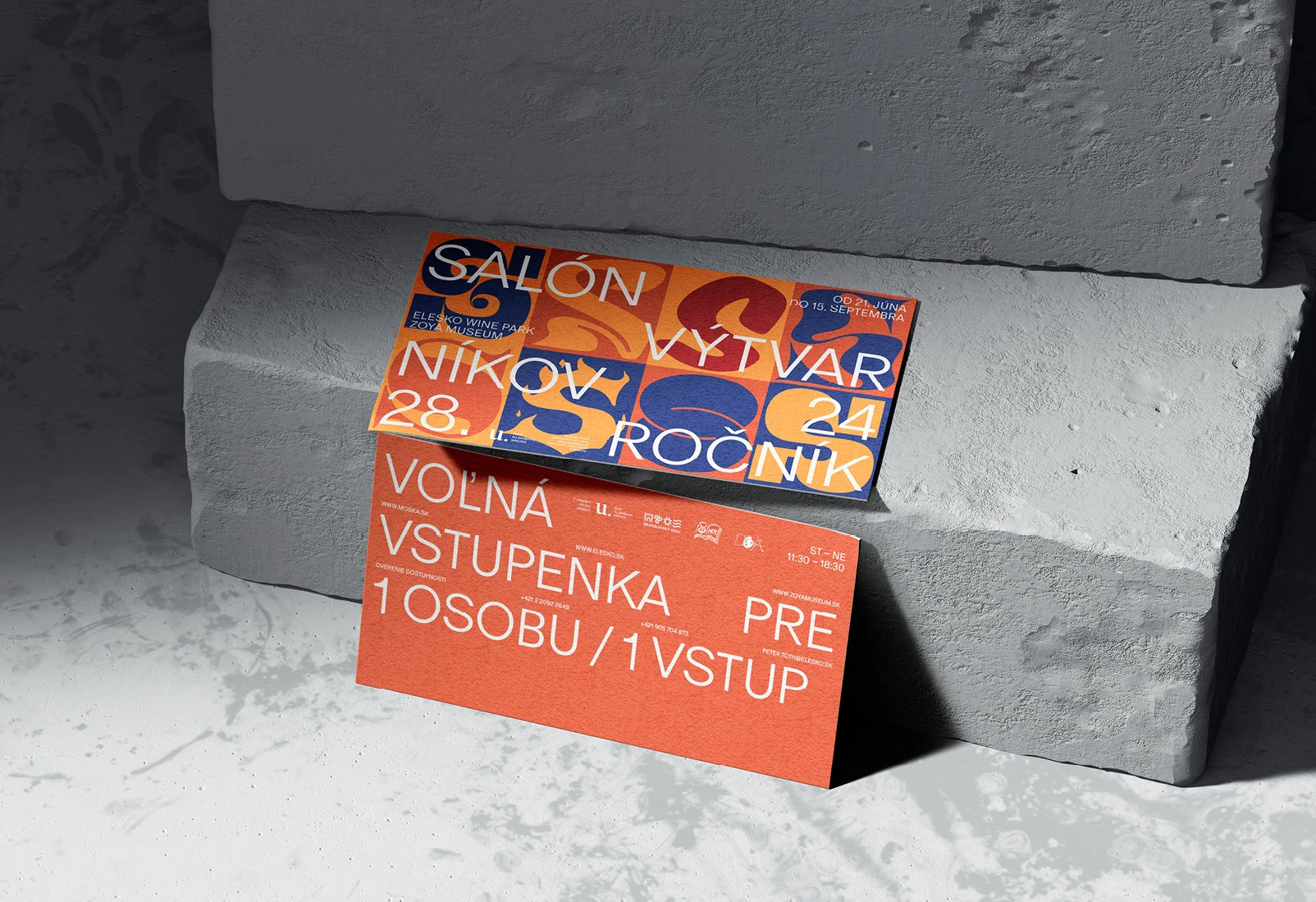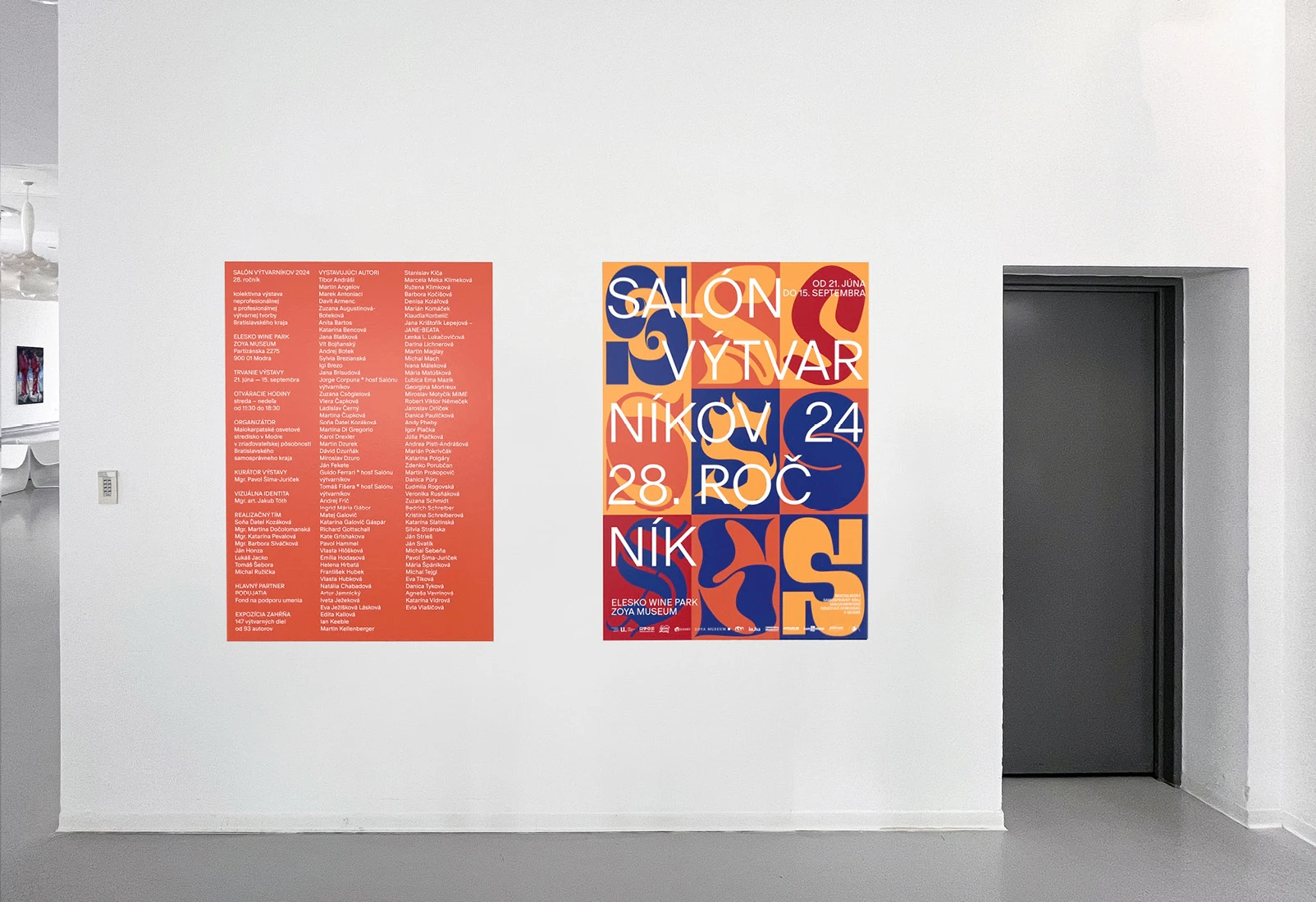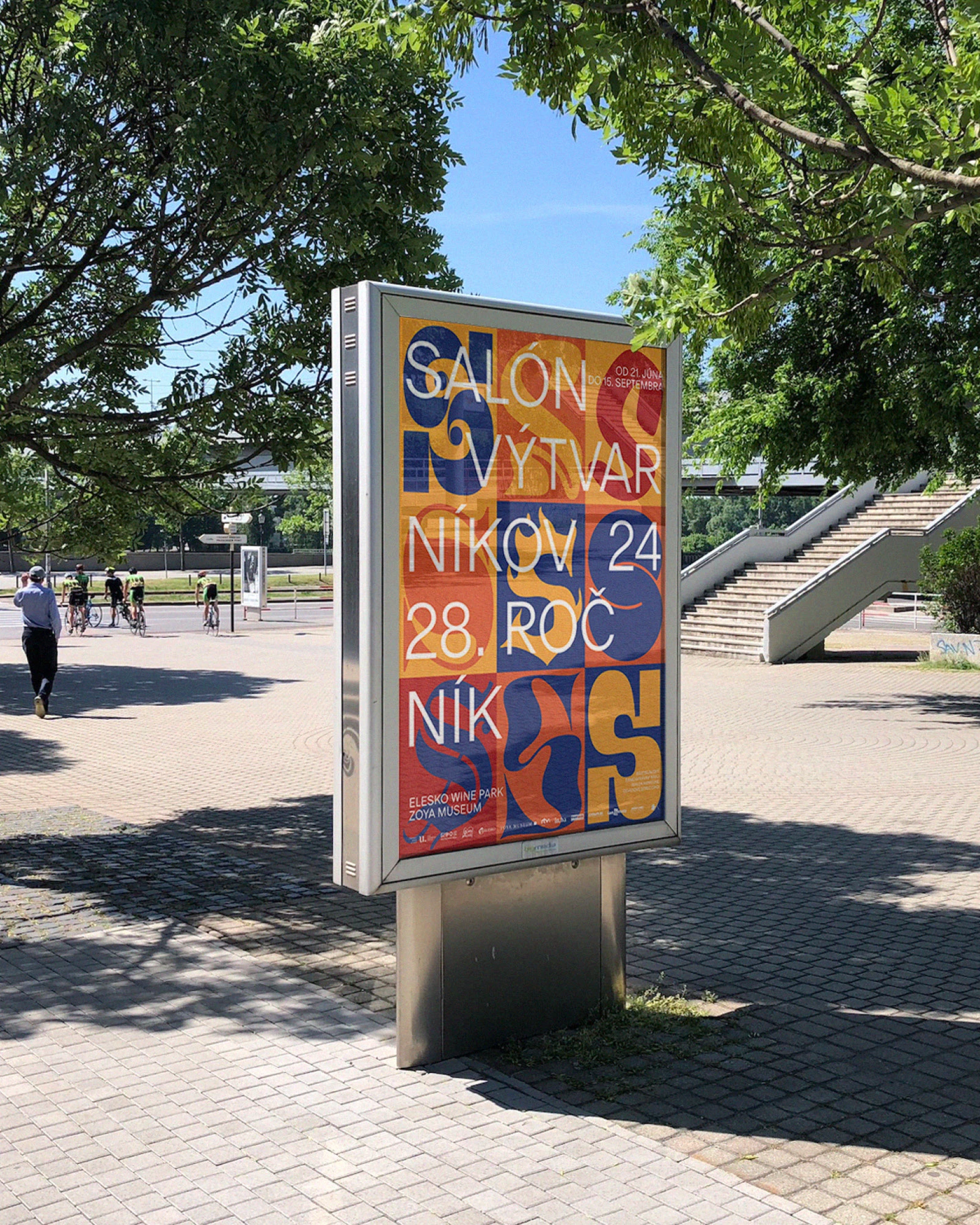 Vizuál Salónu výtvarníkov funguje ako modulárny dizajnový systém pre rôzne formáty – plagáty, bannery aj sociálne médiá – ktoré sa prispôsobujú šírke, výške i štvorcovému priestoru. Hlavná grafická metafora kombinuje farebné bloky a ornamentálne vzory, ktoré reprezentujú rozmanitosť použitých médií – maľbu, sochu, fotografiu, textil. Vedľa nich je použitá čistá minimalistická typografia, ktorá nesie informačnú rovinu prehľadne a profesionálne – kontrastným spojením umeleckého chaosu a racionálnej komunikácie podporuje jednotnú a modernú identitu multižánrového podujatia.
