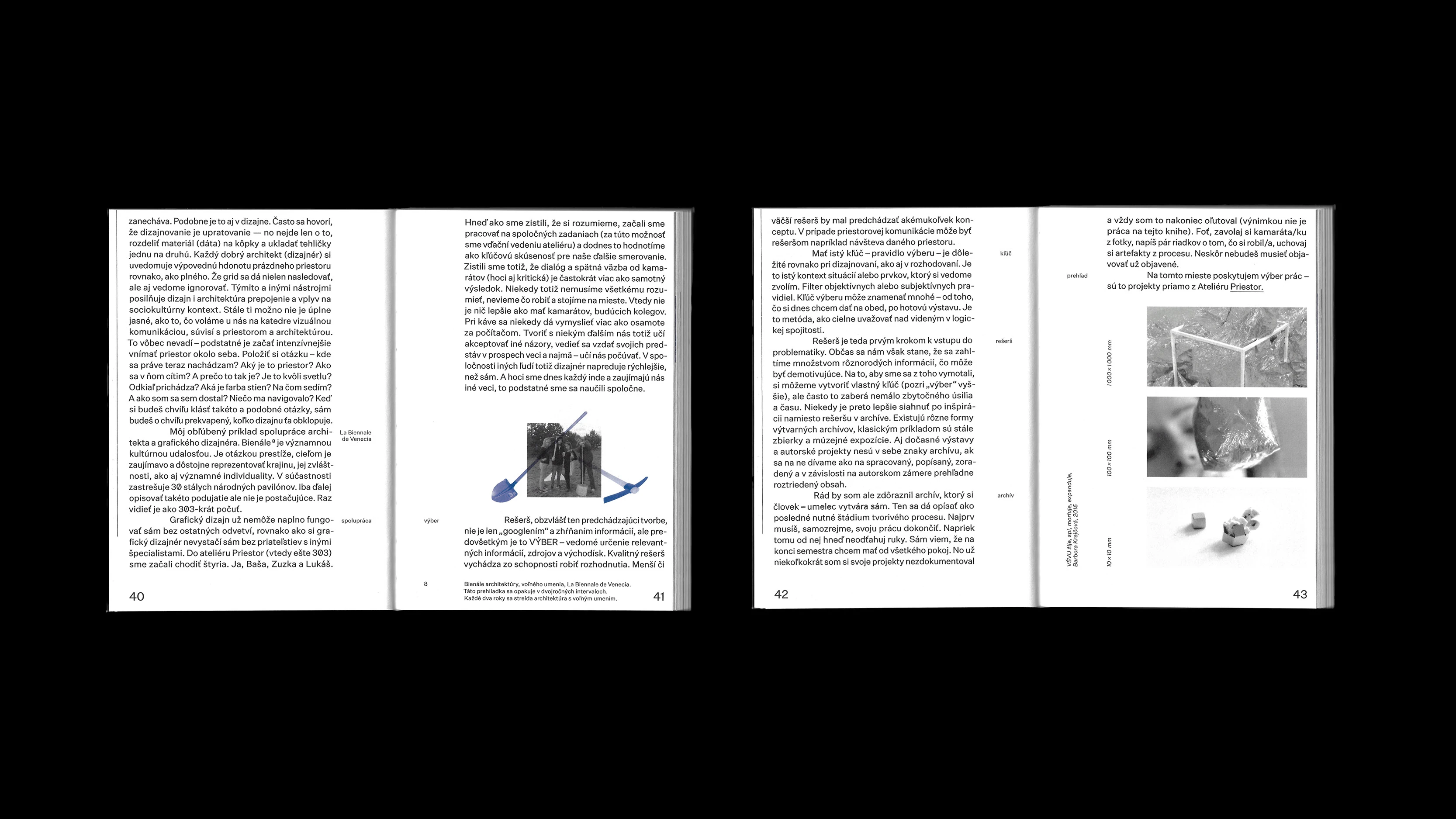 Projekt Priestorová komunikácia sa venuje výskumu vzťahov medzi architektúrou a grafickým dizajnom. Cieľom je definovať nový interdisciplinárny pojem, rozvinúť publikáciu a otvoriť diskusiu naprieč odbormi.