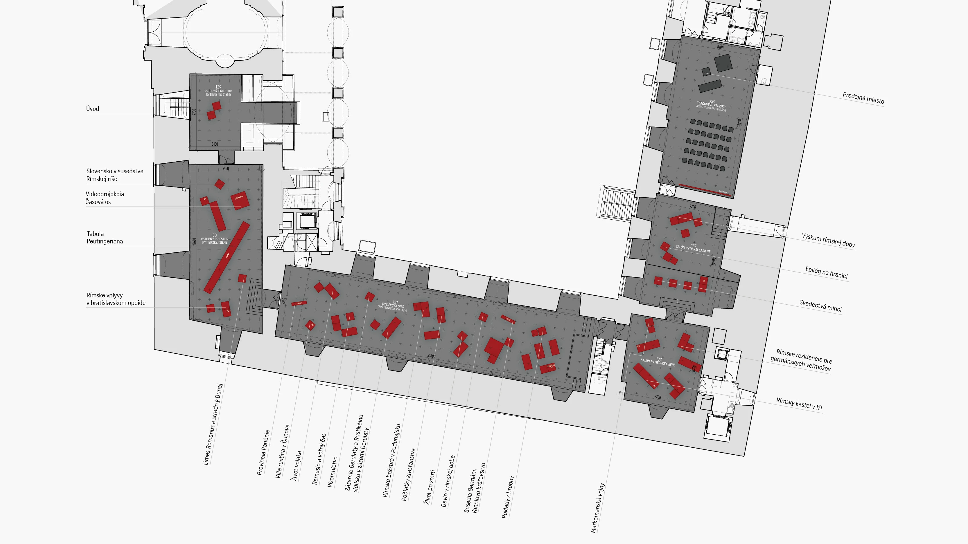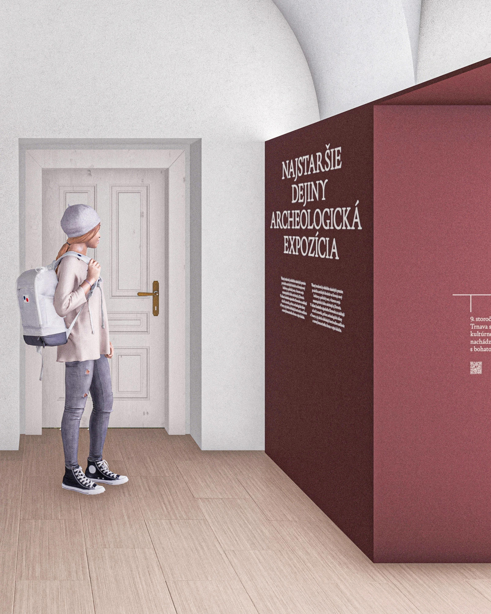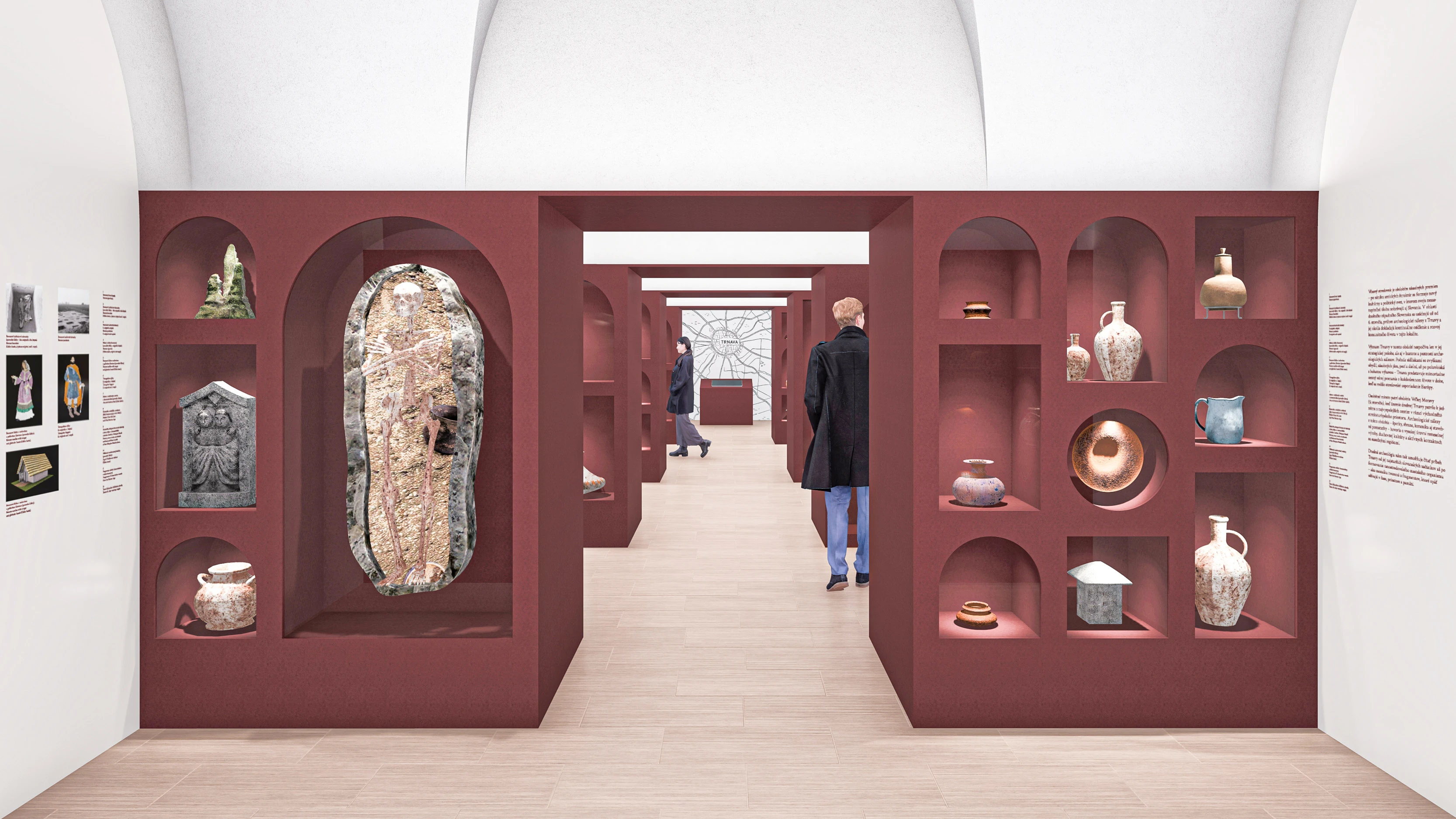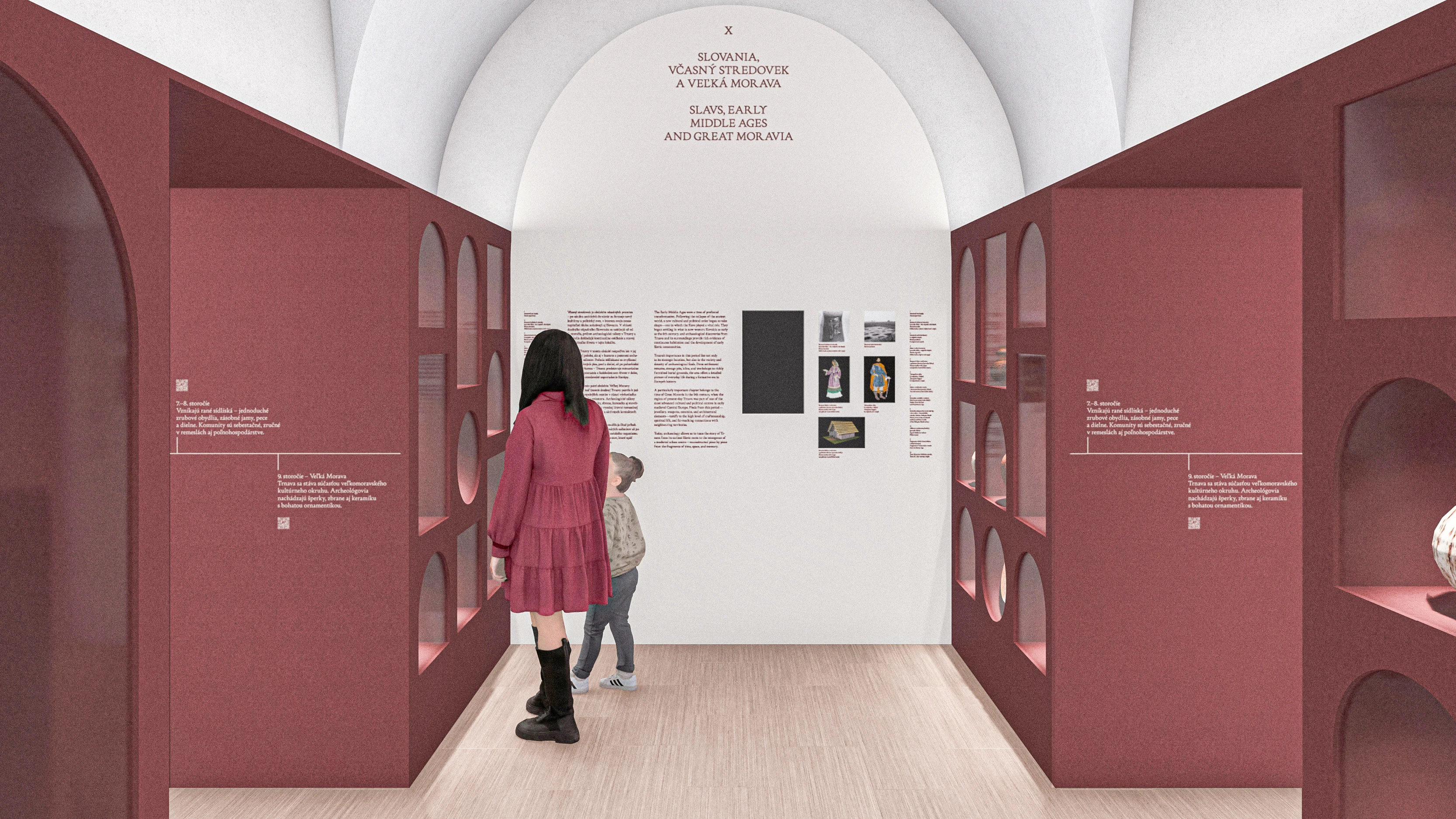 Architektonický návrh výstavy prináša priestor ako archeologickú vrstvu – vyrývané niky, výklenky a portály evokujúce archeologické jamy, postupne odhaľujúce exponáty. Monochromatická červenohnedá farba pripomína pôdu a tvorí tlmené pozadie pre kontemplatívny zážitok. Modulárny systém vitrín a výstavných panelov kopíruje oblúkové tvaroslovie miestností, pričom integrované otvárateľné vitríny s prachotesným tesnením umožňujú ochranu objektov a ich jednoduchú výmenu. Otvorené priehľady v priestore navodzujú kontinuálne odhaľovanie a zvedavosť, zatiaľ čo štruktúrované grafické panely regulujú svetlo a zachovávajú pôvodné vykurovanie. Organicky tak vzniká harmonický súlad historickej štruktúry a modernej expozičnej techniky.