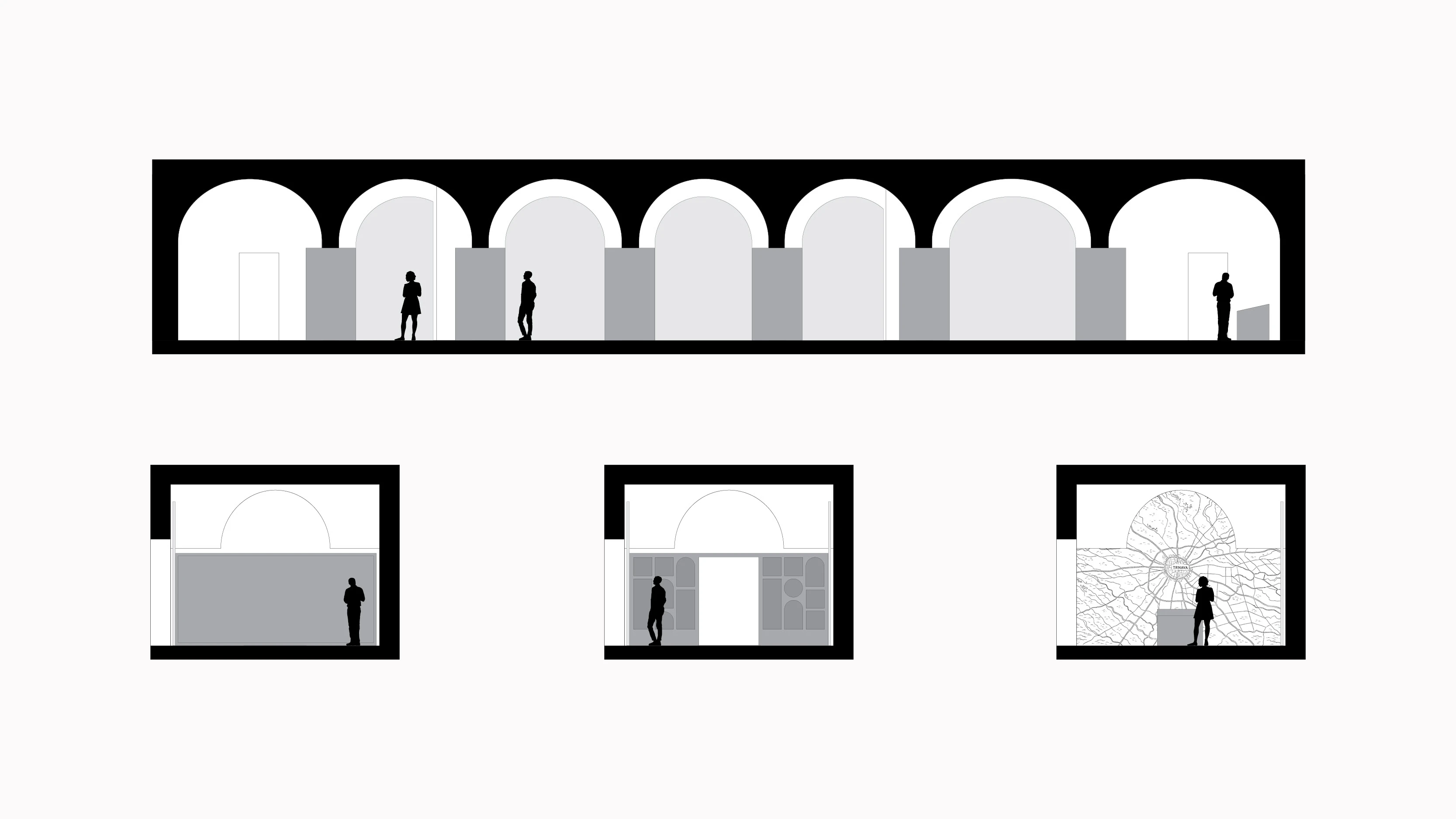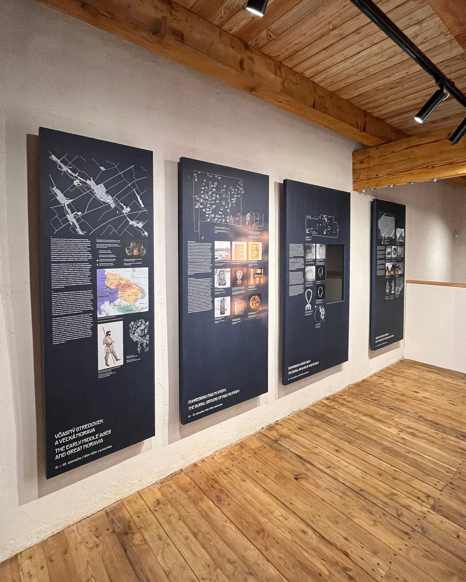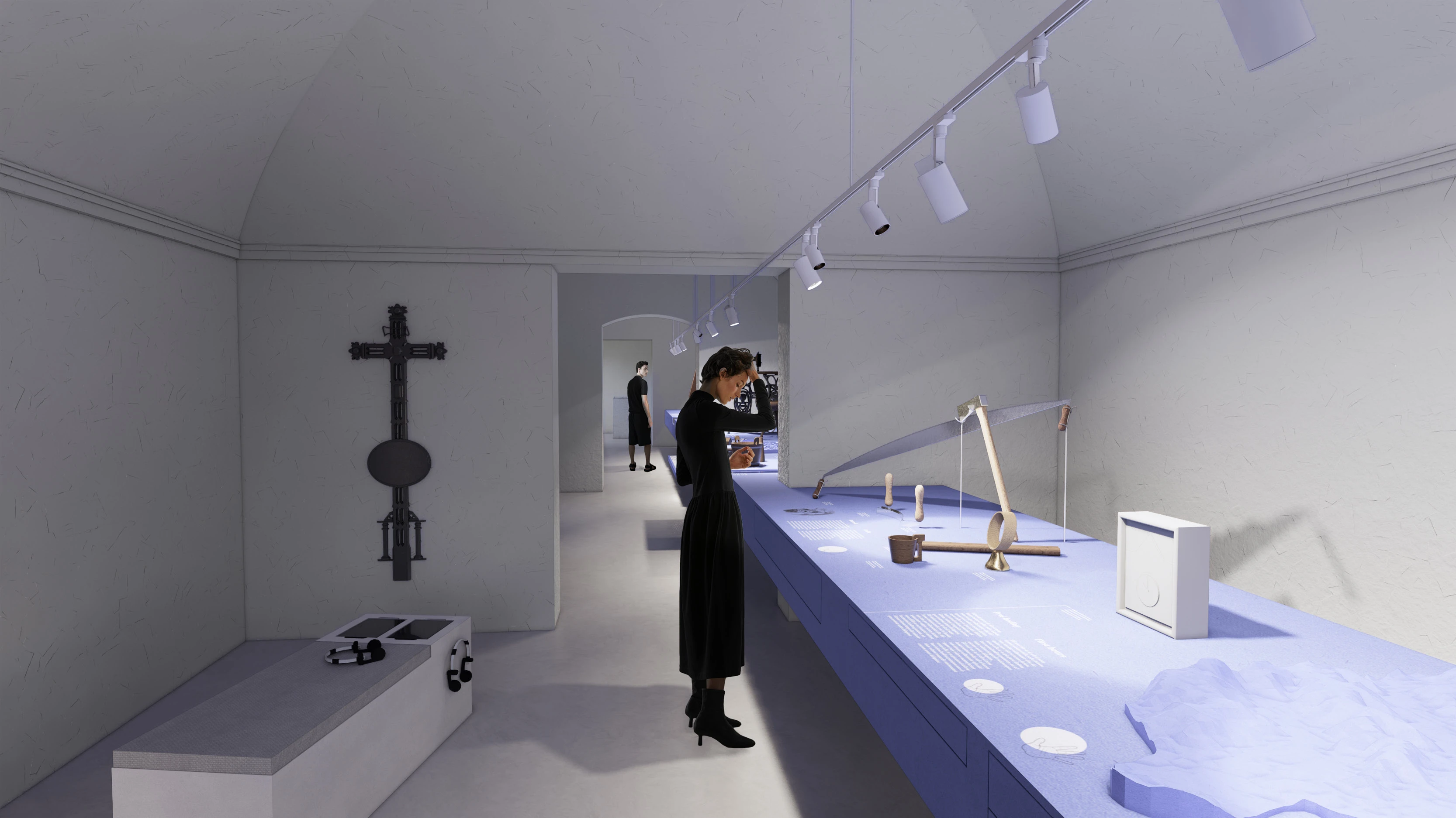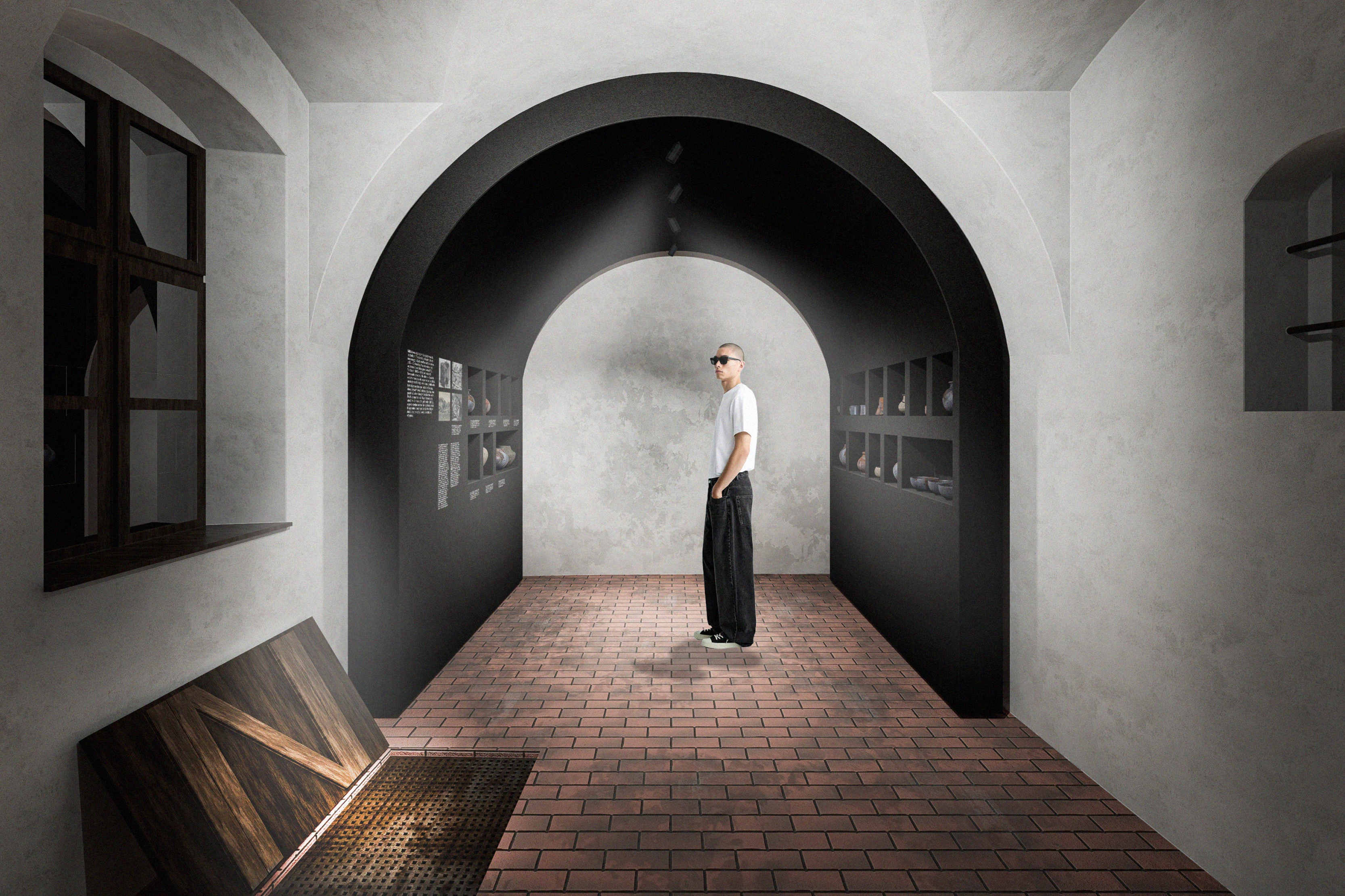Architektonický návrh výstavy prináša priestor ako archeologickú vrstvu – vyrývané niky, výklenky a portály evokujúce archeologické jamy, postupne odhaľujúce exponáty. Monochromatická červenohnedá farba pripomína pôdu a tvorí tlmené pozadie pre kontemplatívny zážitok. Modulárny systém vitrín a výstavných panelov kopíruje oblúkové tvaroslovie miestností, pričom integrované otvárateľné vitríny s prachotesným tesnením umožňujú ochranu objektov a ich jednoduchú výmenu. Otvorené priehľady v priestore navodzujú kontinuálne odhaľovanie a zvedavosť, zatiaľ čo štruktúrované grafické panely regulujú svetlo a zachovávajú pôvodné vykurovanie. Organicky tak vzniká harmonický súlad historickej štruktúry a modernej expozičnej techniky.