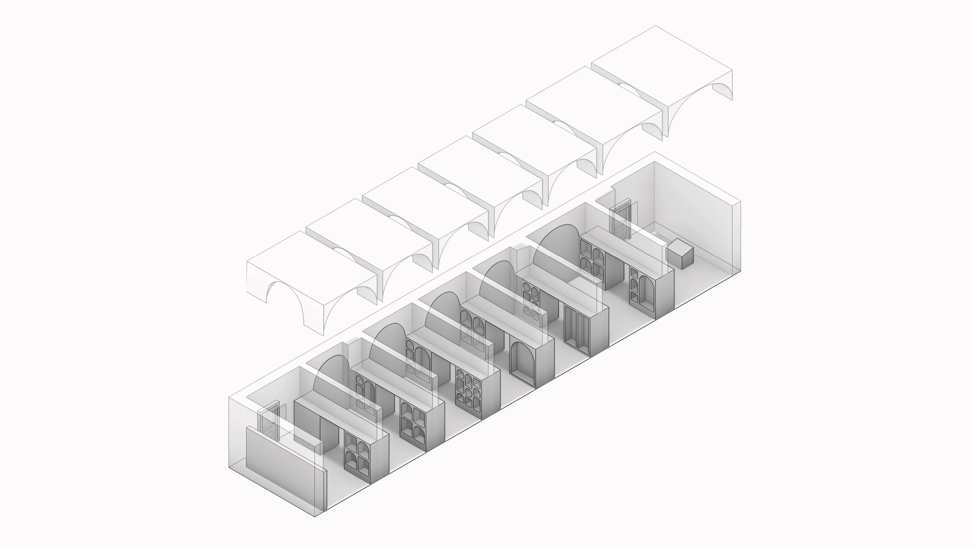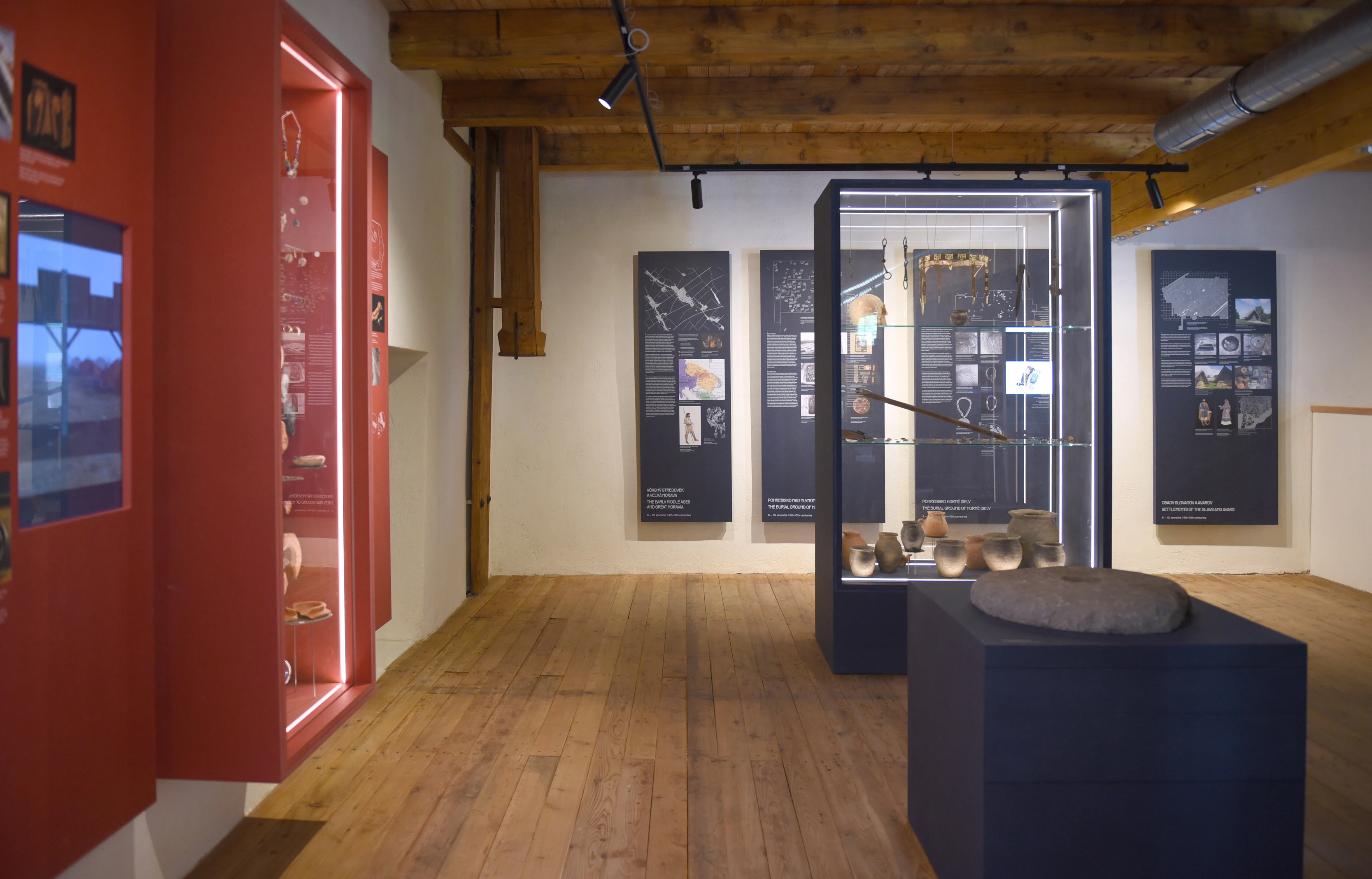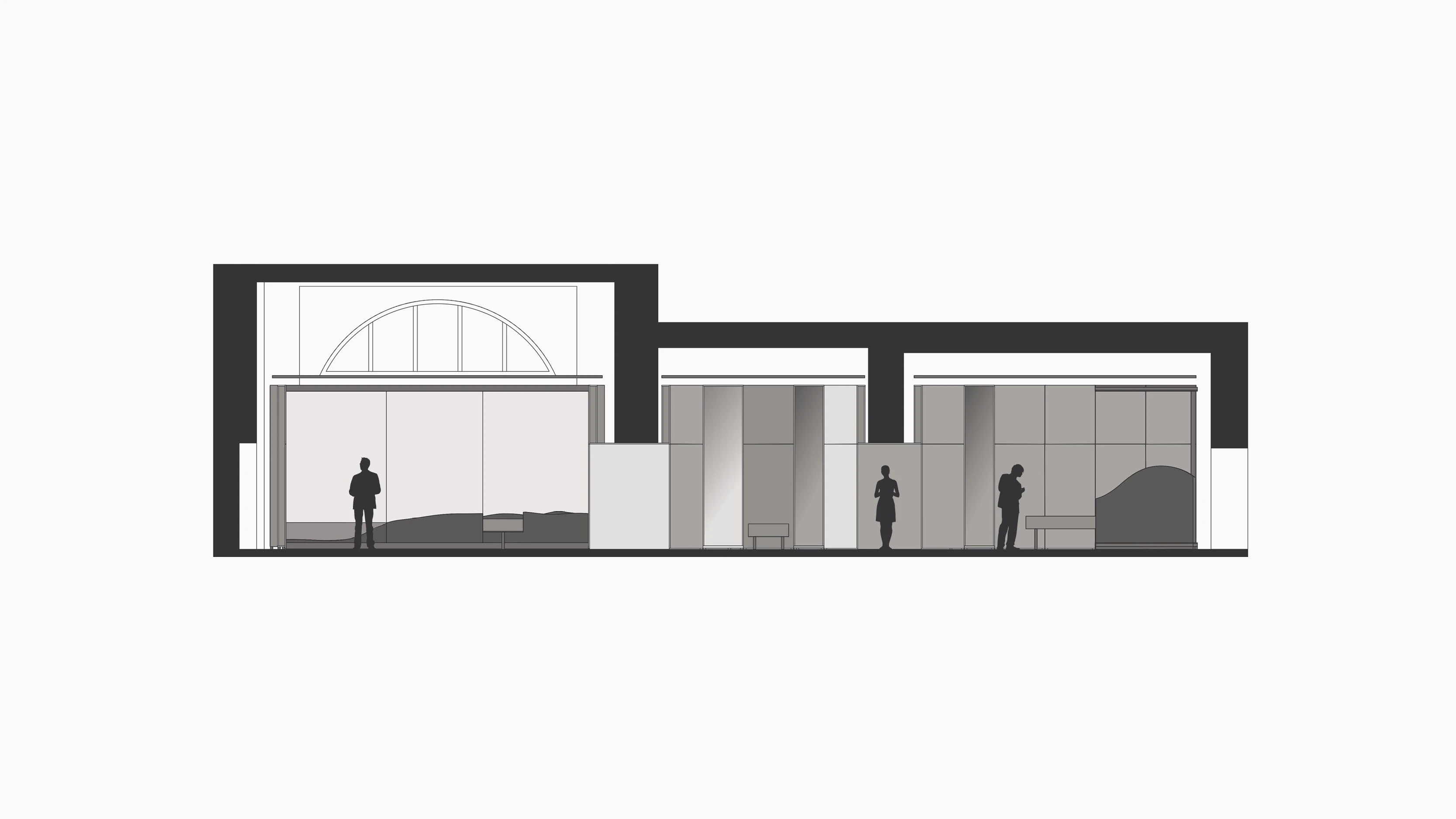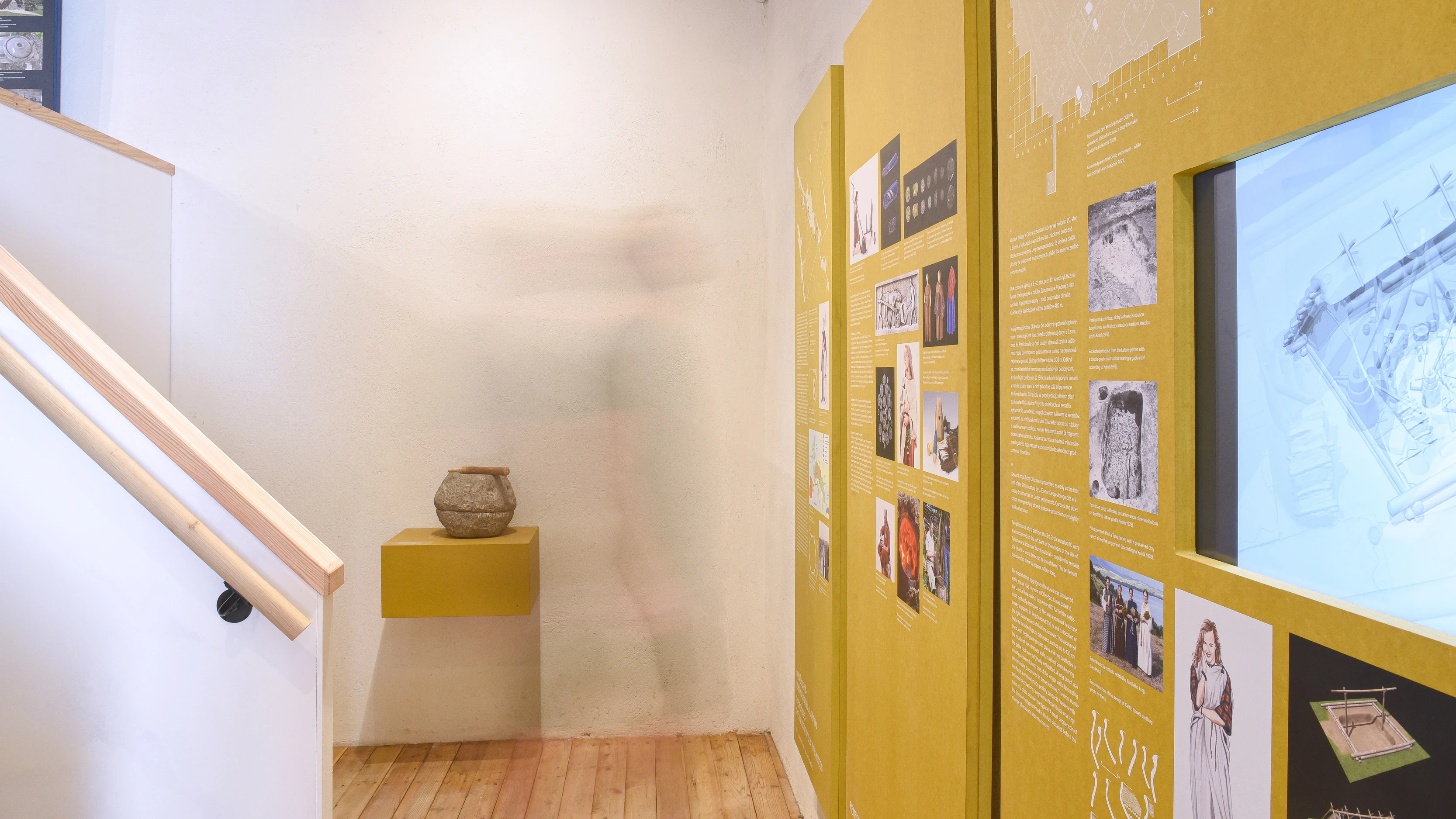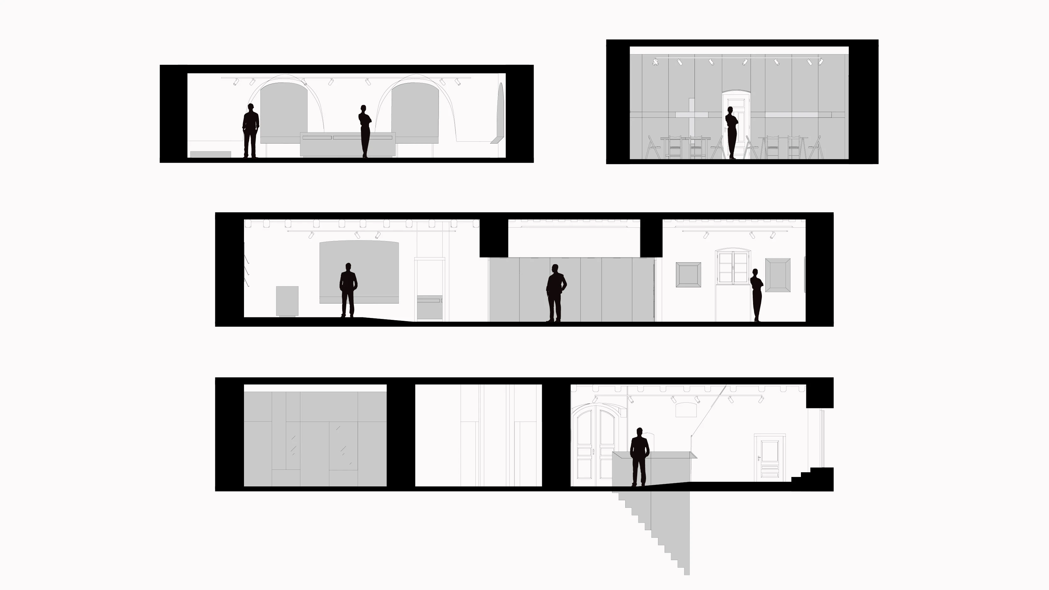 Architektonický návrh výstavy prináša priestor ako archeologickú vrstvu – vyrývané niky, výklenky a portály evokujúce archeologické jamy, postupne odhaľujúce exponáty. Monochromatická červenohnedá farba pripomína pôdu a tvorí tlmené pozadie pre kontemplatívny zážitok. Modulárny systém vitrín a výstavných panelov kopíruje oblúkové tvaroslovie miestností, pričom integrované otvárateľné vitríny s prachotesným tesnením umožňujú ochranu objektov a ich jednoduchú výmenu. Otvorené priehľady v priestore navodzujú kontinuálne odhaľovanie a zvedavosť, zatiaľ čo štruktúrované grafické panely regulujú svetlo a zachovávajú pôvodné vykurovanie. Organicky tak vzniká harmonický súlad historickej štruktúry a modernej expozičnej techniky.