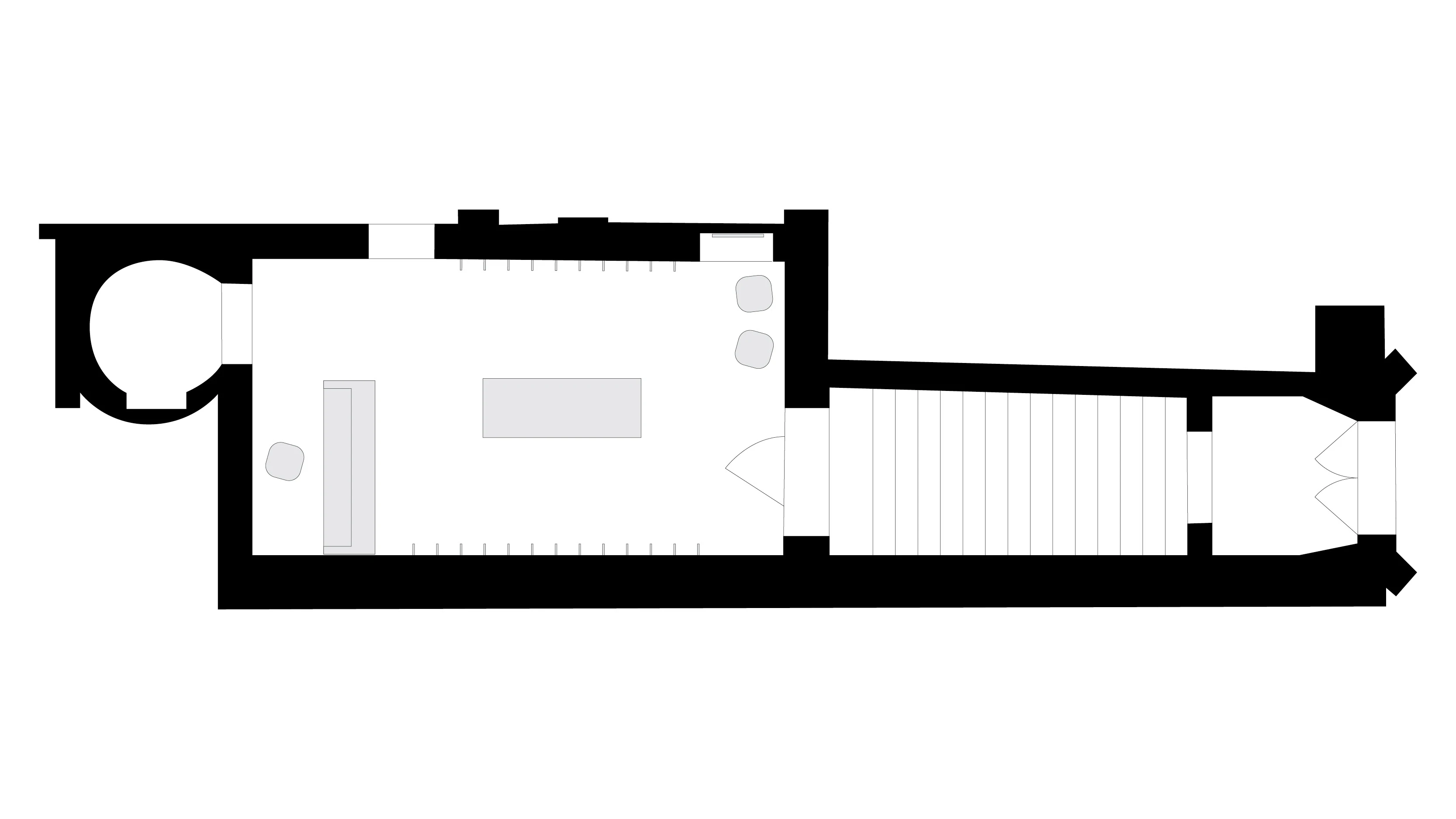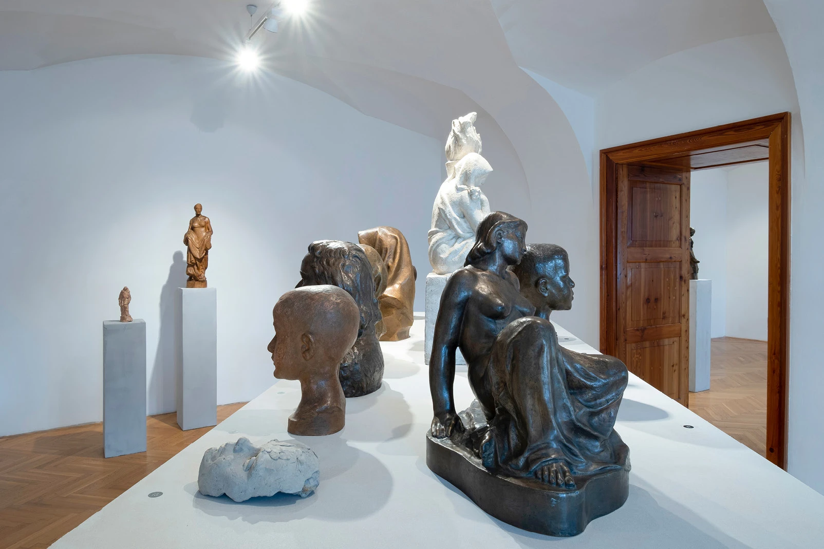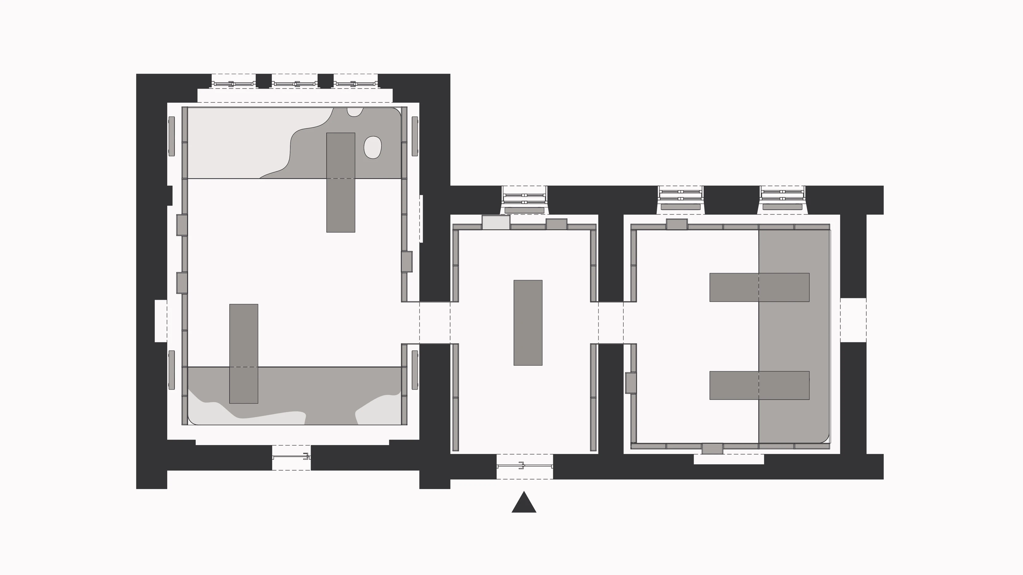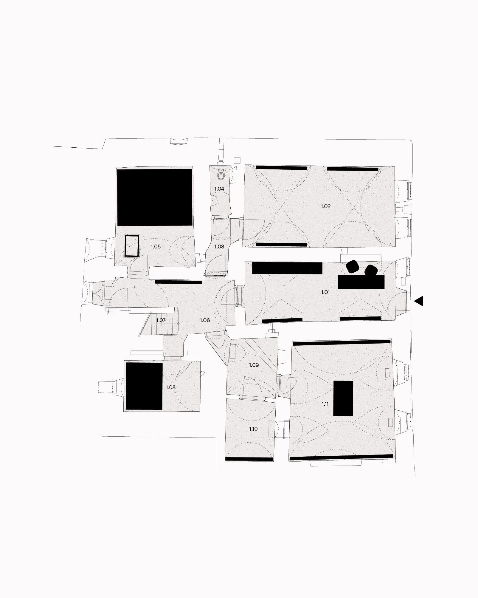 Architektonický návrh výstavy prináša priestor ako archeologickú vrstvu – vyrývané niky, výklenky a portály evokujúce archeologické jamy, postupne odhaľujúce exponáty. Monochromatická červenohnedá farba pripomína pôdu a tvorí tlmené pozadie pre kontemplatívny zážitok. Modulárny systém vitrín a výstavných panelov kopíruje oblúkové tvaroslovie miestností, pričom integrované otvárateľné vitríny s prachotesným tesnením umožňujú ochranu objektov a ich jednoduchú výmenu. Otvorené priehľady v priestore navodzujú kontinuálne odhaľovanie a zvedavosť, zatiaľ čo štruktúrované grafické panely regulujú svetlo a zachovávajú pôvodné vykurovanie. Organicky tak vzniká harmonický súlad historickej štruktúry a modernej expozičnej techniky.