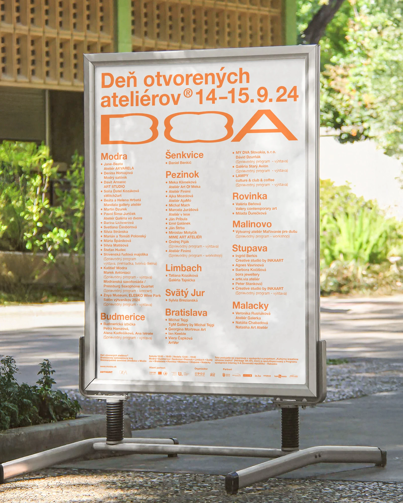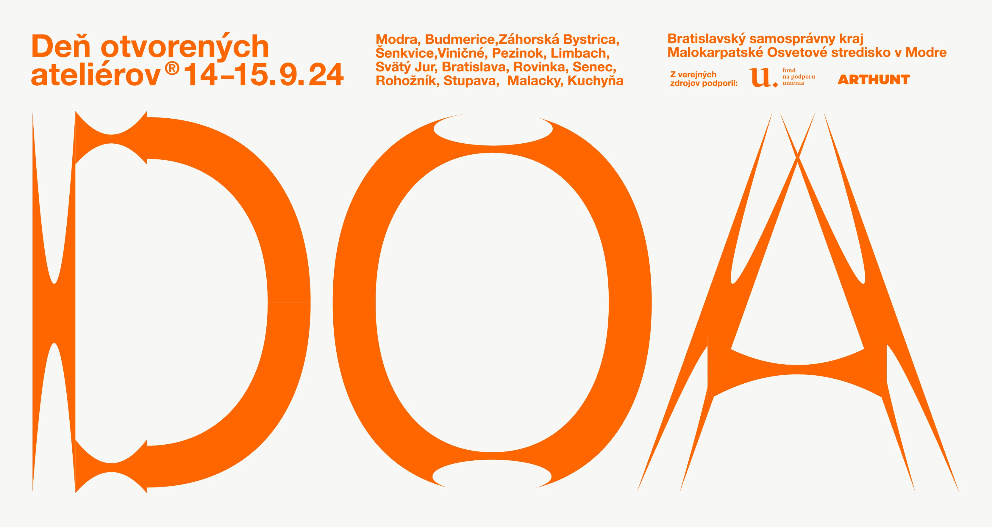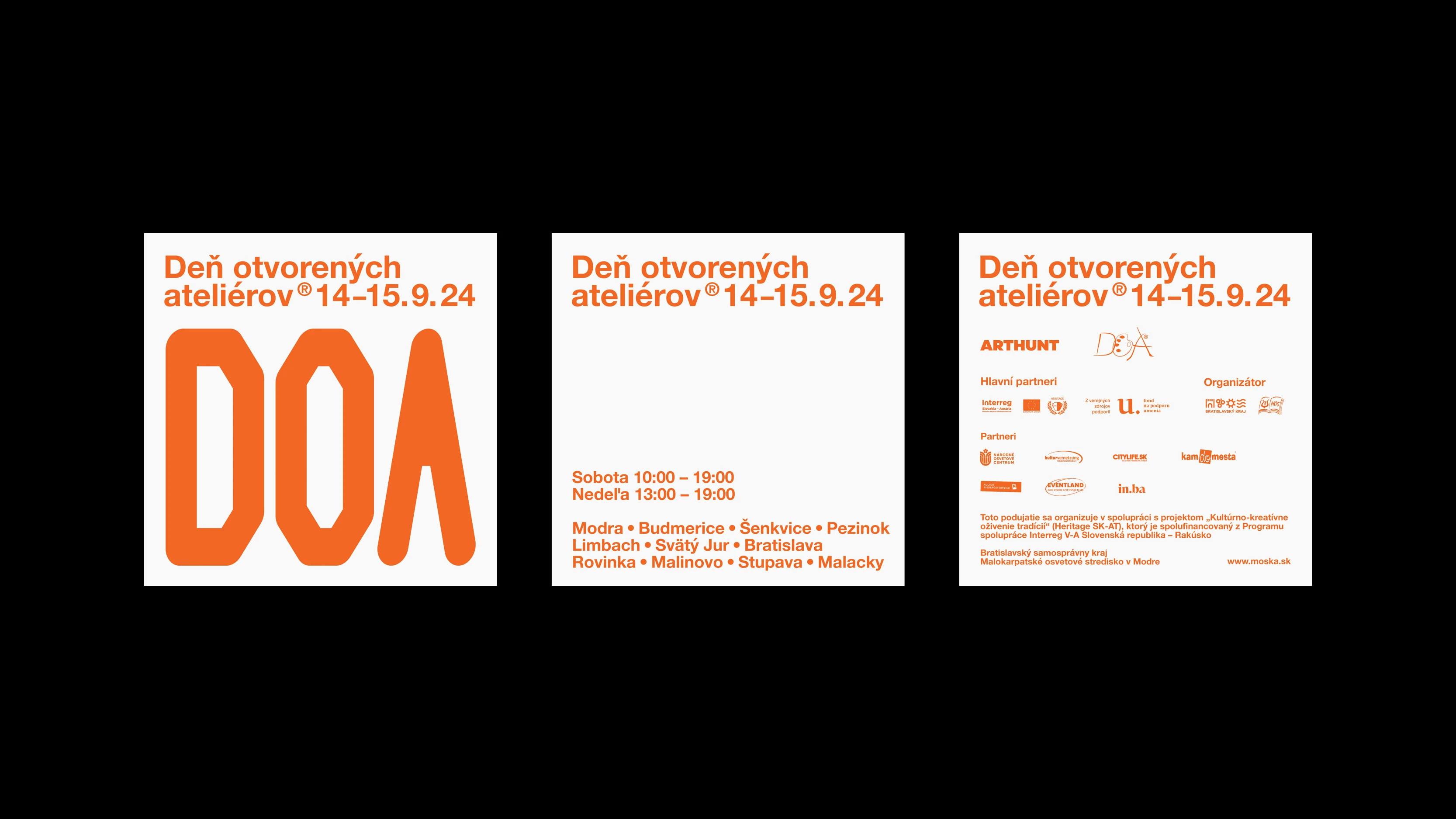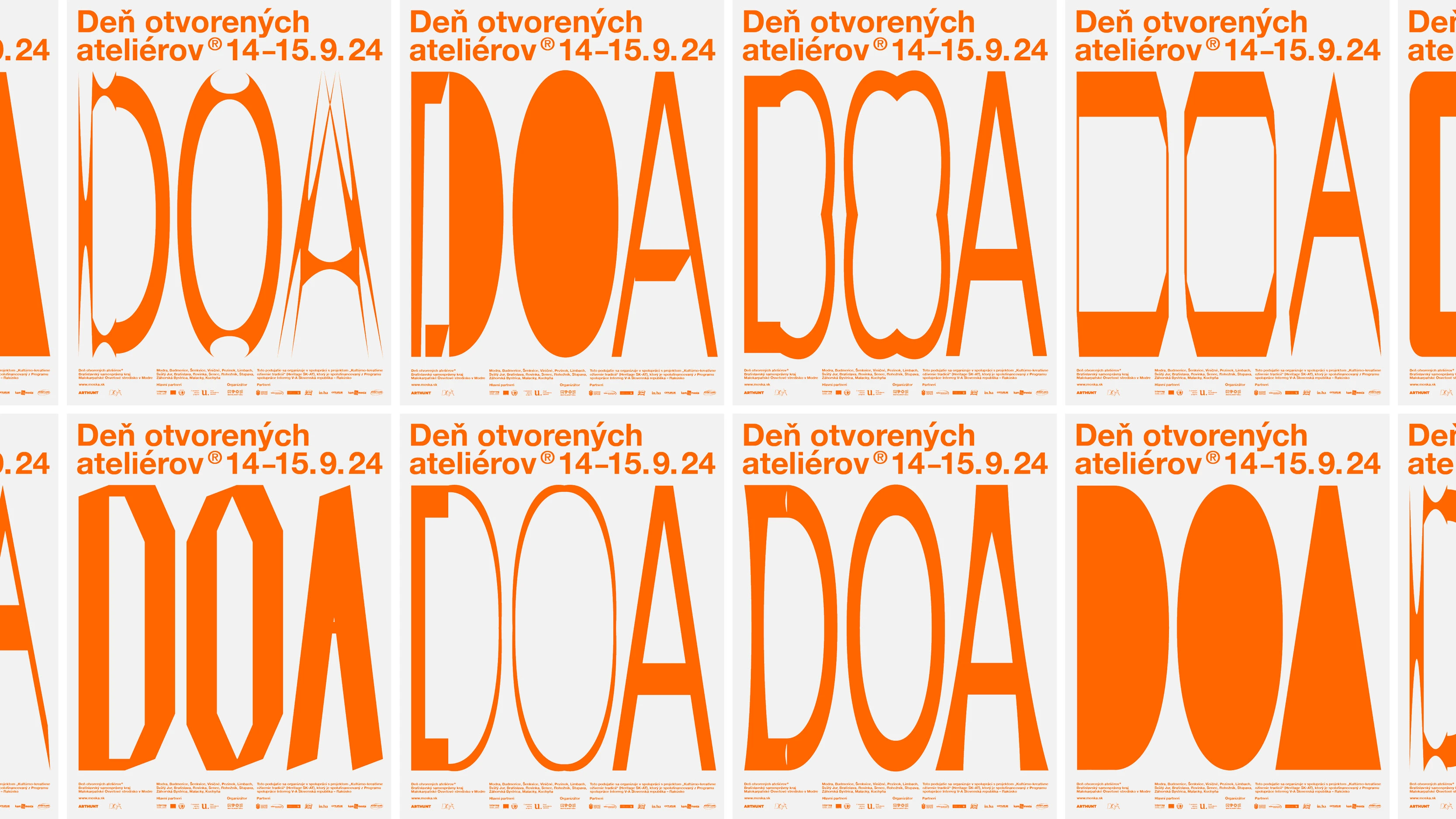 Vizuálna identita Dňa otvorených ateliérov je postavená na variabilnom typografickom systéme založenom na skratke DOA. Modulárne písmo umožňuje široké morfologické transformácie, čím každý plagát nadobúda jedinečný výraz. Typografia sa stáva nositeľom významu aj nálady – komunikuje rôznorodosť, otvorenosť a experimentálny charakter umeleckej scény. Jednofarebné riešenie zjednocuje sériu a vytvára silnú vizuálnu kontinuitu v mestskom prostredí.