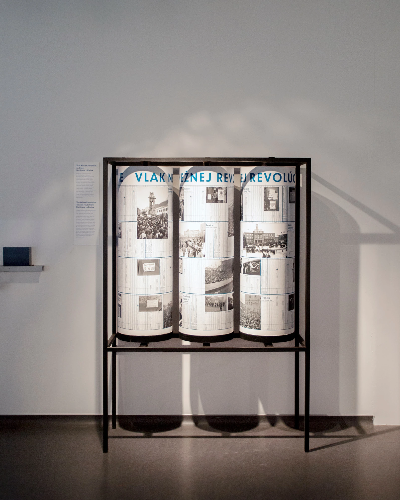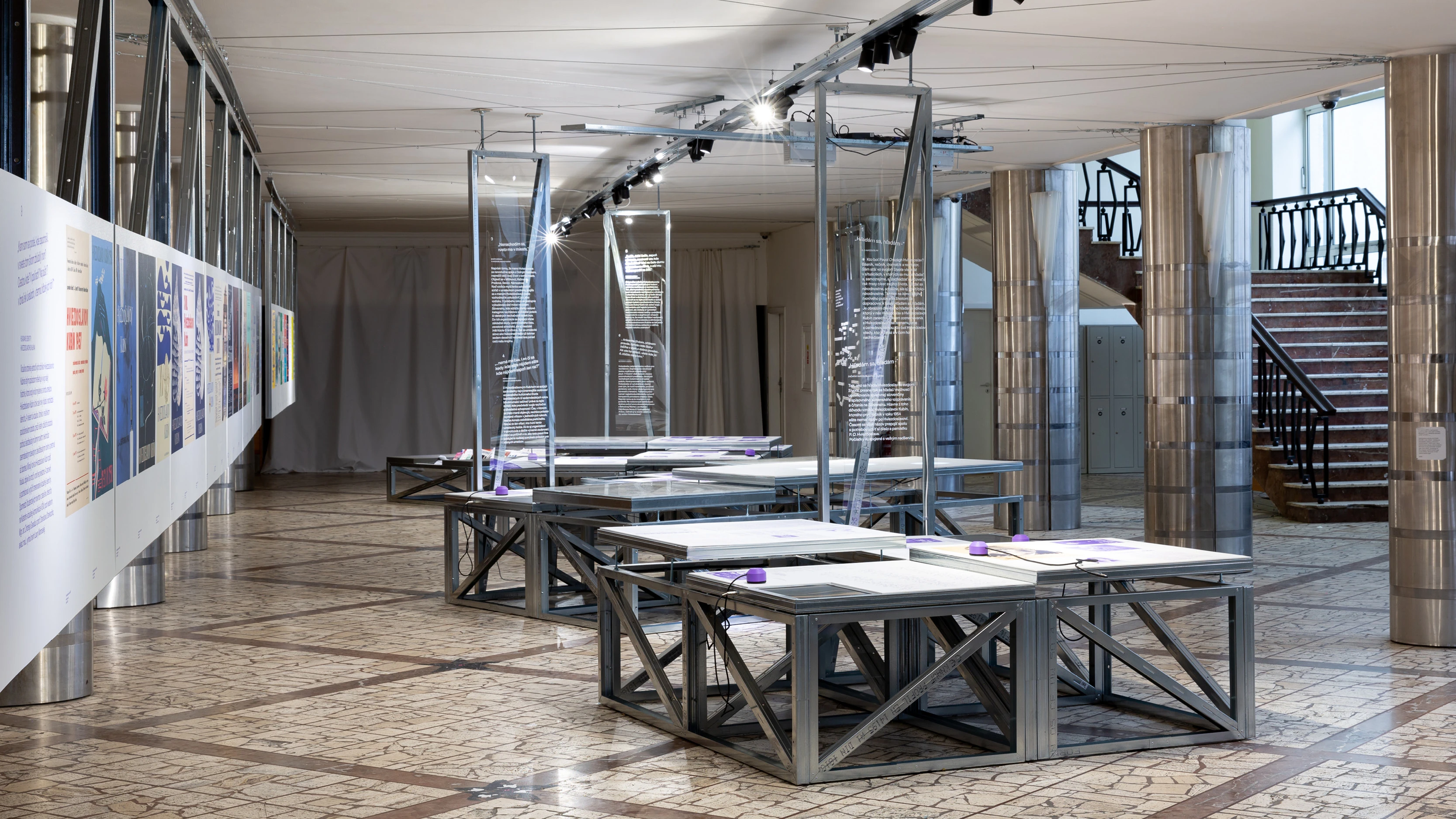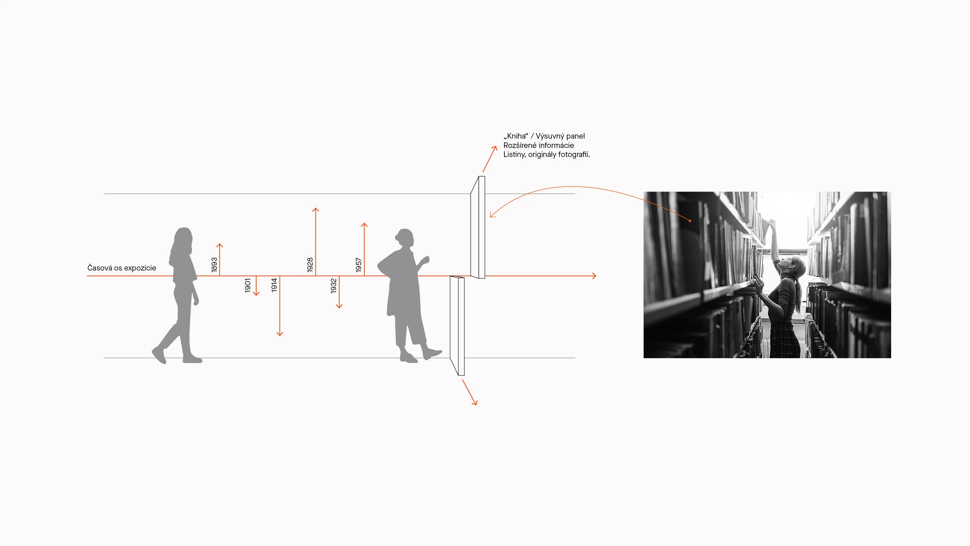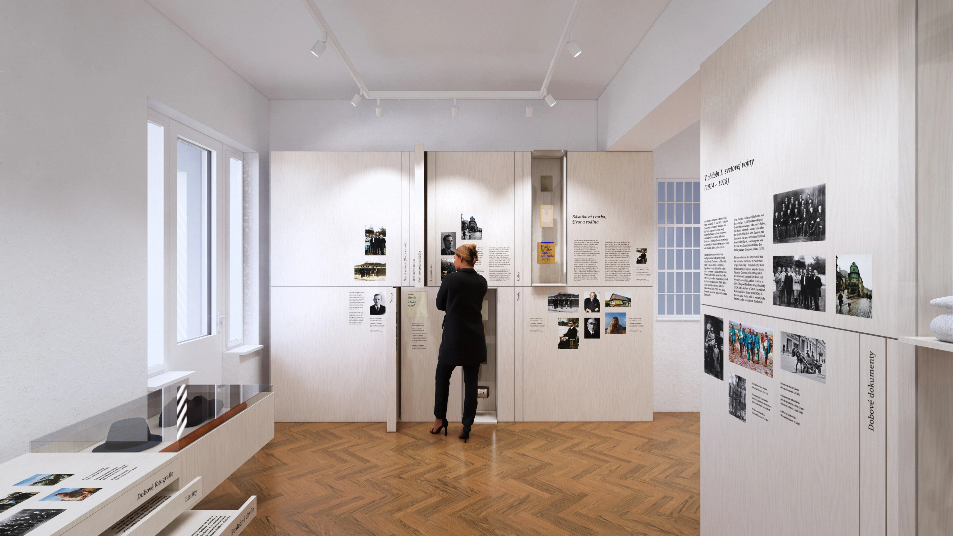 Ústredným objektom je pracovný stôl inšpirovaný ponkom, ktorý prechádza tromi miestnosťami. Vďaka výraznej farbe modrotlače sa stáva nielen výtvarným, ale aj priestorovým ťahákom expozície. Počas prehliadky stôl umožňuje prepnúť sa „zoom in“ od všeobecného k detailnému – zásuvky, vitríny, zvukové stopy, videá, mapping, interaktívne nasvietenie. Funkcia stola pokračuje aj v ďalších priestoroch cez predstenu a úložný systém. Doplnkové zóny ponúknu oddych s tabletmi pre ďalšie informácie ku každému exponátu.