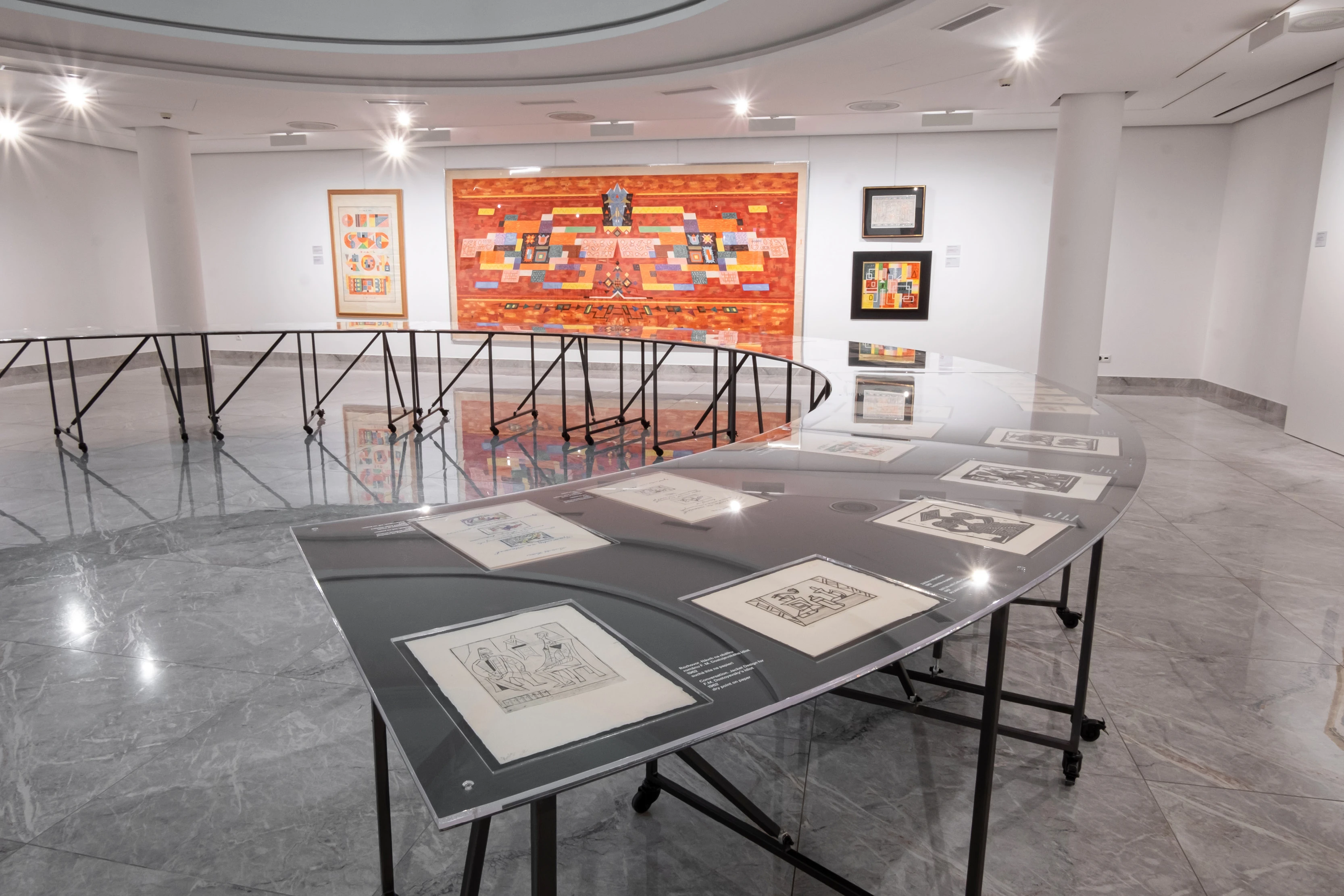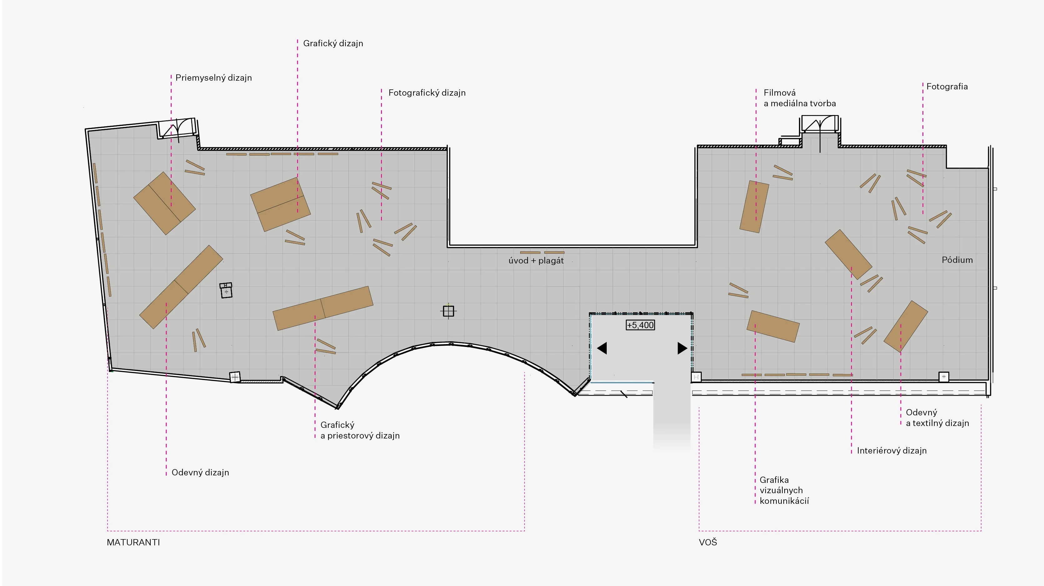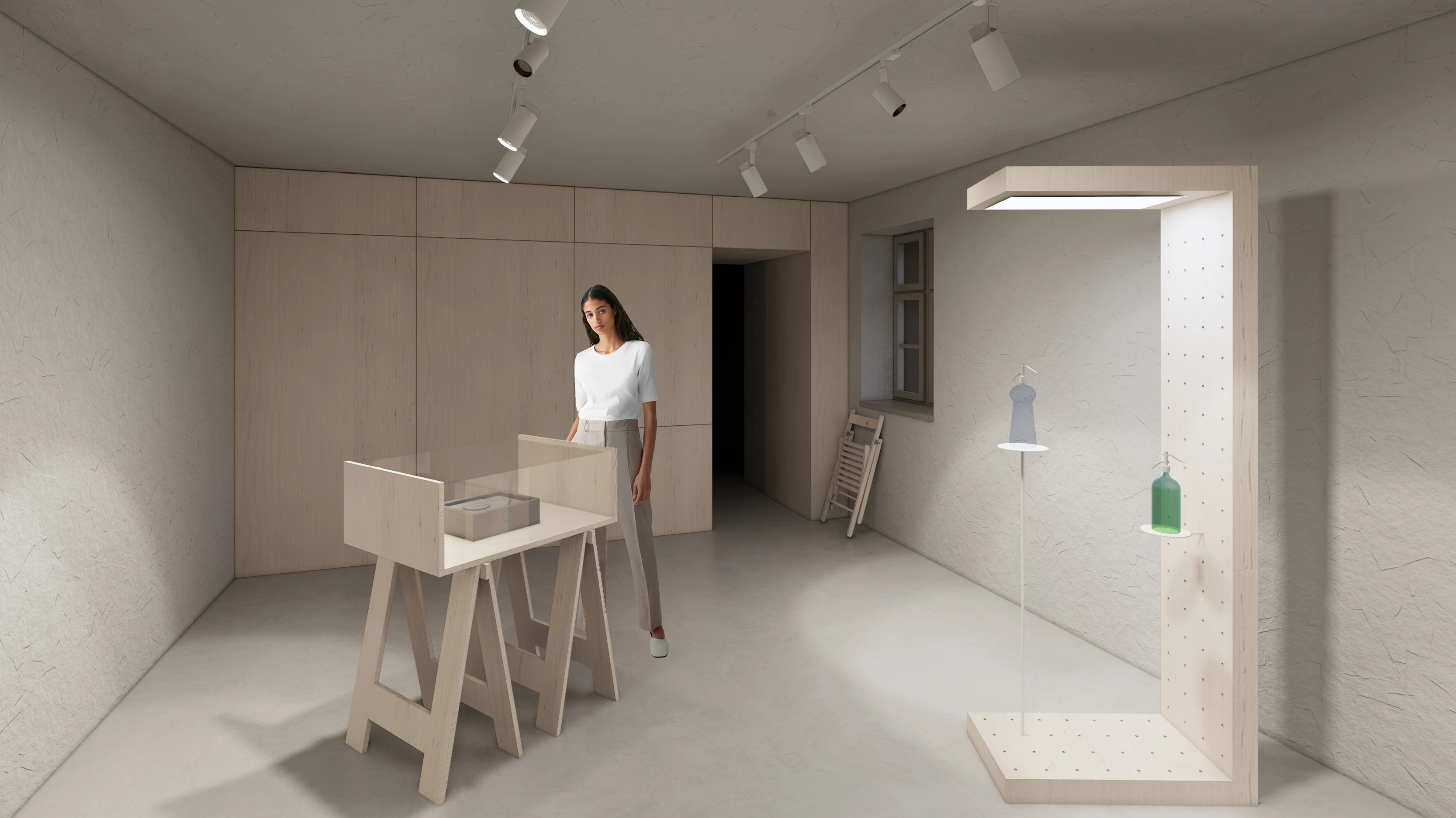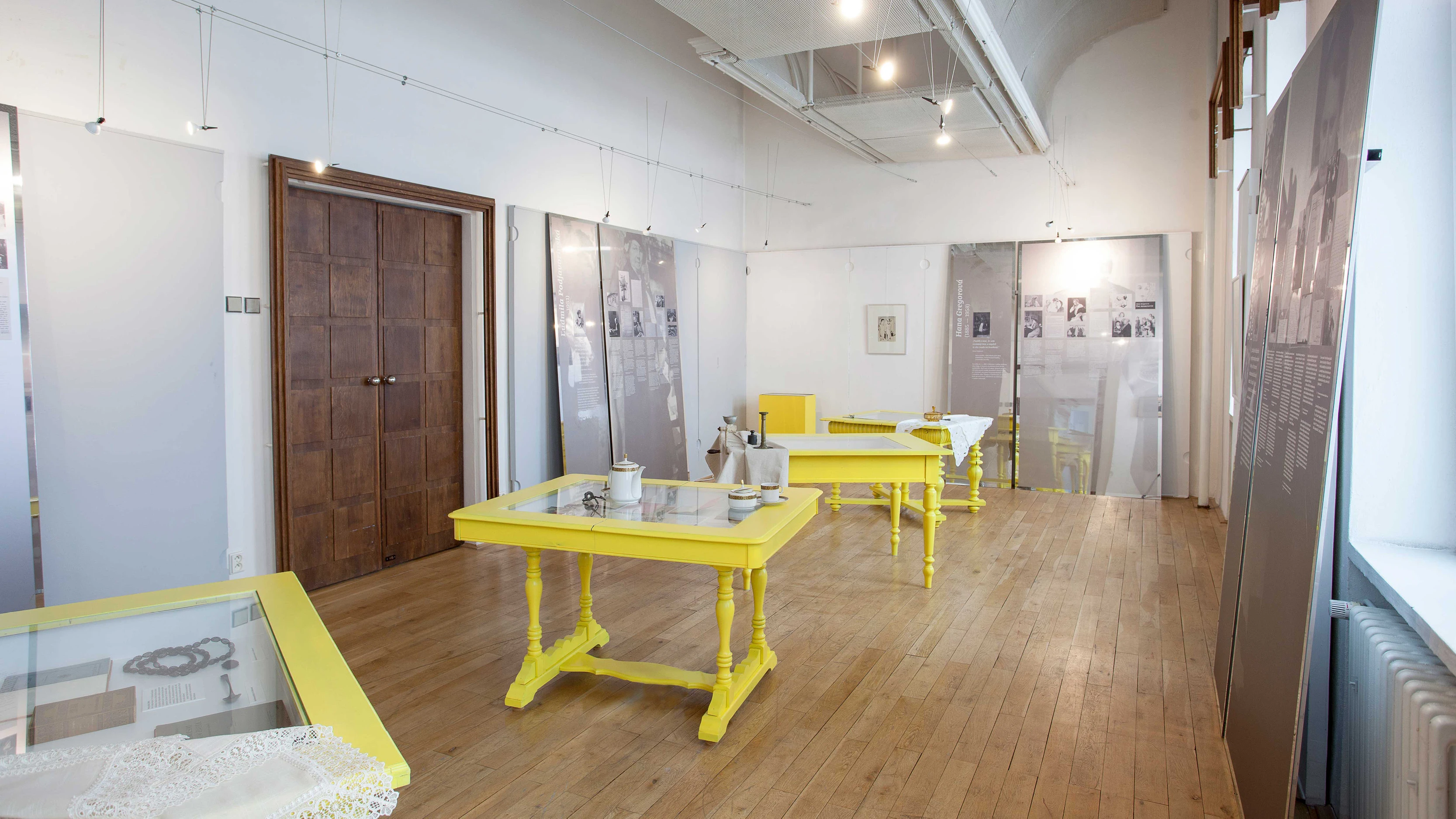 Ústredným objektom je pracovný stôl inšpirovaný ponkom, ktorý prechádza tromi miestnosťami. Vďaka výraznej farbe modrotlače sa stáva nielen výtvarným, ale aj priestorovým ťahákom expozície. Počas prehliadky stôl umožňuje prepnúť sa „zoom in“ od všeobecného k detailnému – zásuvky, vitríny, zvukové stopy, videá, mapping, interaktívne nasvietenie. Funkcia stola pokračuje aj v ďalších priestoroch cez predstenu a úložný systém. Doplnkové zóny ponúknu oddych s tabletmi pre ďalšie informácie ku každému exponátu.