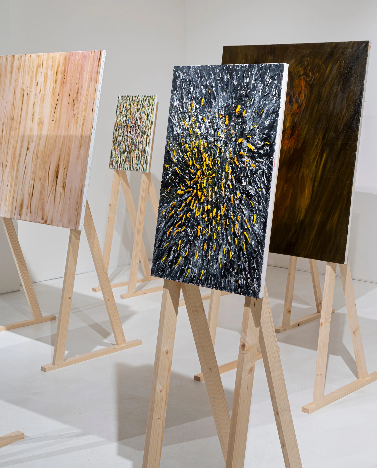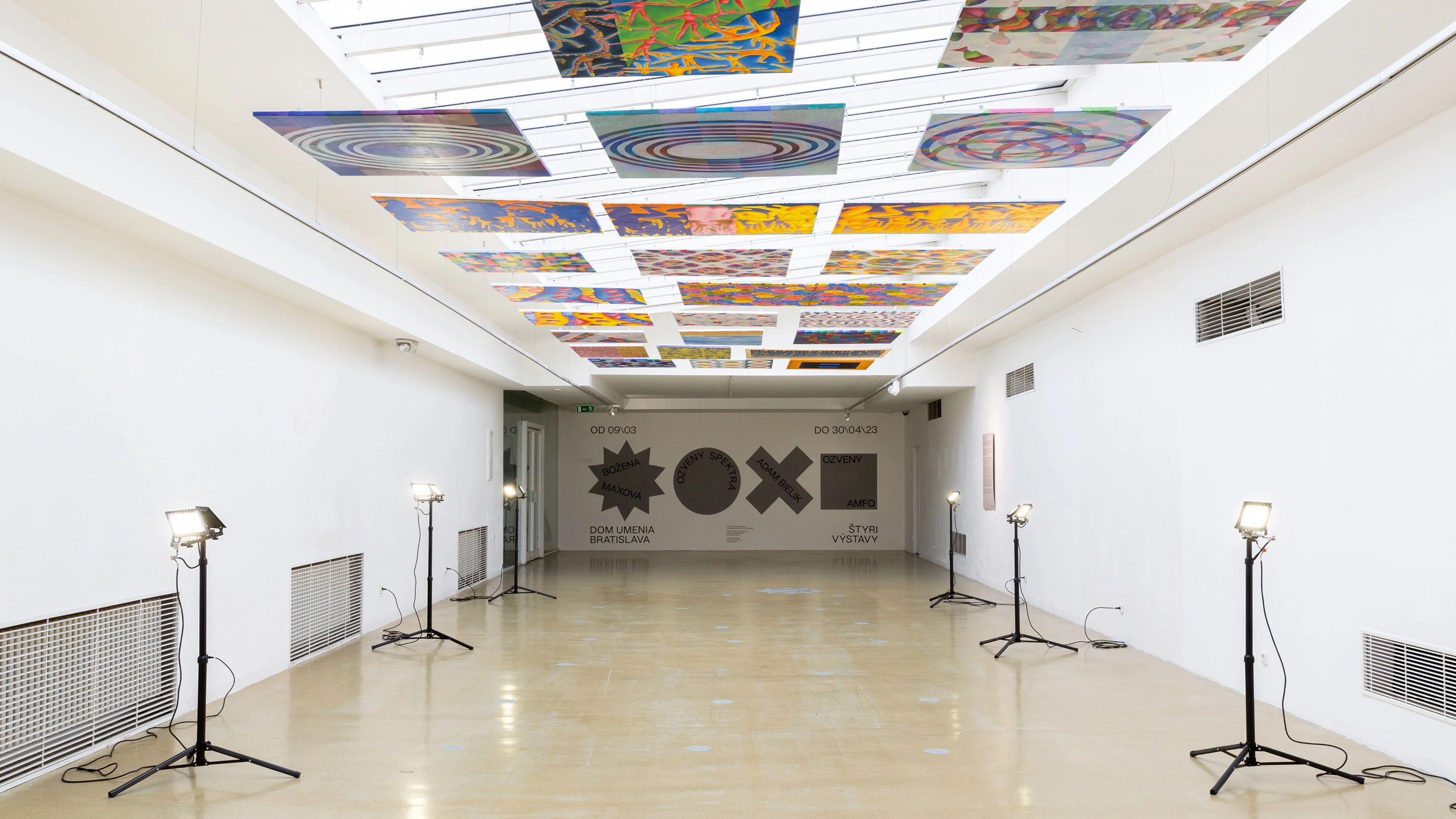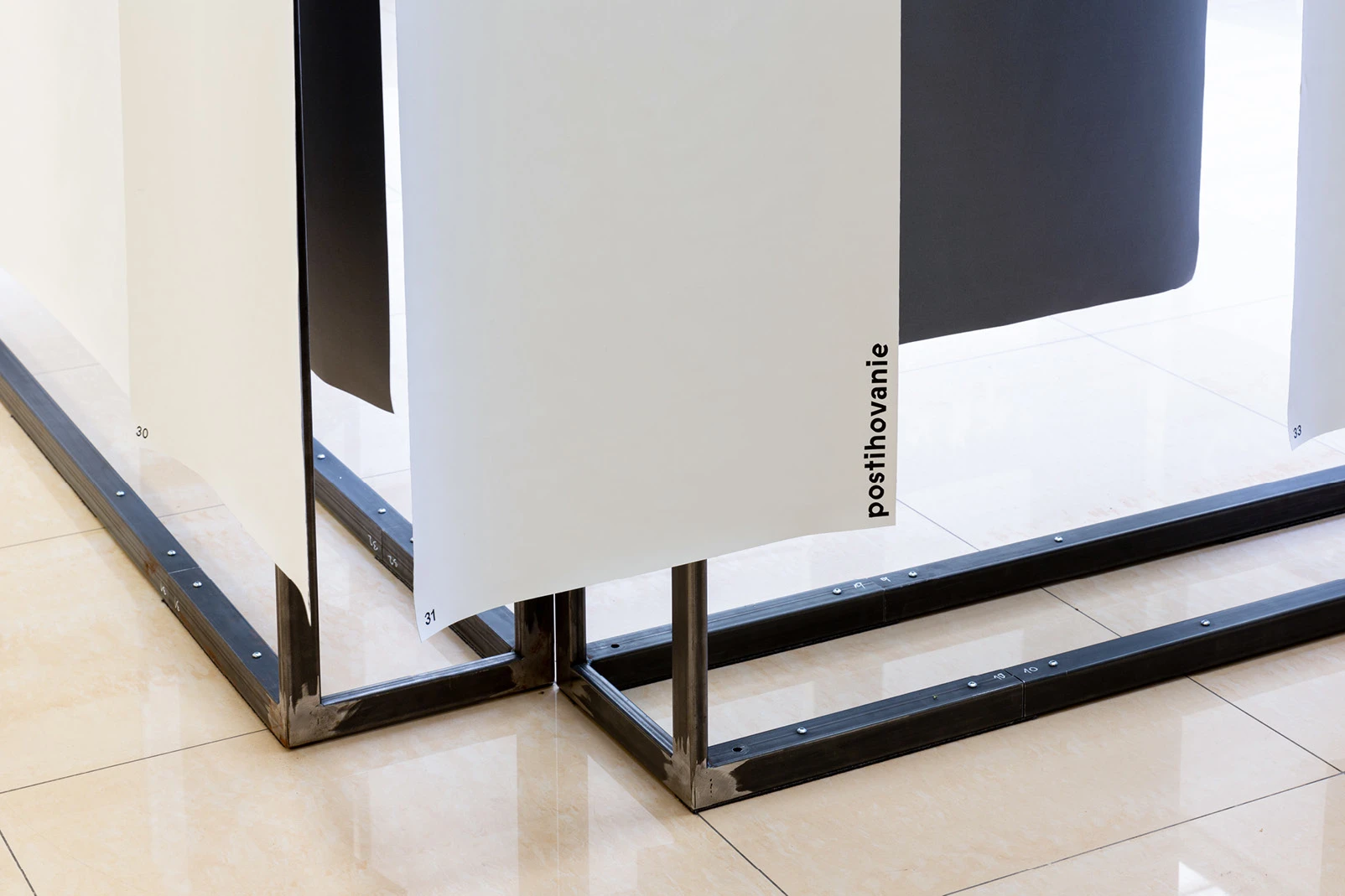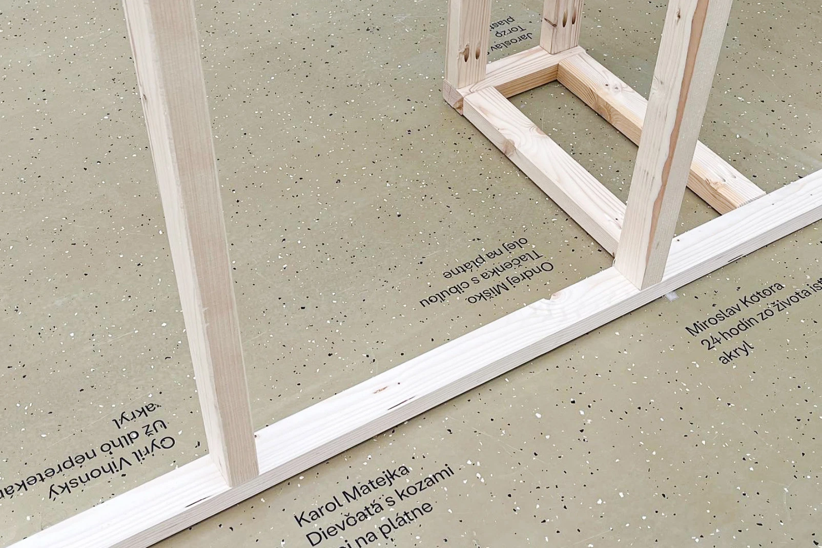 Výstava je komponovaná ako pole obrazov na samostatných drevených konštrukciách z hranolov. Maľby sú radené za sebou v jemne vychýlených líniách, čím vznikajú priehľady a napätie medzi dielami. Ich sklon a rozostavenie evokujú pohyb a ľahkosť, akoby reagovali na prúdenie vzduchu v priestore. Každé dielo má vlastný priestor, no zároveň prirodzene zapadá do celku. Jednoduché materiálové a konštrukčné riešenie necháva vyniknúť samotnej maľbe a vytvára prostredie pre sústredený, individuálny zážitok z inštalácie.