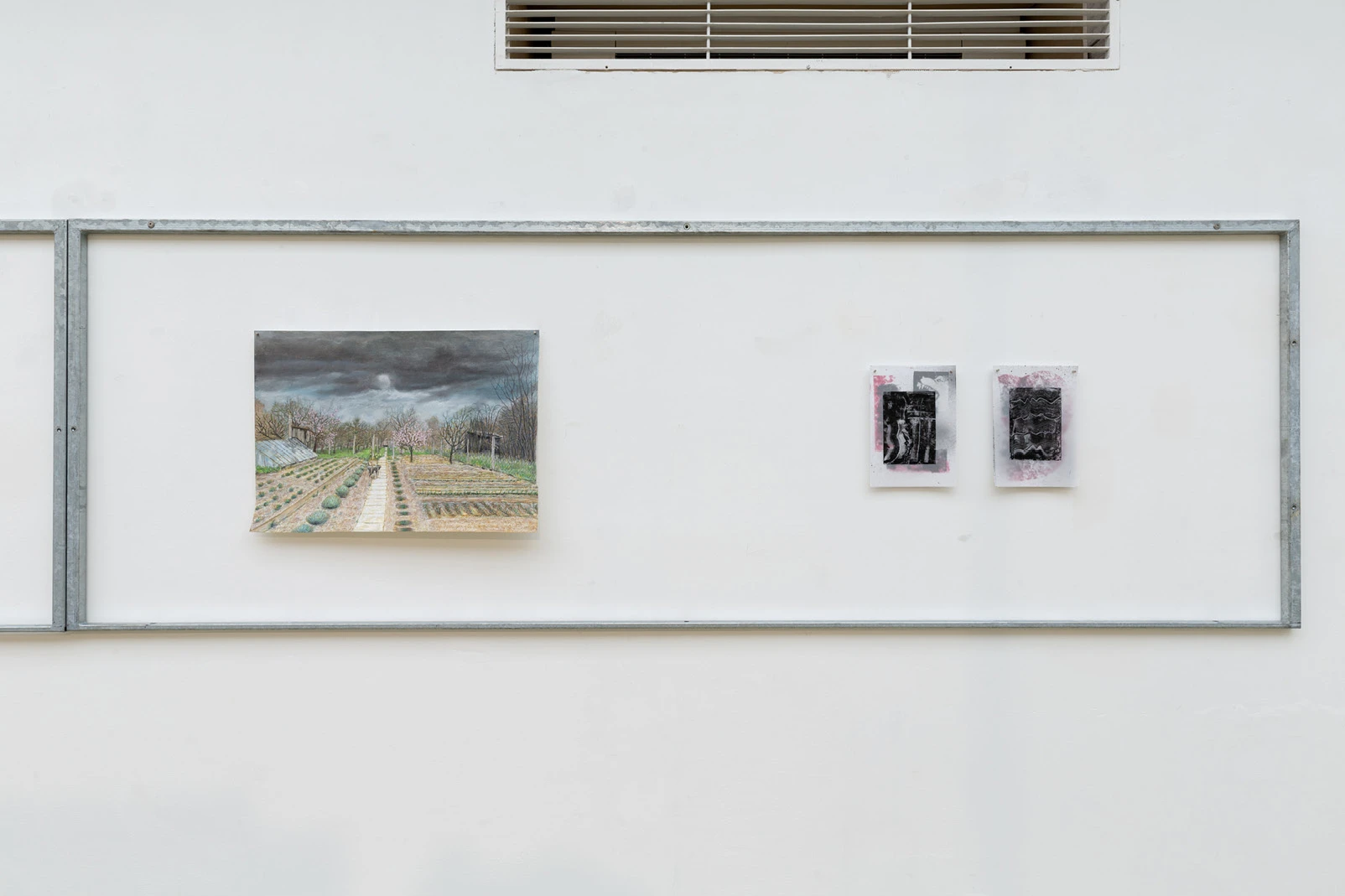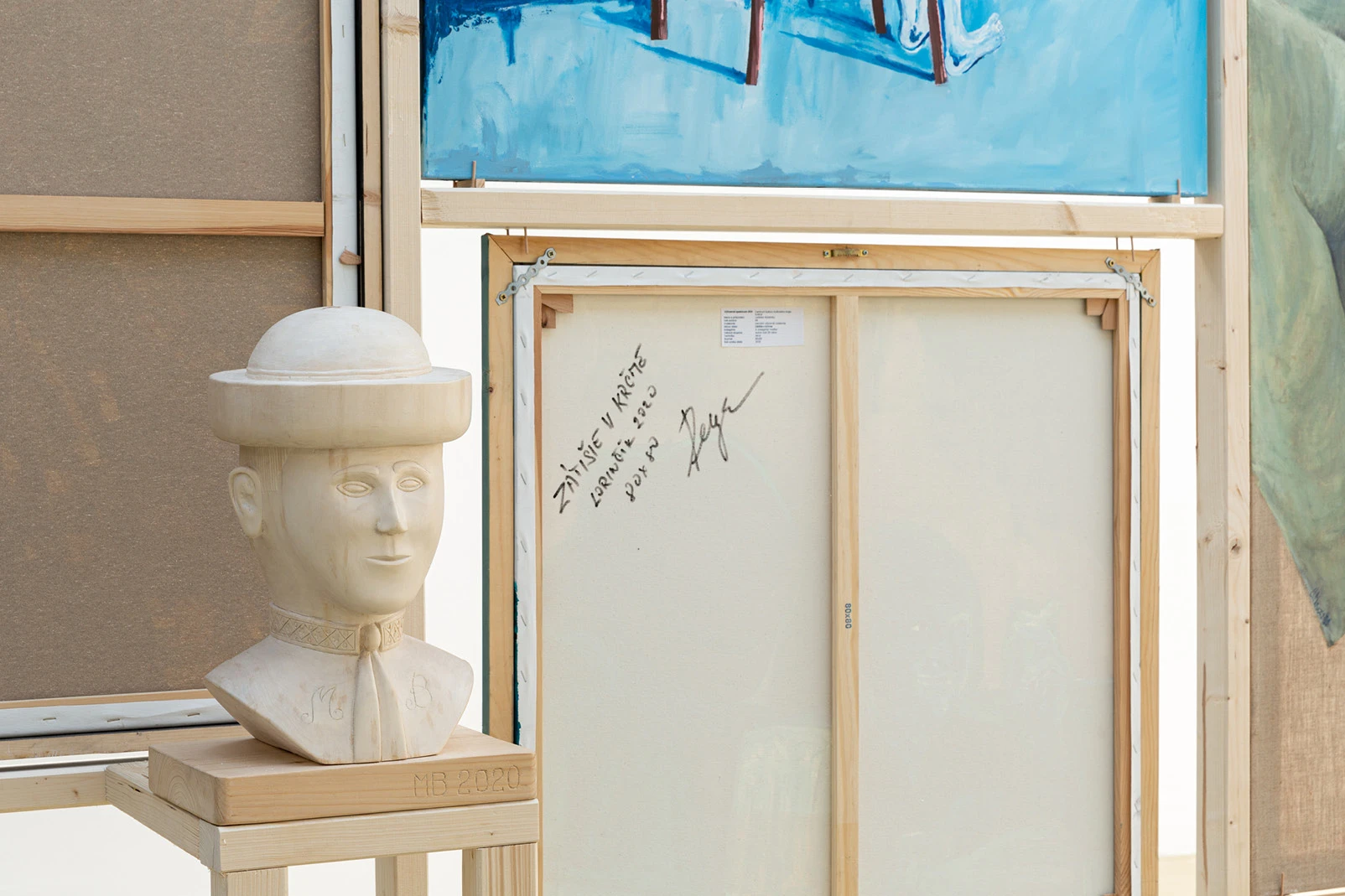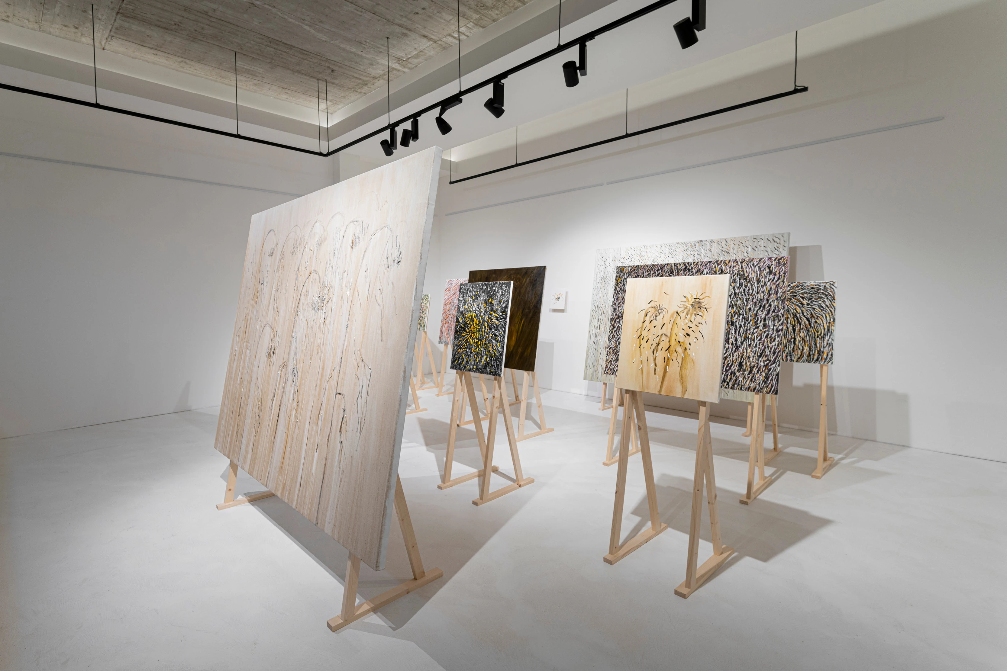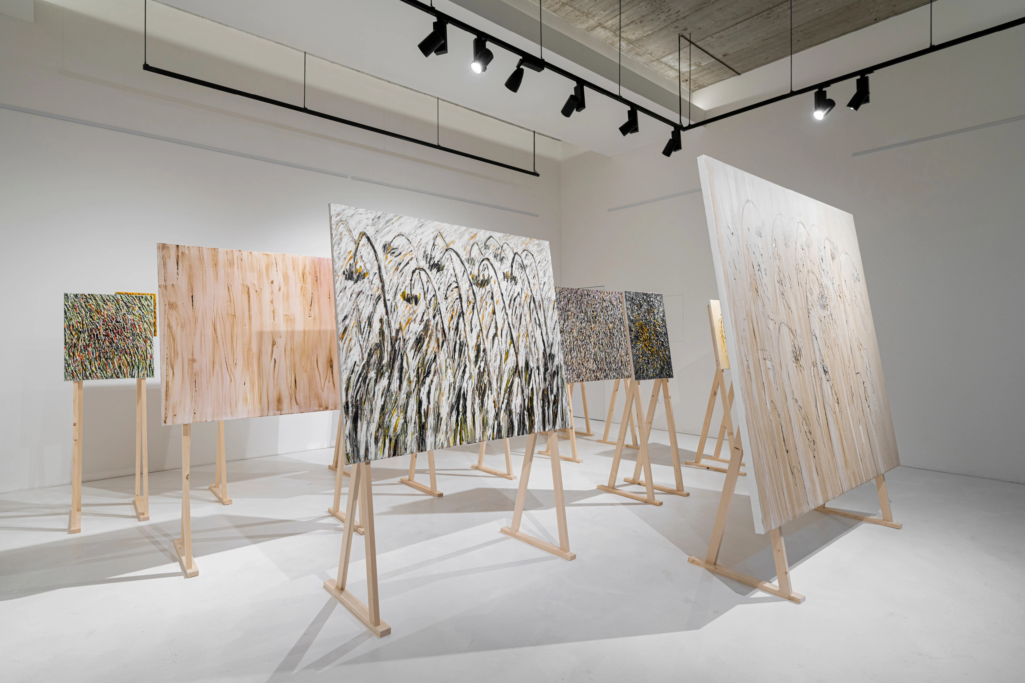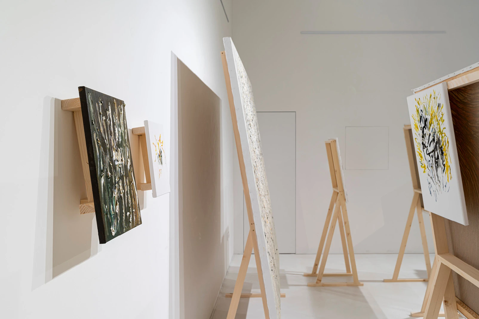 Výstava je komponovaná ako pole obrazov na samostatných drevených konštrukciách z hranolov. Maľby sú radené za sebou v jemne vychýlených líniách, čím vznikajú priehľady a napätie medzi dielami. Ich sklon a rozostavenie evokujú pohyb a ľahkosť, akoby reagovali na prúdenie vzduchu v priestore. Každé dielo má vlastný priestor, no zároveň prirodzene zapadá do celku. Jednoduché materiálové a konštrukčné riešenie necháva vyniknúť samotnej maľbe a vytvára prostredie pre sústredený, individuálny zážitok z inštalácie.