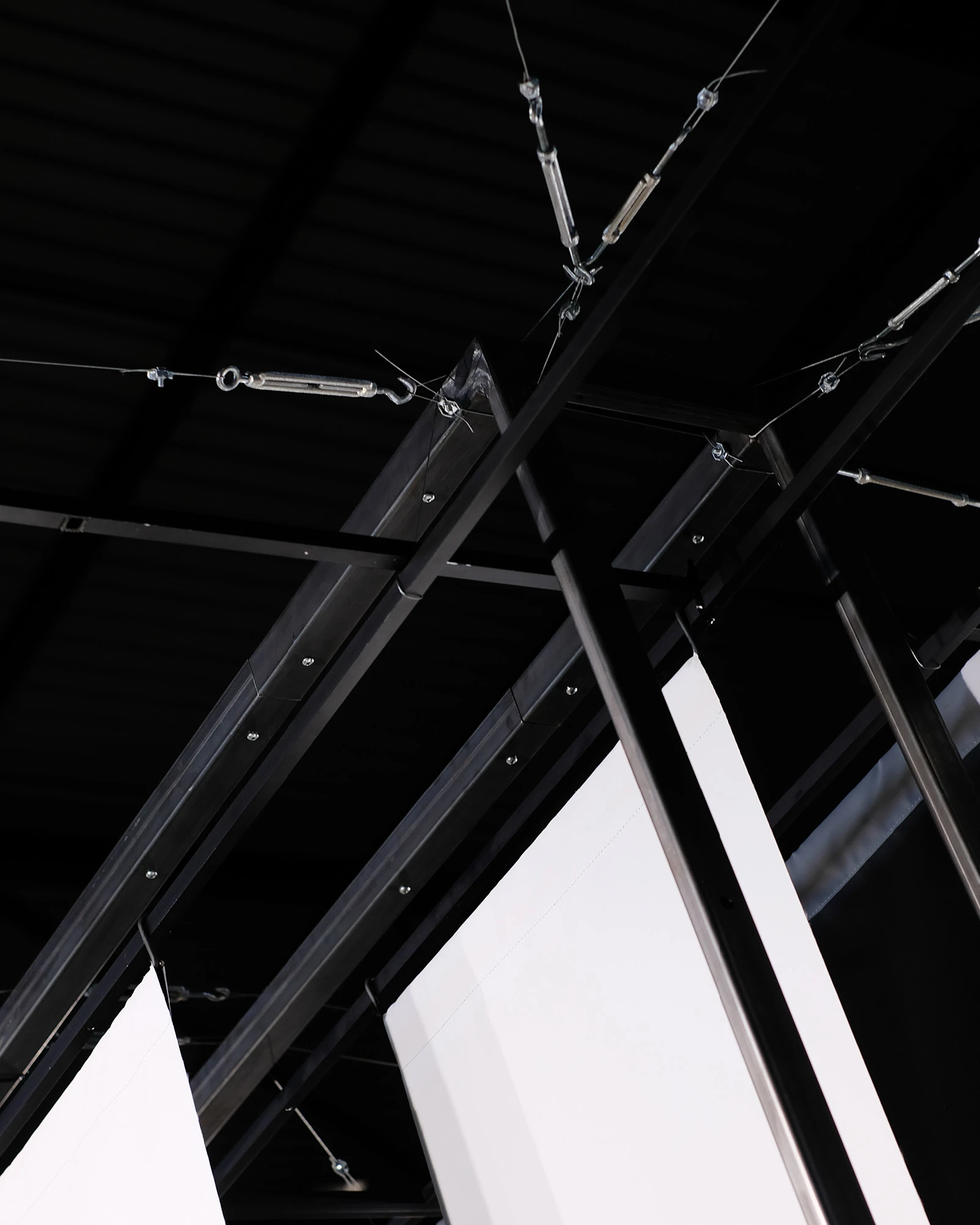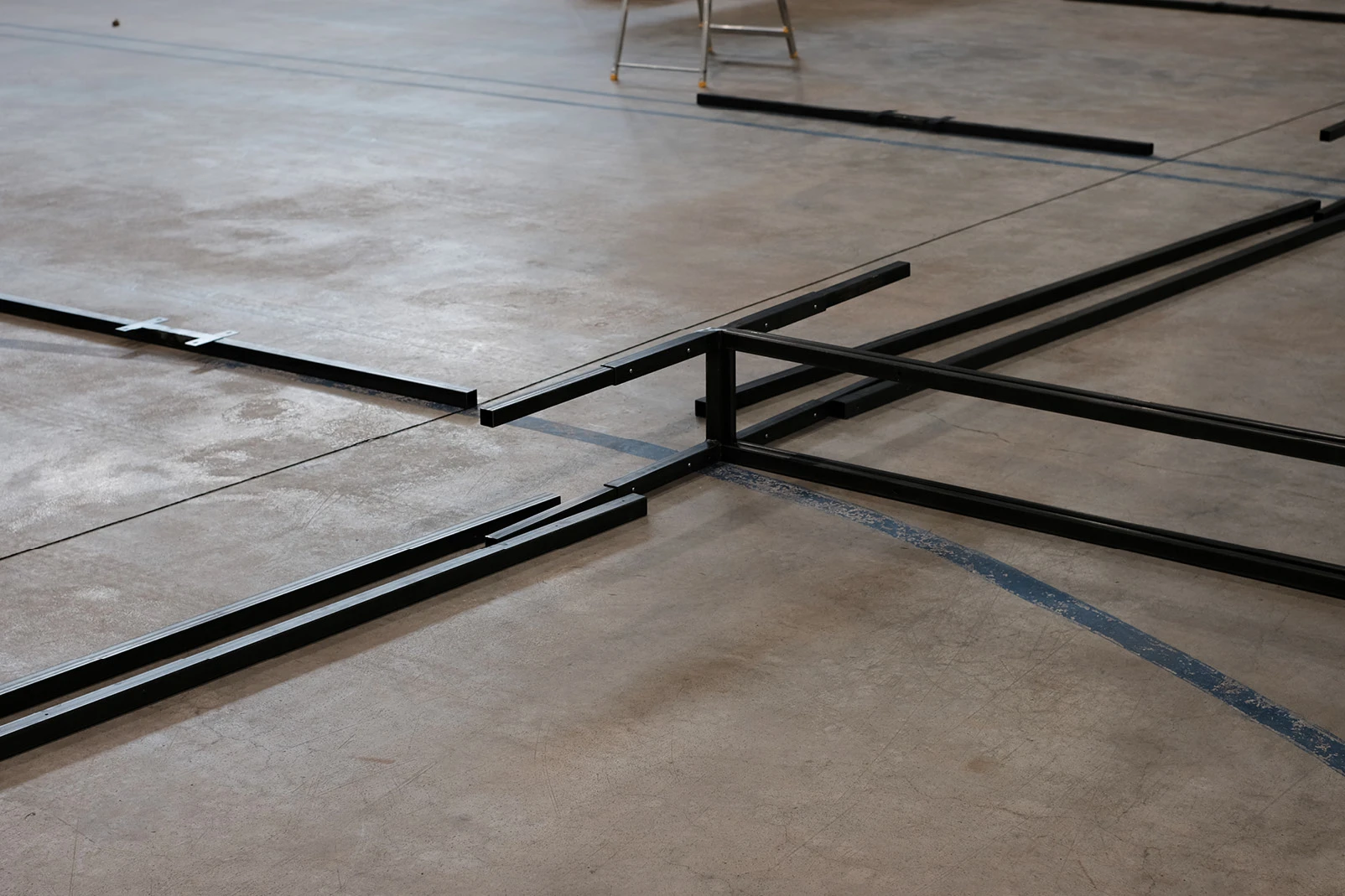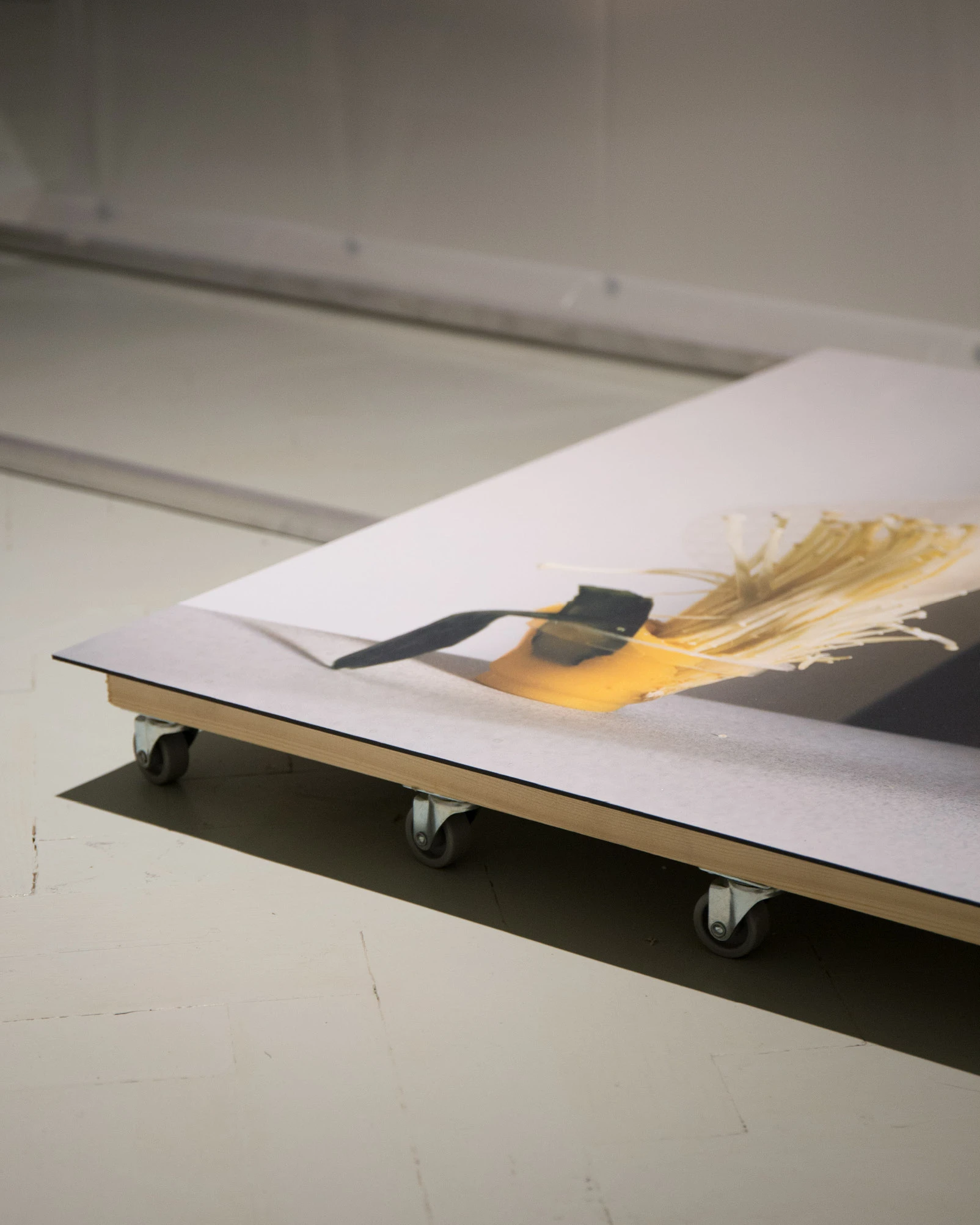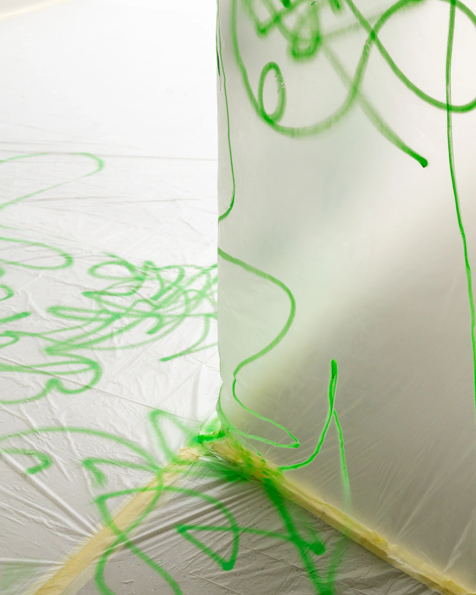 Výstava je komponovaná ako pole obrazov na samostatných drevených konštrukciách z hranolov. Maľby sú radené za sebou v jemne vychýlených líniách, čím vznikajú priehľady a napätie medzi dielami. Ich sklon a rozostavenie evokujú pohyb a ľahkosť, akoby reagovali na prúdenie vzduchu v priestore. Každé dielo má vlastný priestor, no zároveň prirodzene zapadá do celku. Jednoduché materiálové a konštrukčné riešenie necháva vyniknúť samotnej maľbe a vytvára prostredie pre sústredený, individuálny zážitok z inštalácie.
