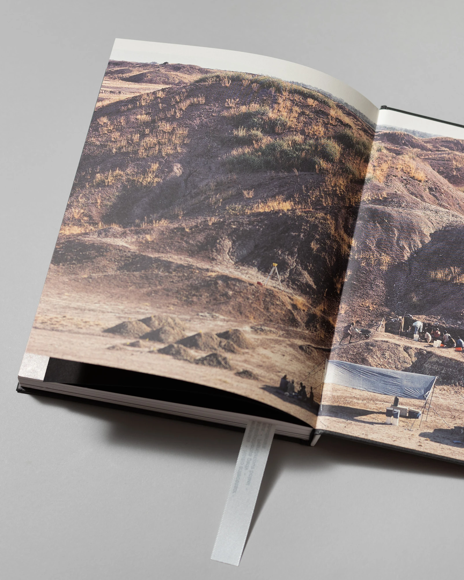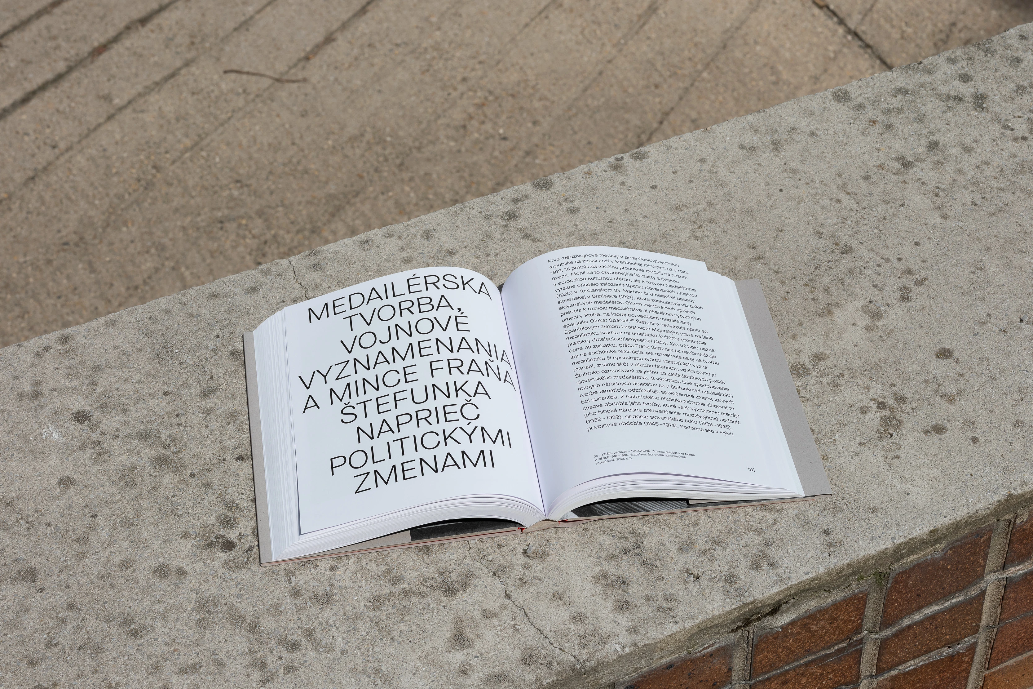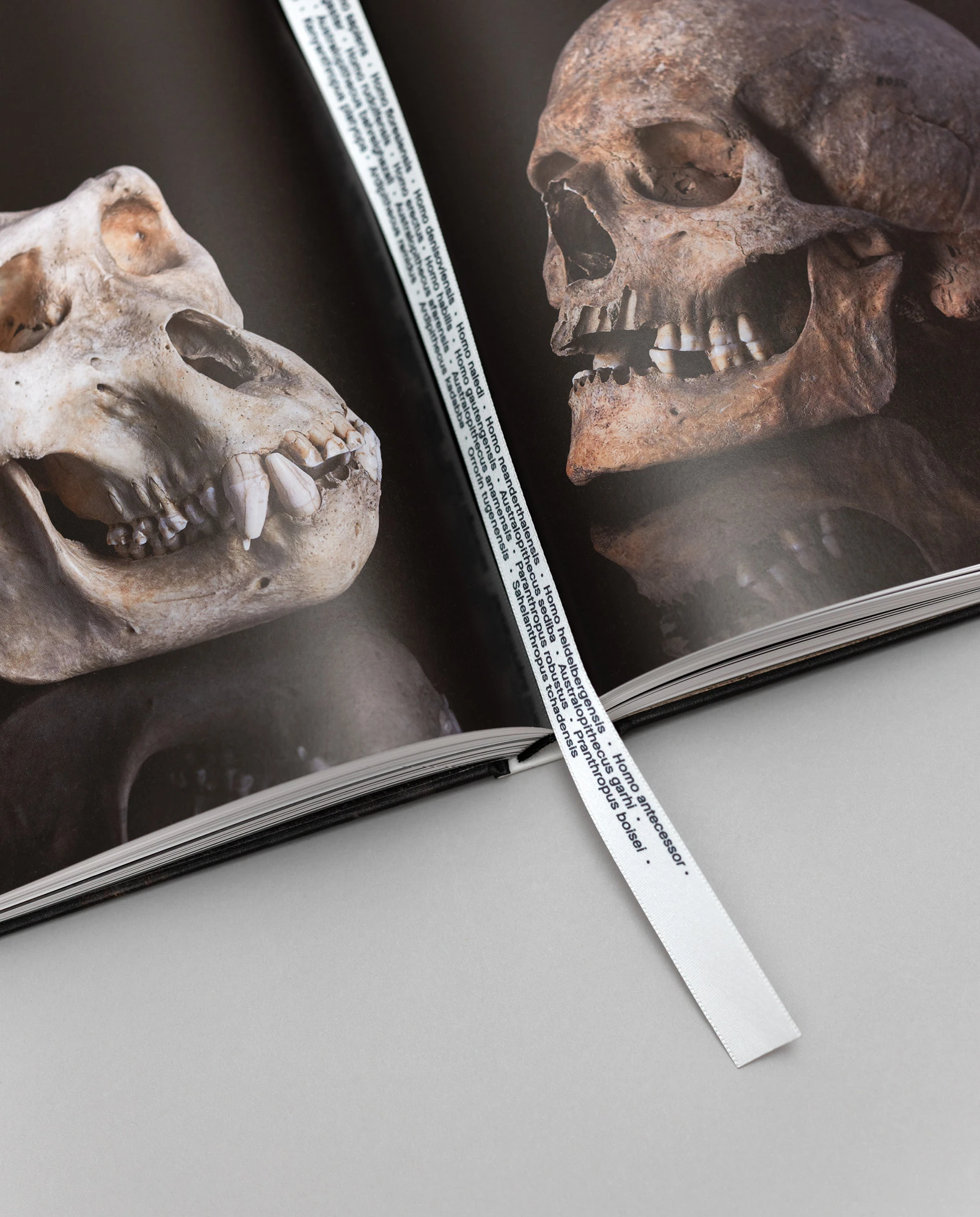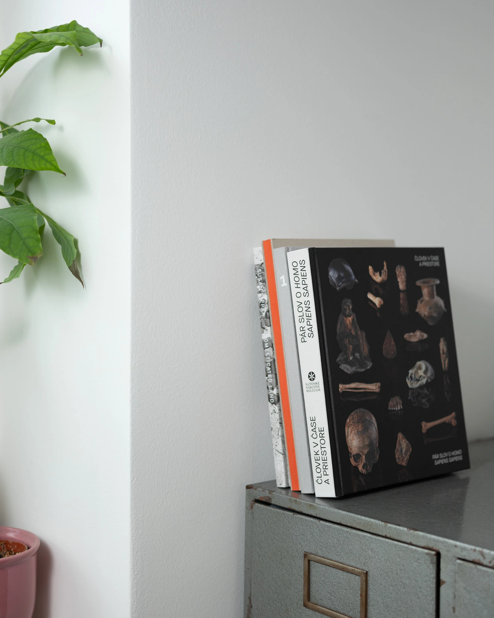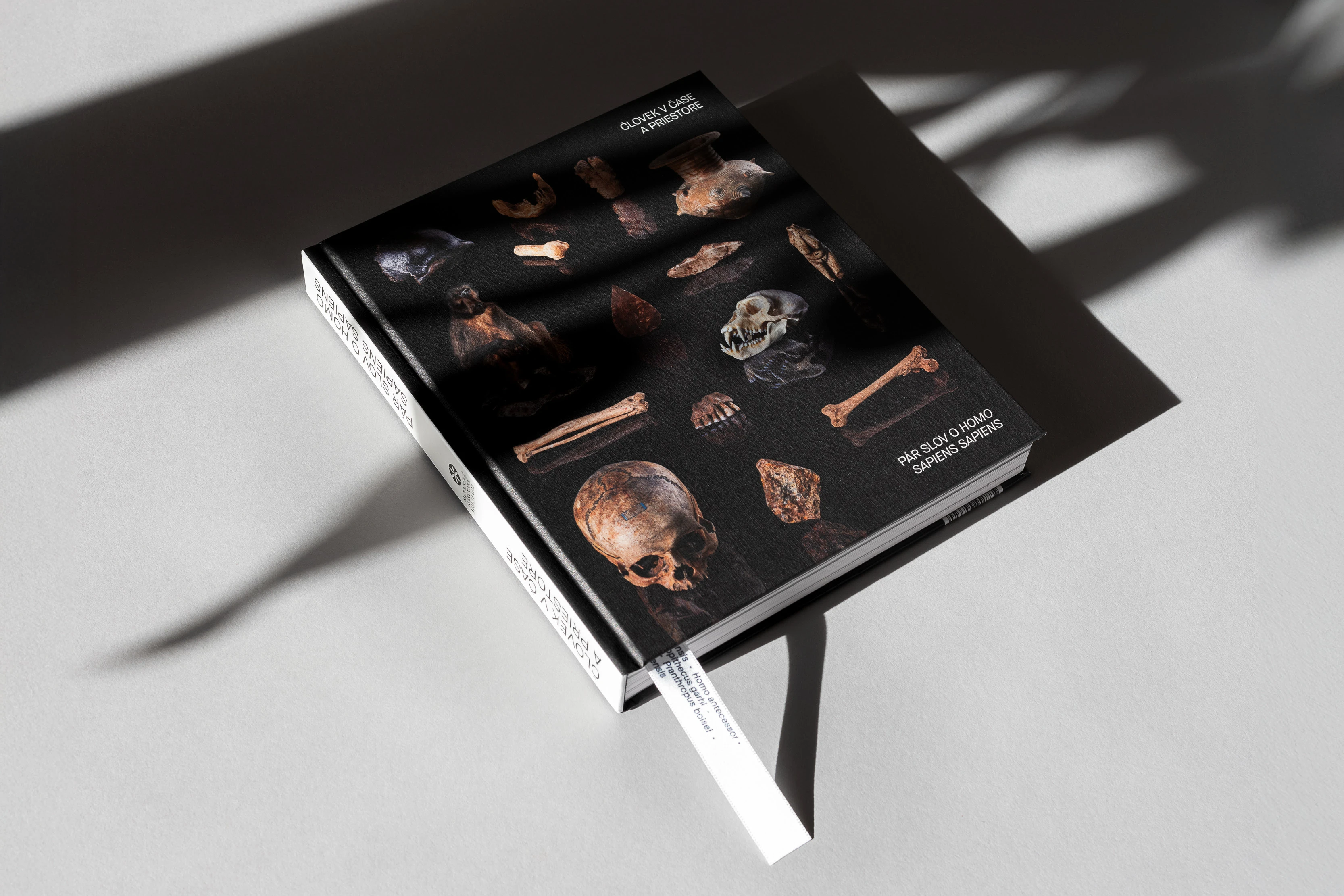 Dizajn publikácie k expozící Človek v čase a priestore. Publikácia vizuálne nadväzuje na expozíciu kontrastom bielych a čiernych plôch, pričom svietiaca obálka a vzdušný layout podporujú jej súčasný charakter.
