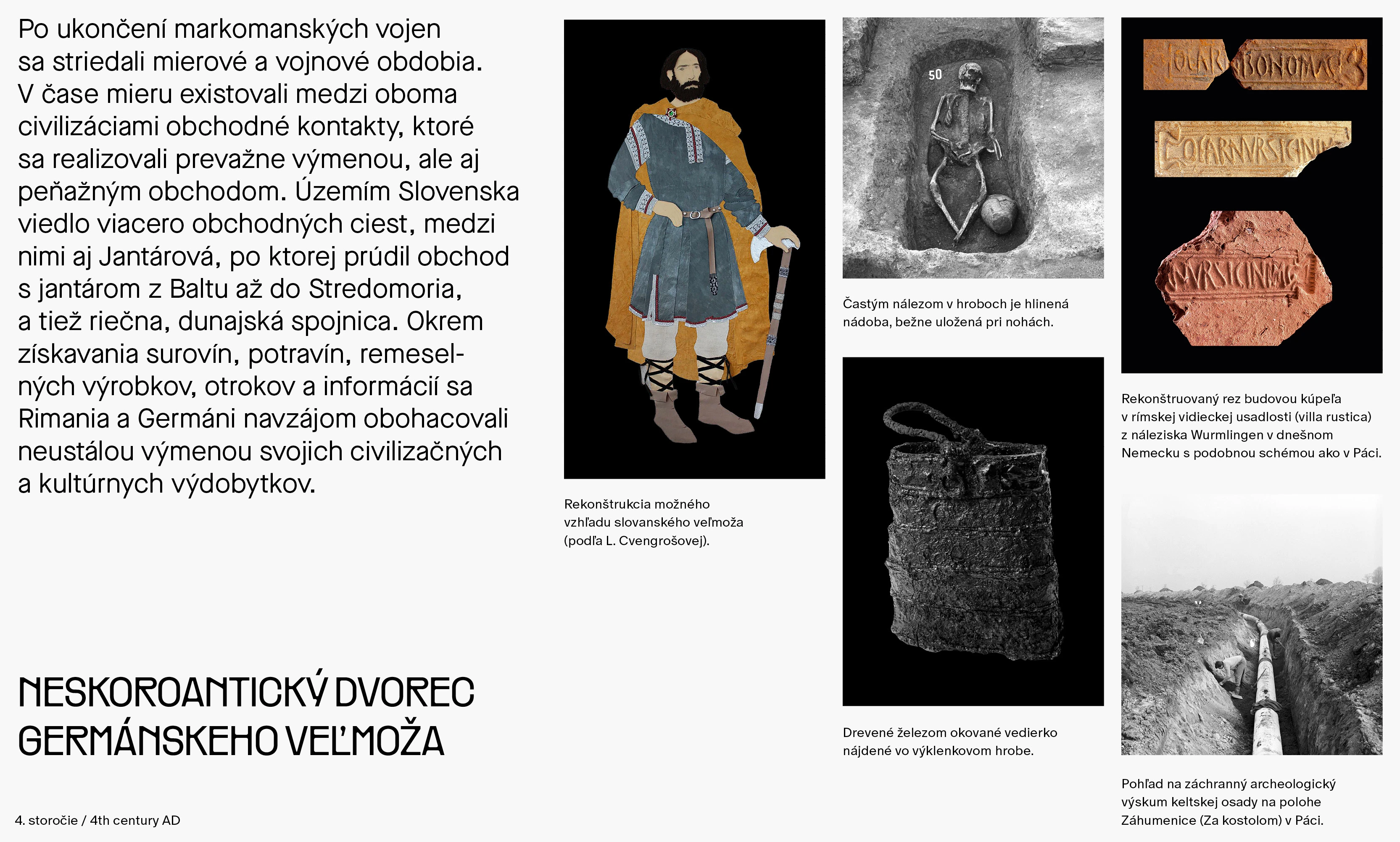 Architektúra a vizuál prezentujú stret rímskej a germánskej kultúry prostredníctvom výstavy na Bratislavskom hrade. Výstavný mobiliár v podobe transportných debien odkazuje na dočasnosť expozície a zbierkový charakter exponátov.