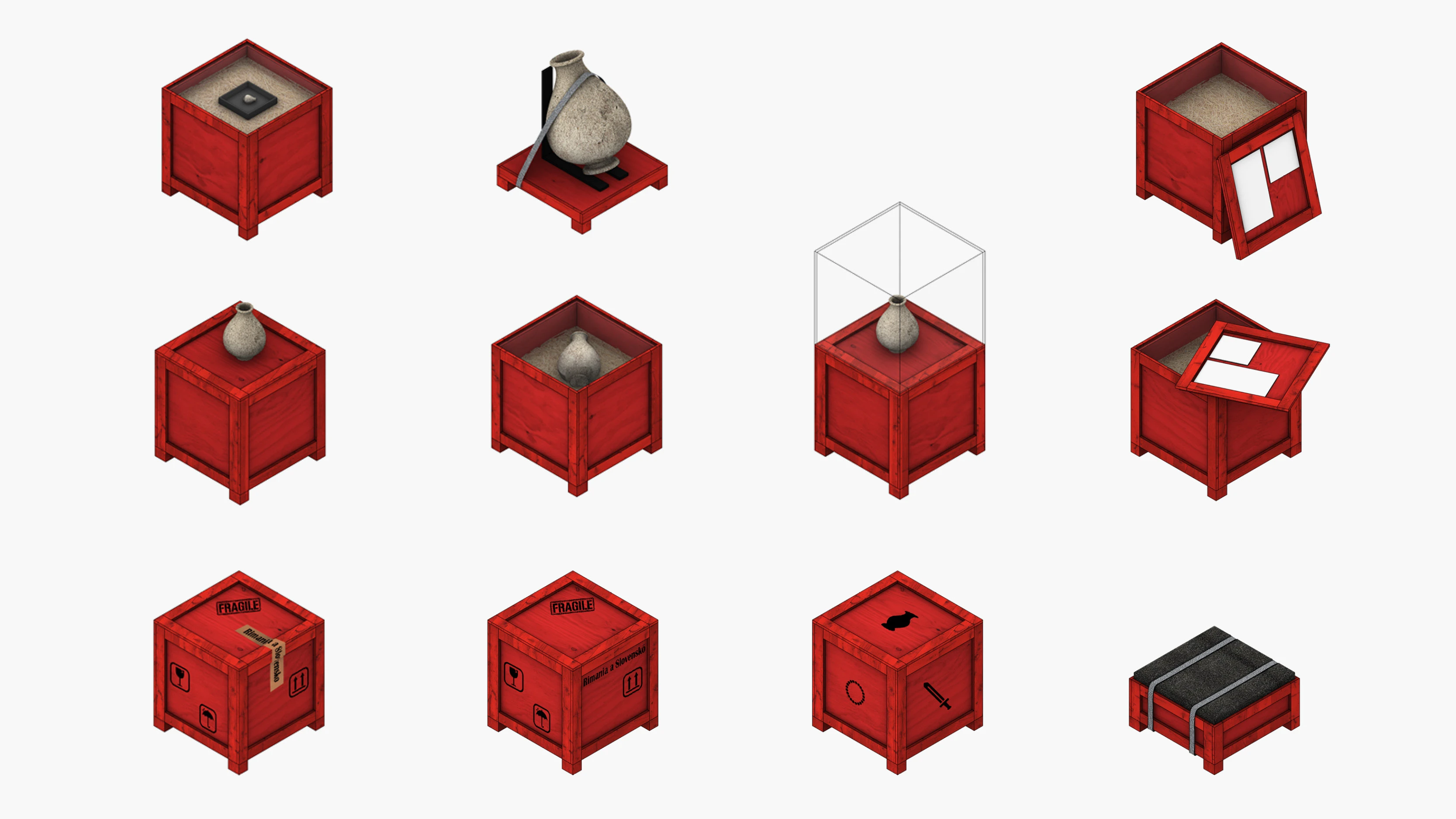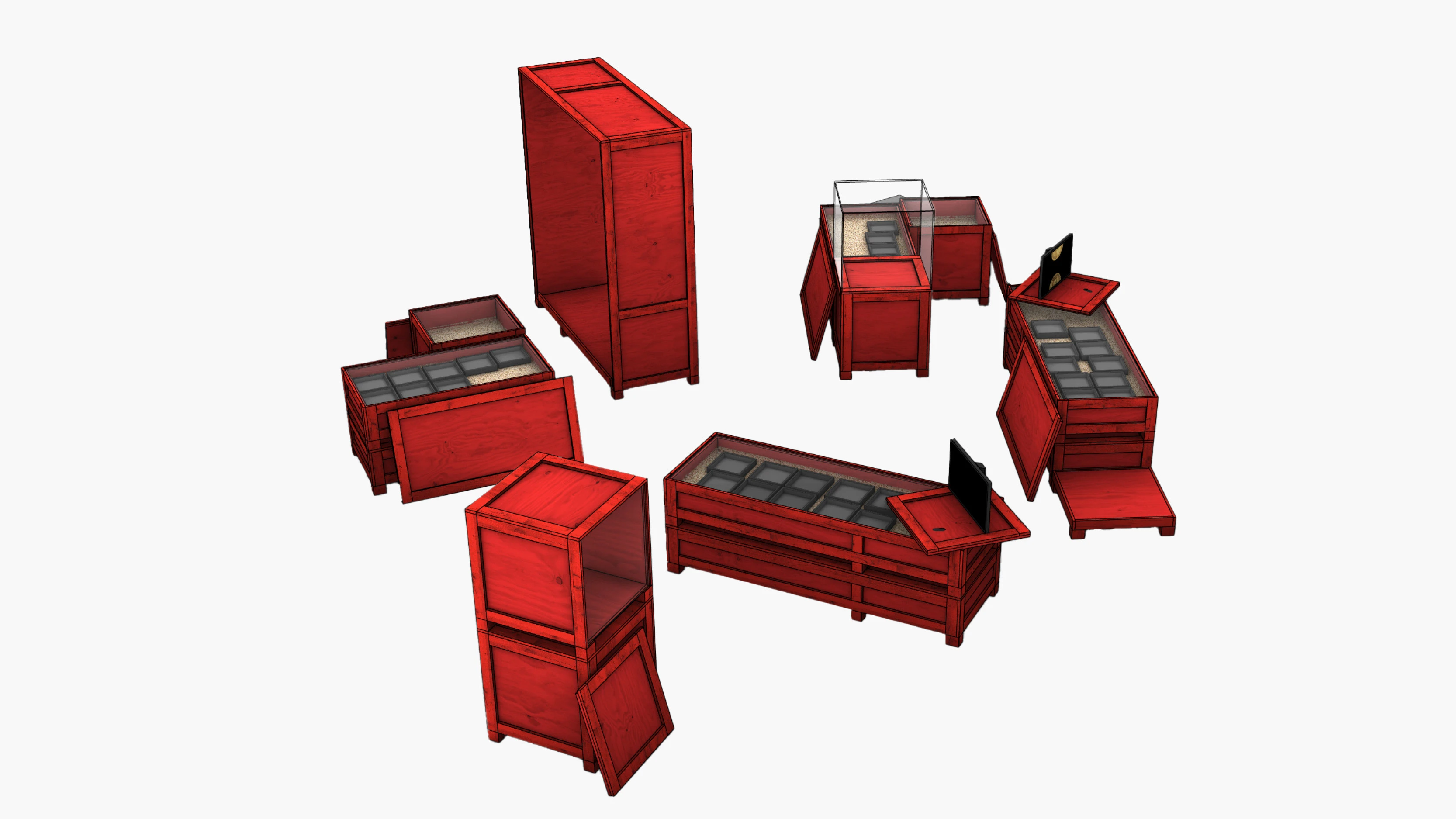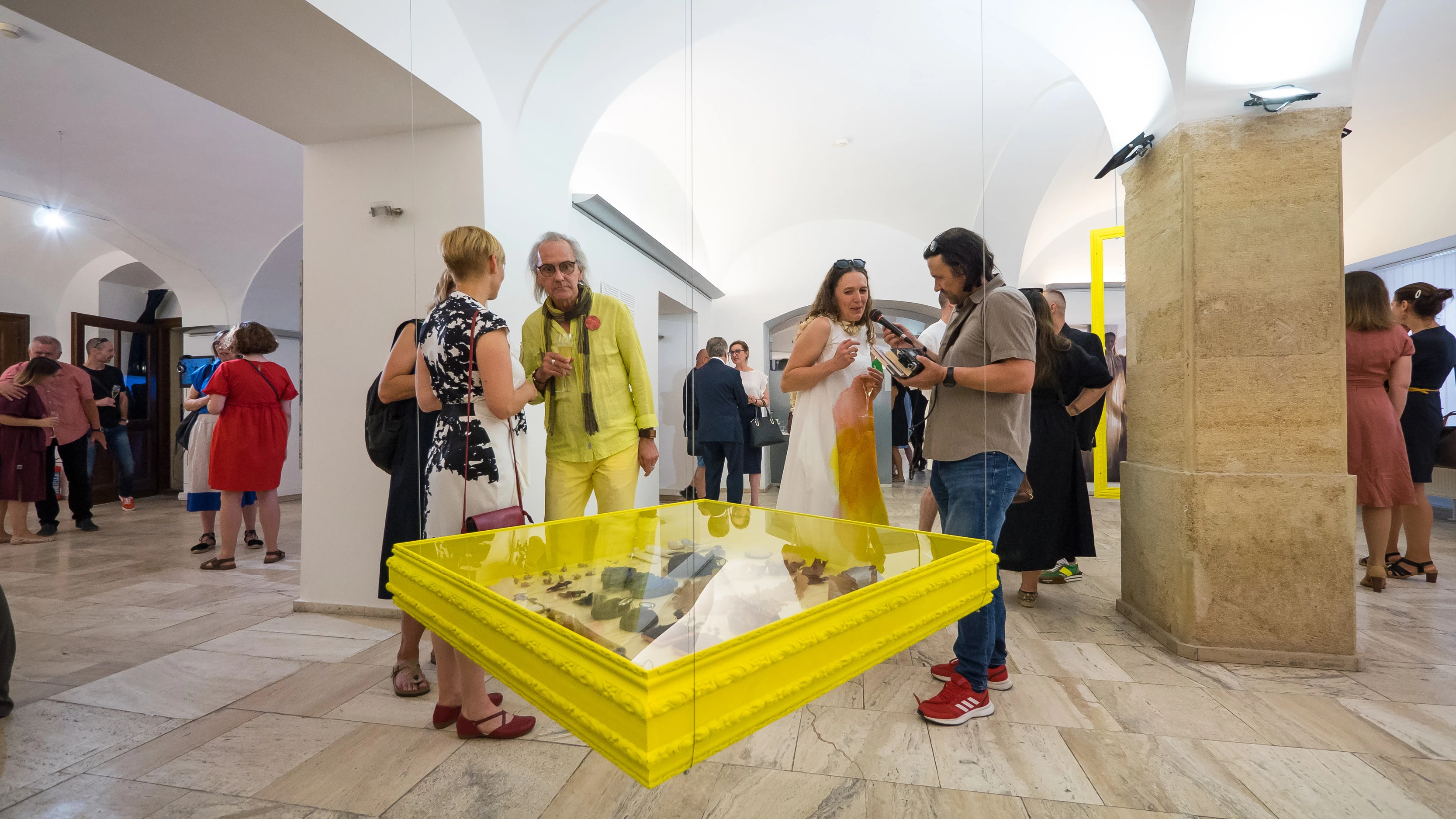 Architektúra výstavy pracuje s motívom transportných debien, ktoré sa po otvorení premieňajú na výstavný mobiliár. Ich robustná konštrukcia, jednotný materiál a sýty odtieň červenej vytvárajú výraznú vizuálnu vrstvu, ktorá kontrastuje s kamennou architektúrou priestoru. Kompozícia pôsobí na prvý pohľad náhodne, no každý objekt má presne určené miesto. Výstavný jazyk tak evokuje dočasnosť, pohyb a neustálu premenu – akoby výstava práve dorazila, otvorila sa a kedykoľvek sa mohla znova zbaliť.