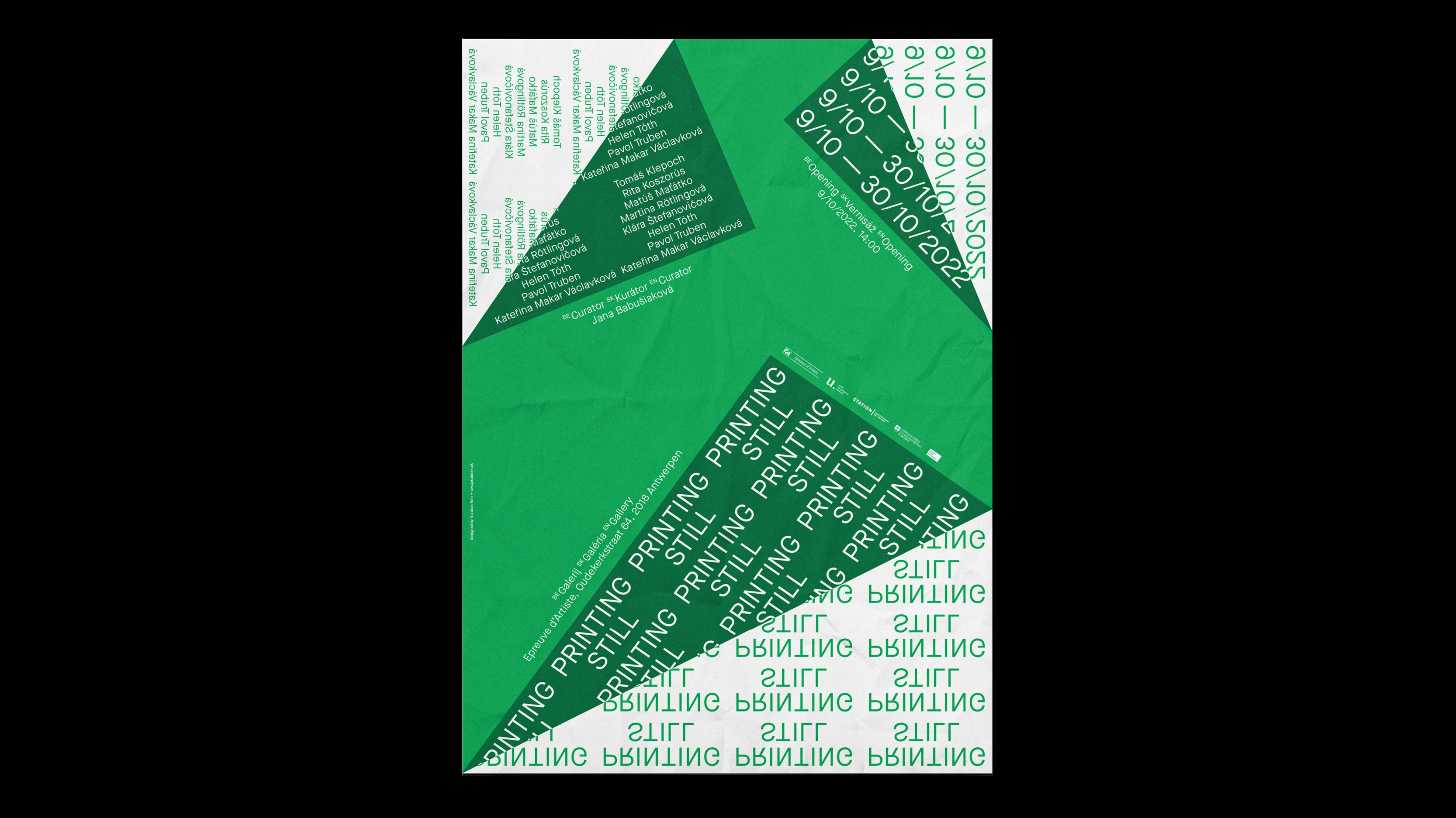 Výstavnú architektúru definuje výrazná zelená farba ktorá sa objavuje v rôznych materiáloch ako povrch stien textilné panely alebo papier a vytvára kontrastné pozadie k prevažne chromatickým dielam. Prvá časť výstavy pracuje s textilnými stenami medzi ktorými sú voľne inštalované objekty zavesené alebo položené. Nasleduje sekcia s radom panelov zoradených za sebou pričom každý ukrýva inú formu prezentácie ako je lupa zrkadlo malý detail alebo veľká fotografia. Posledná časť je definovaná stenou pred ktorou sú predsadené fotografie. Grafika výstavy využíva rovnakú zelenú a pomocou bieleho rastra a šumu vizuálne zjednocuje jednotlivé diela.