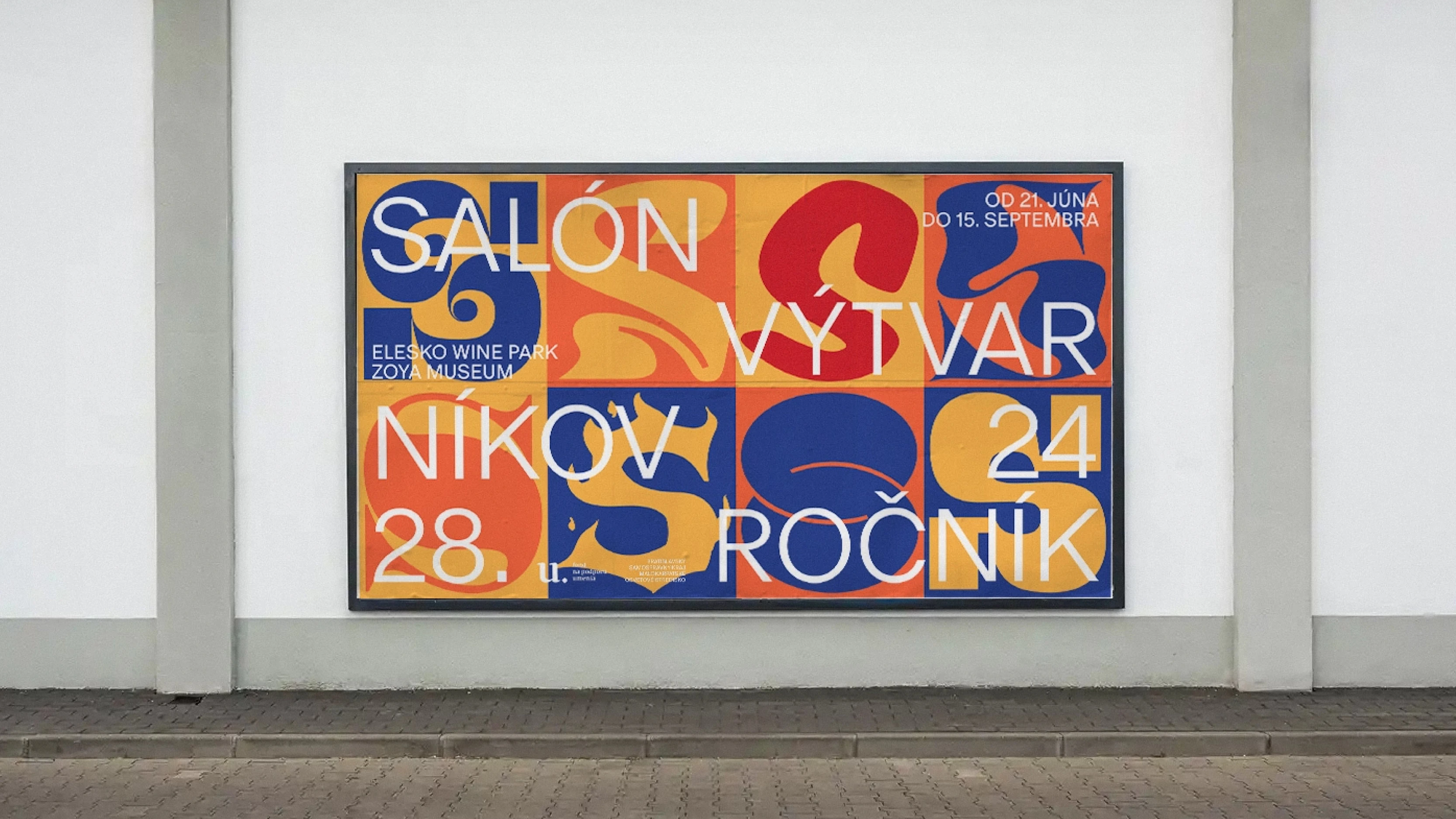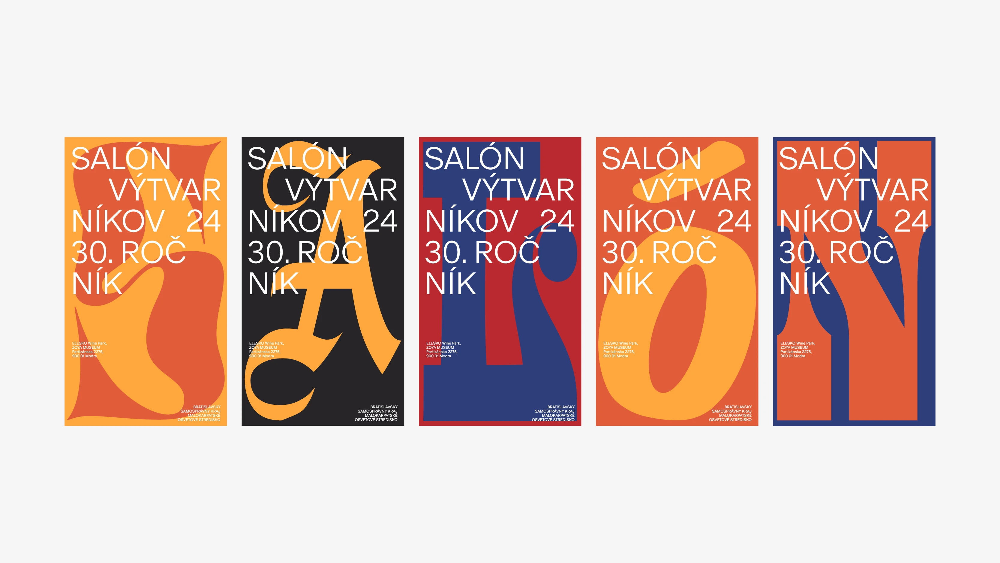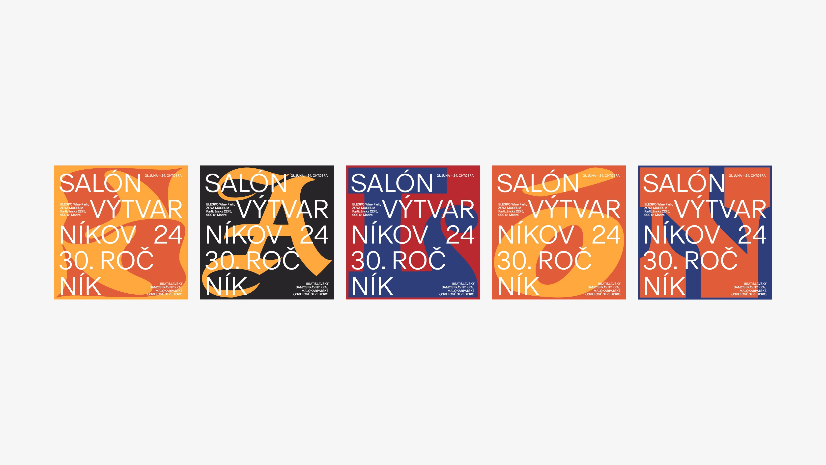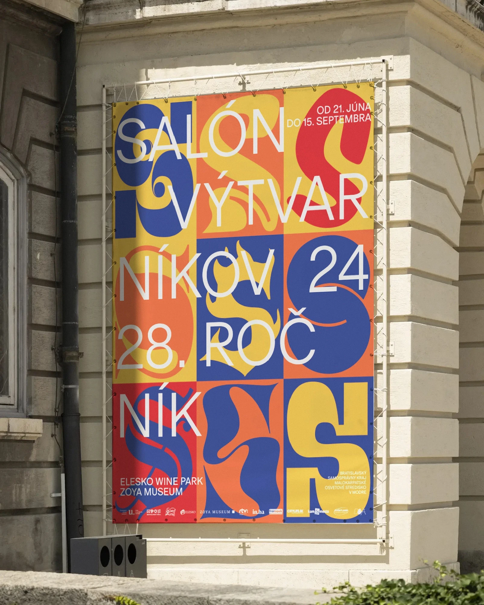 Vizuál Salónu výtvarníkov funguje ako modulárny dizajnový systém pre rôzne formáty – plagáty, bannery aj sociálne médiá – ktoré sa prispôsobujú šírke, výške i štvorcovému priestoru. Hlavná grafická metafora kombinuje farebné bloky a ornamentálne vzory, ktoré reprezentujú rozmanitosť použitých médií – maľbu, sochu, fotografiu, textil. Vedľa nich je použitá čistá minimalistická typografia, ktorá nesie informačnú rovinu prehľadne a profesionálne – kontrastným spojením umeleckého chaosu a racionálnej komunikácie podporuje jednotnú a modernú identitu multižánrového podujatia.